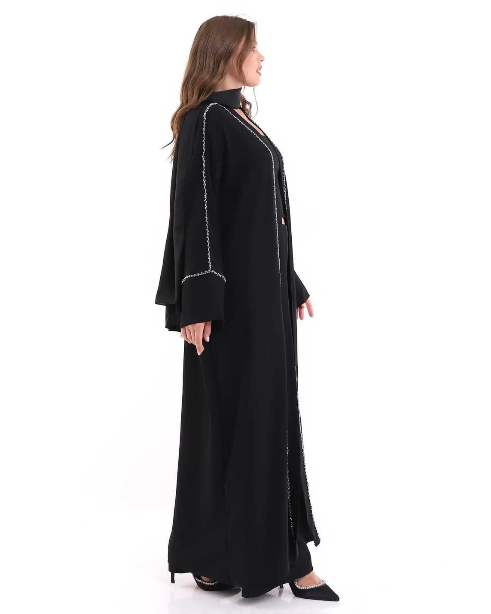 A timeless expression of refined elegance, this abaya is crafted from luxurious crepe and adorned with delicately hand-applied crystal detailing. The design features silver and black beaded accents that trace the seams and cuffs, creating a graceful interplay of texture and light. With its flowing silhouette and fluid drape, it embodies effortless sophistication for both formal and evening occasions.