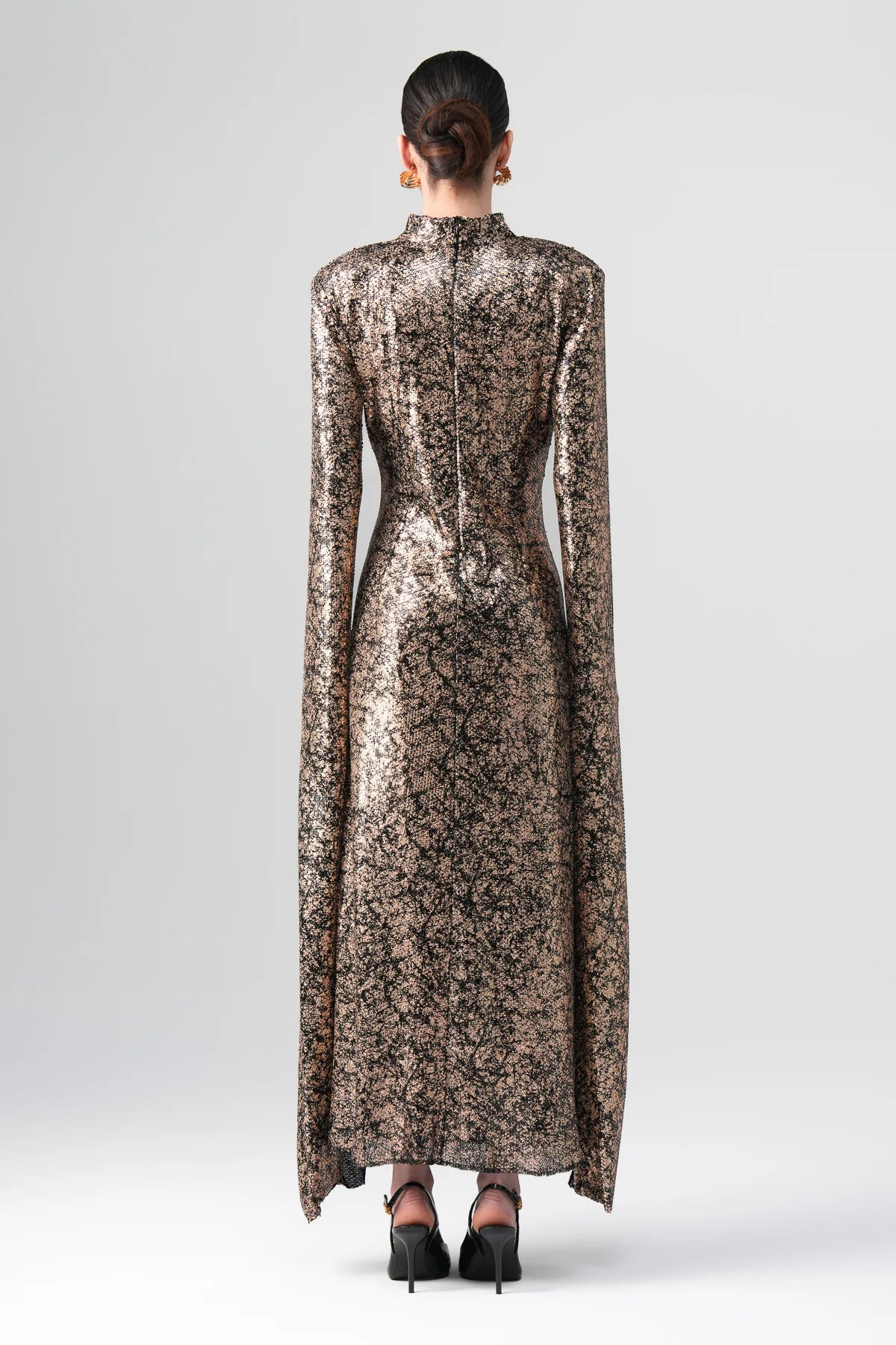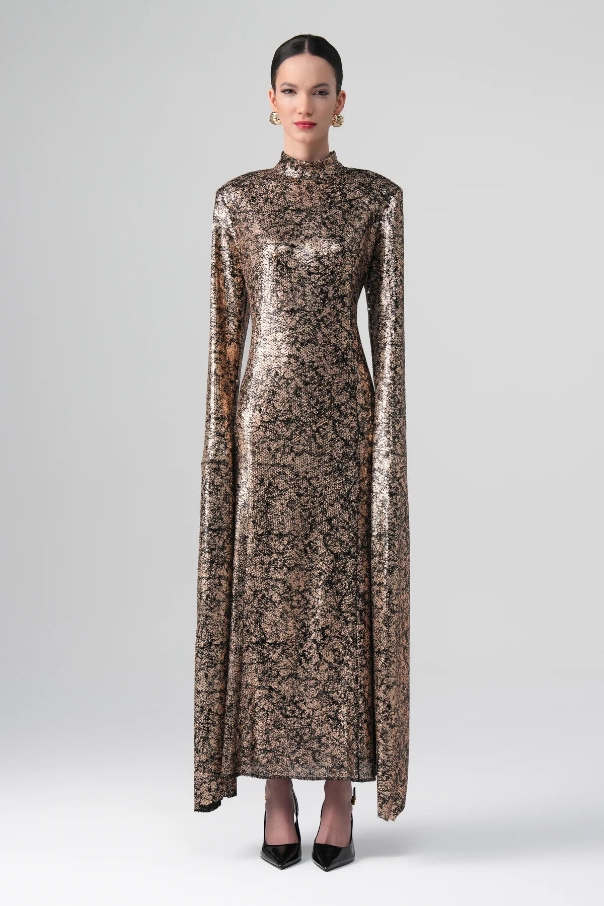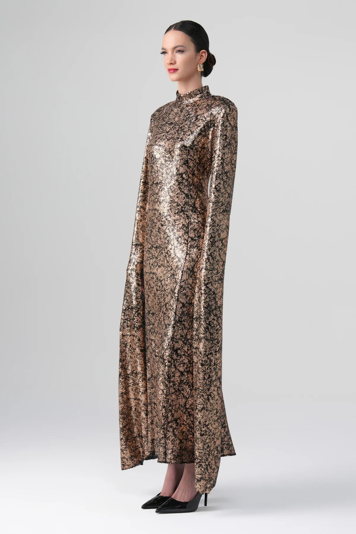A sculpted evening silhouette defined by its fluid drape and high neckline. The design is elevated with a luminous, textured surface that reflects light with every movement, creating a striking yet refined presence. Extended sleeve panels add a dramatic, couture-inspired flow to the overall composition.