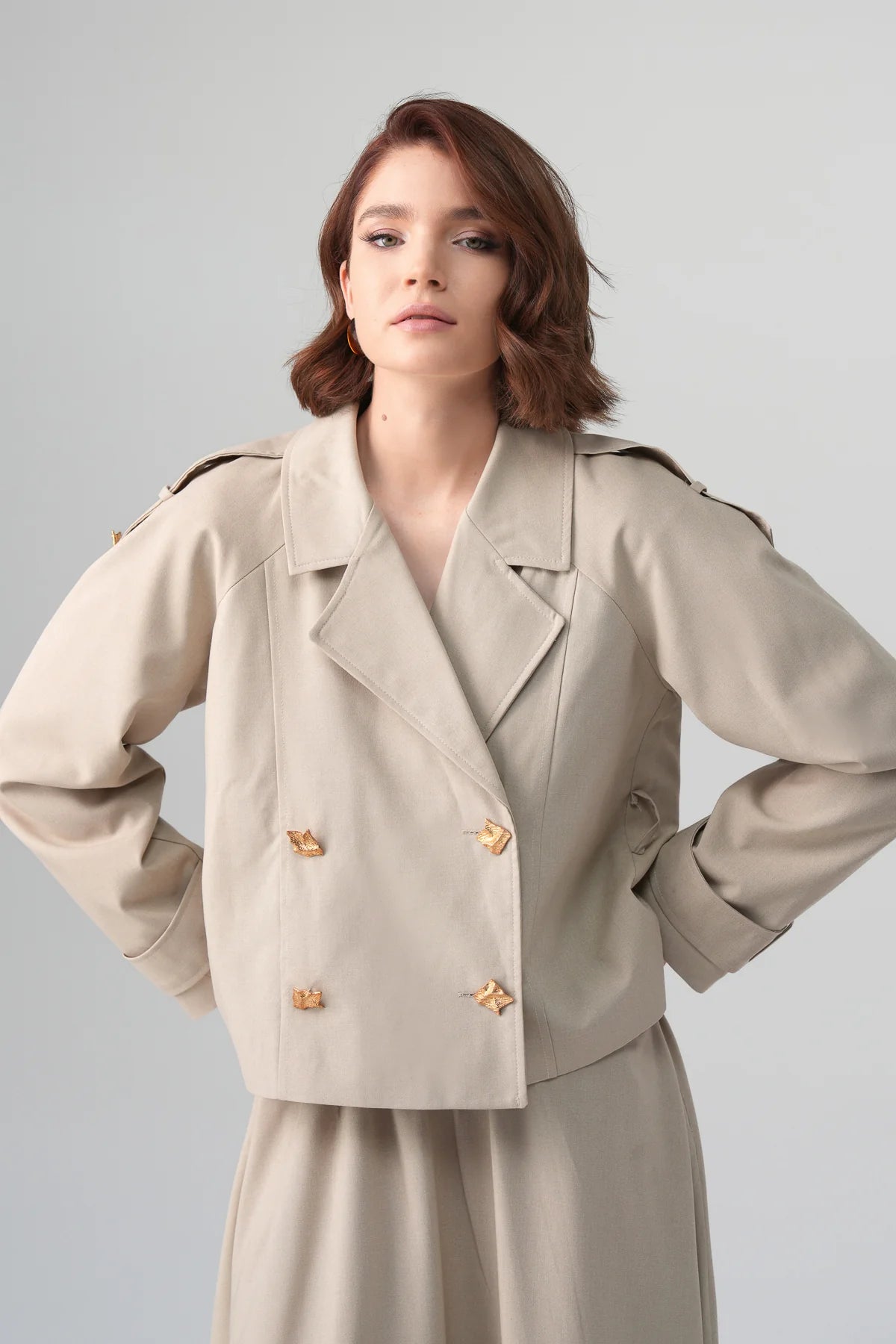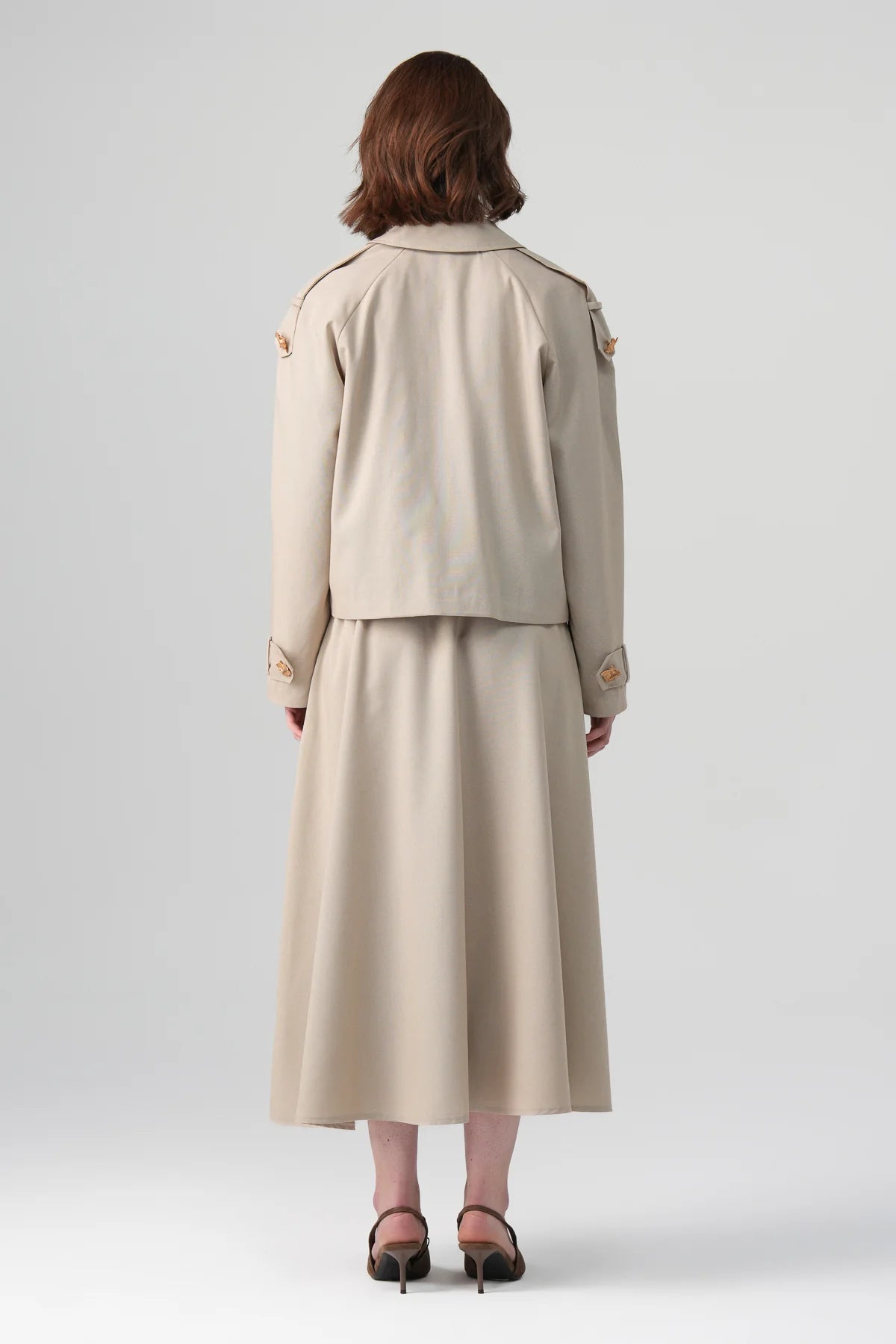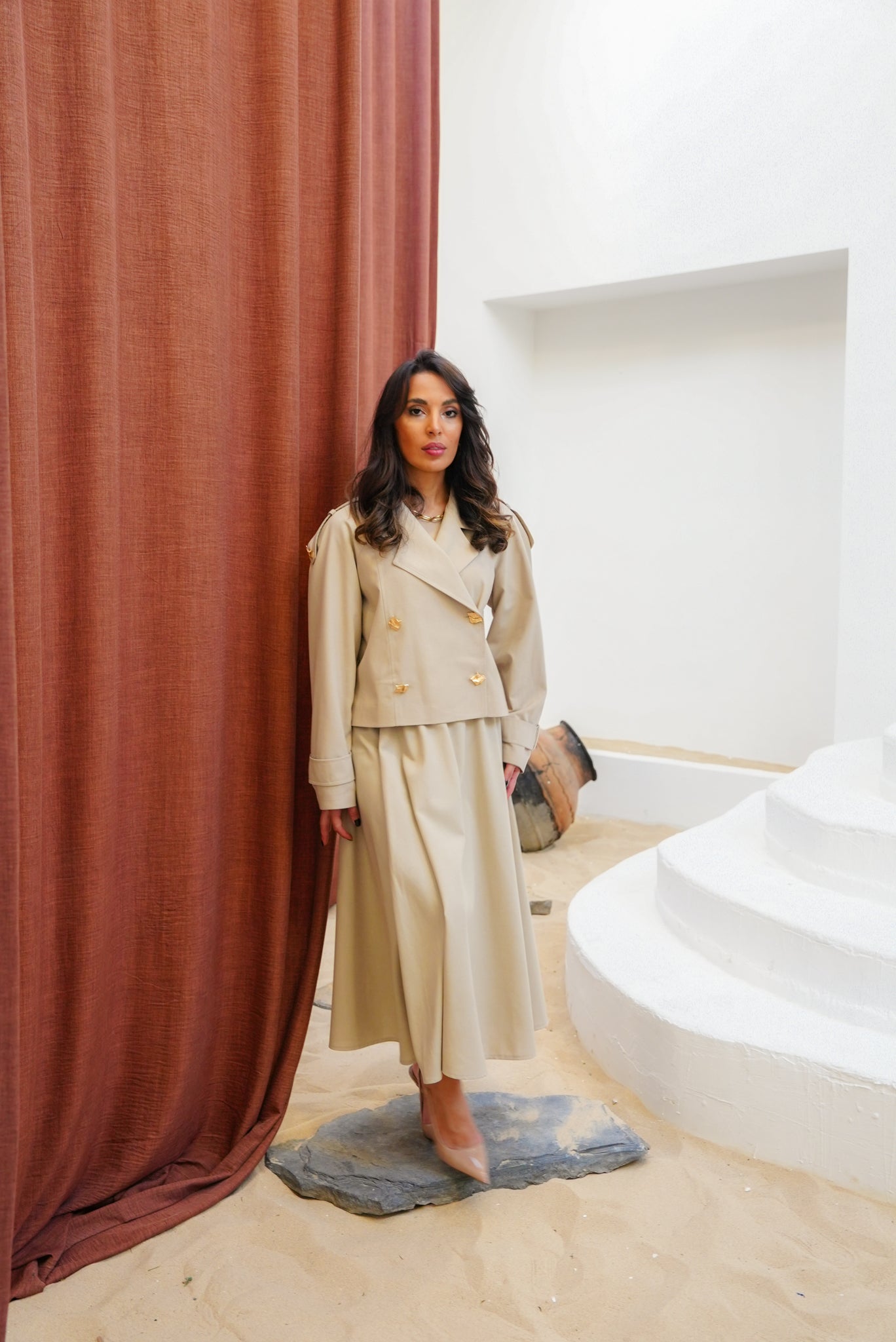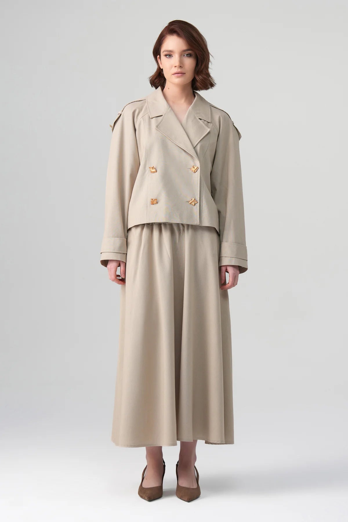 A refined, minimalist two-piece trench set designed for elevated modest dressing. The cropped double-breasted trench features structured shoulders with epaulette detailing and sculptural gold-tone buttons. The matching midi skirt drapes fluidly, creating a balanced, elongated silhouette — sophisticated yet effortless for day-to-evening looks.