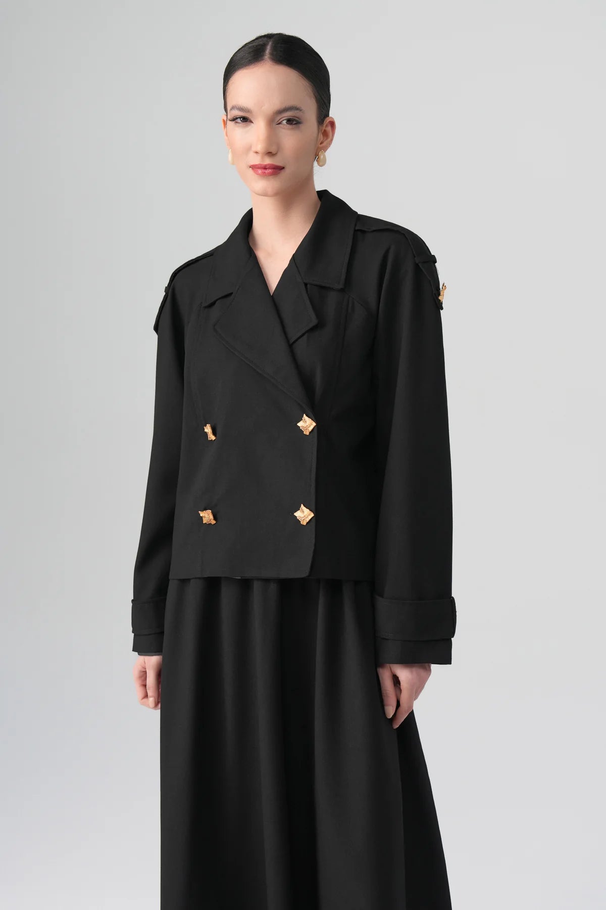 A refined, minimalist two-piece trench set designed for elevated modest dressing. The cropped double-breasted trench features structured shoulders with epaulette detailing and sculptural gold-tone buttons. The matching midi skirt drapes fluidly, creating a balanced, elongated silhouette — sophisticated yet effortless for day-to-evening looks.