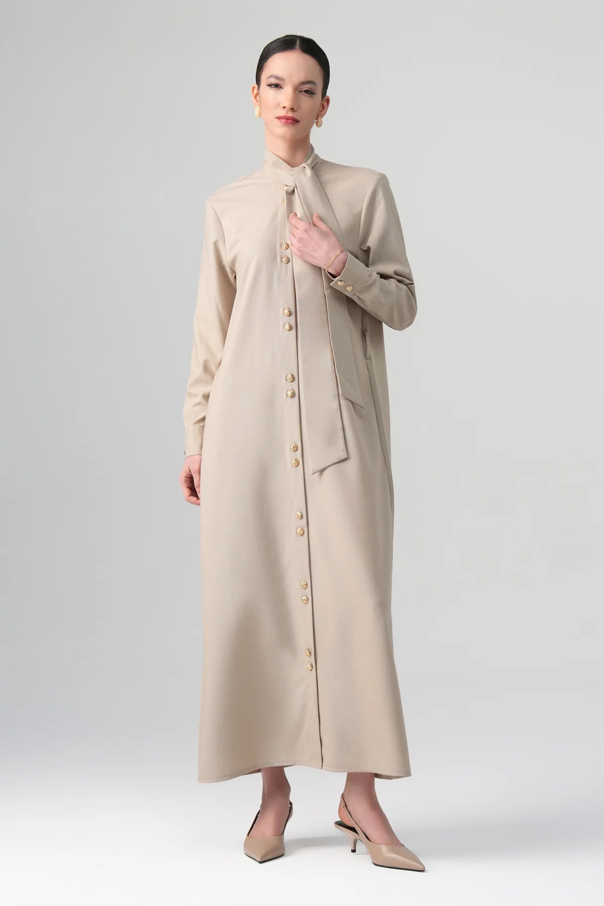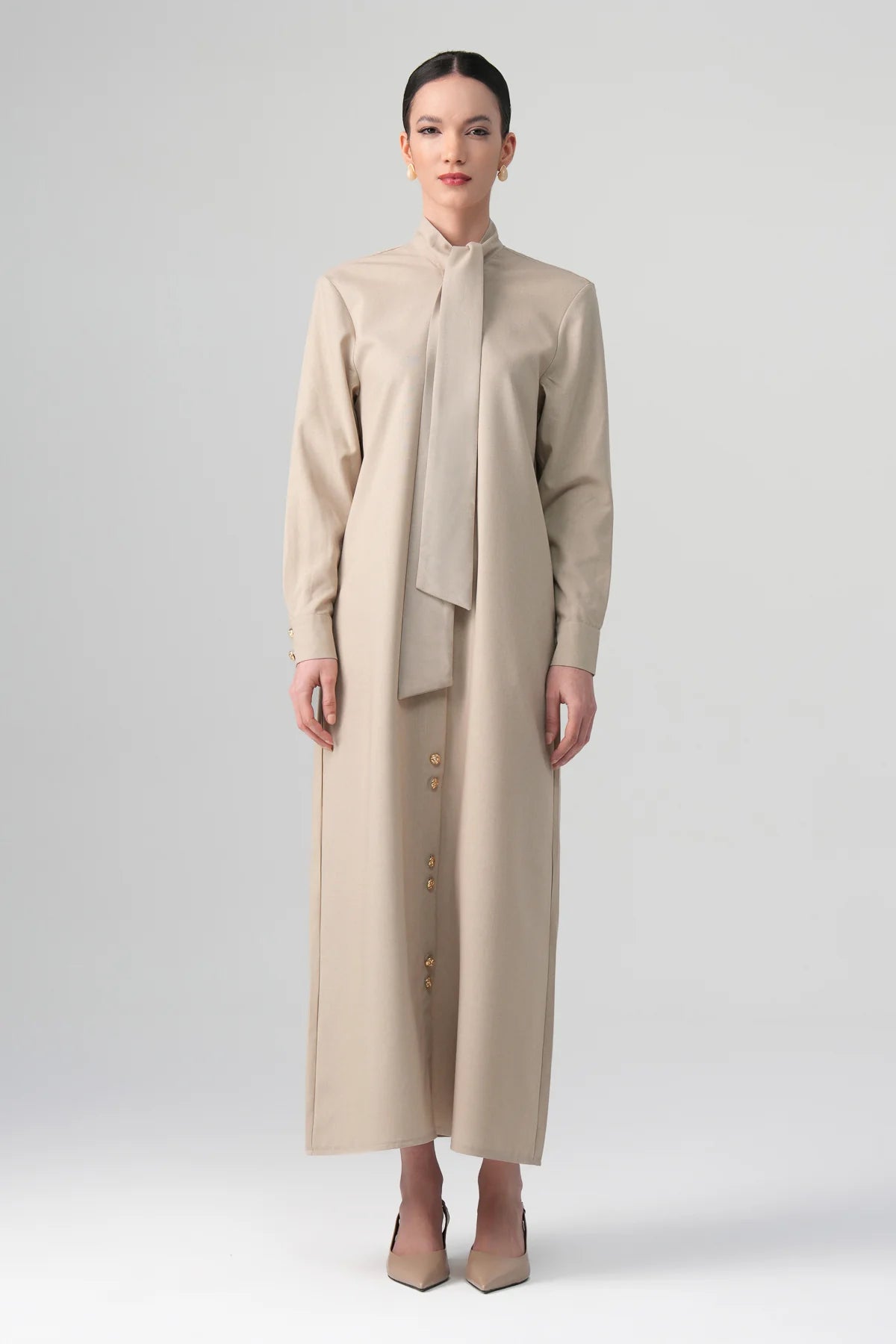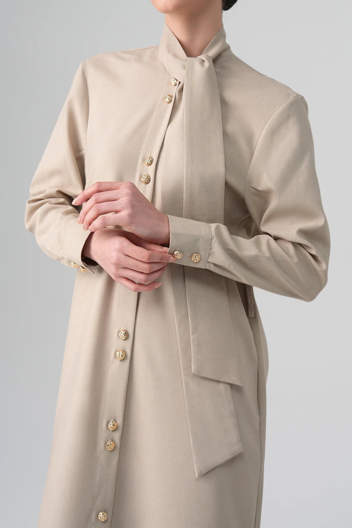 A refined reinterpretation of the timeless shirt dress — designed for elevated modest elegance. The streamlined silhouette features a clean button-front closure with gold-tone statement buttons and a soft attached neck tie that drapes effortlessly. The fluid modal blend ensures movement and comfort while maintaining a structured, polished look. Perfect for day-to-evening styling, business meetings, or elevated everyday wear.