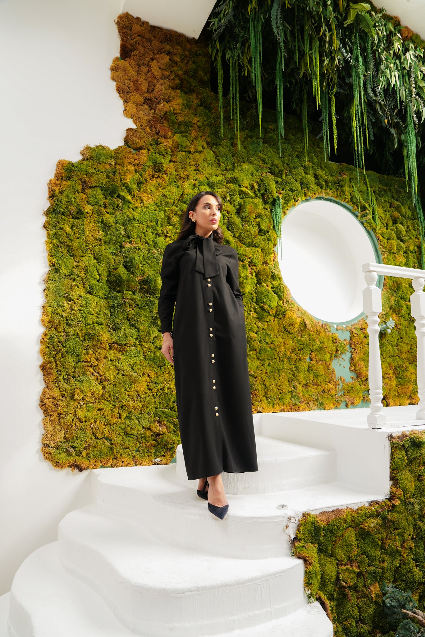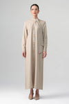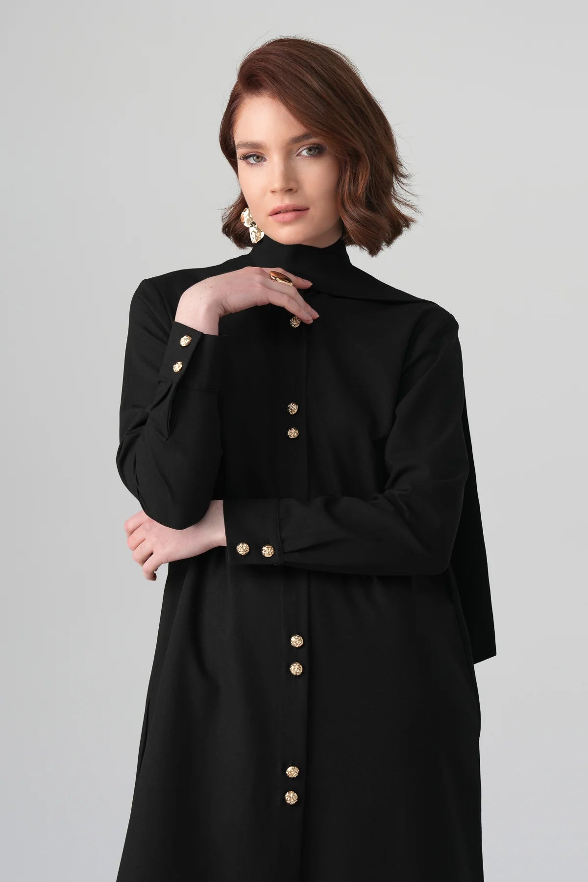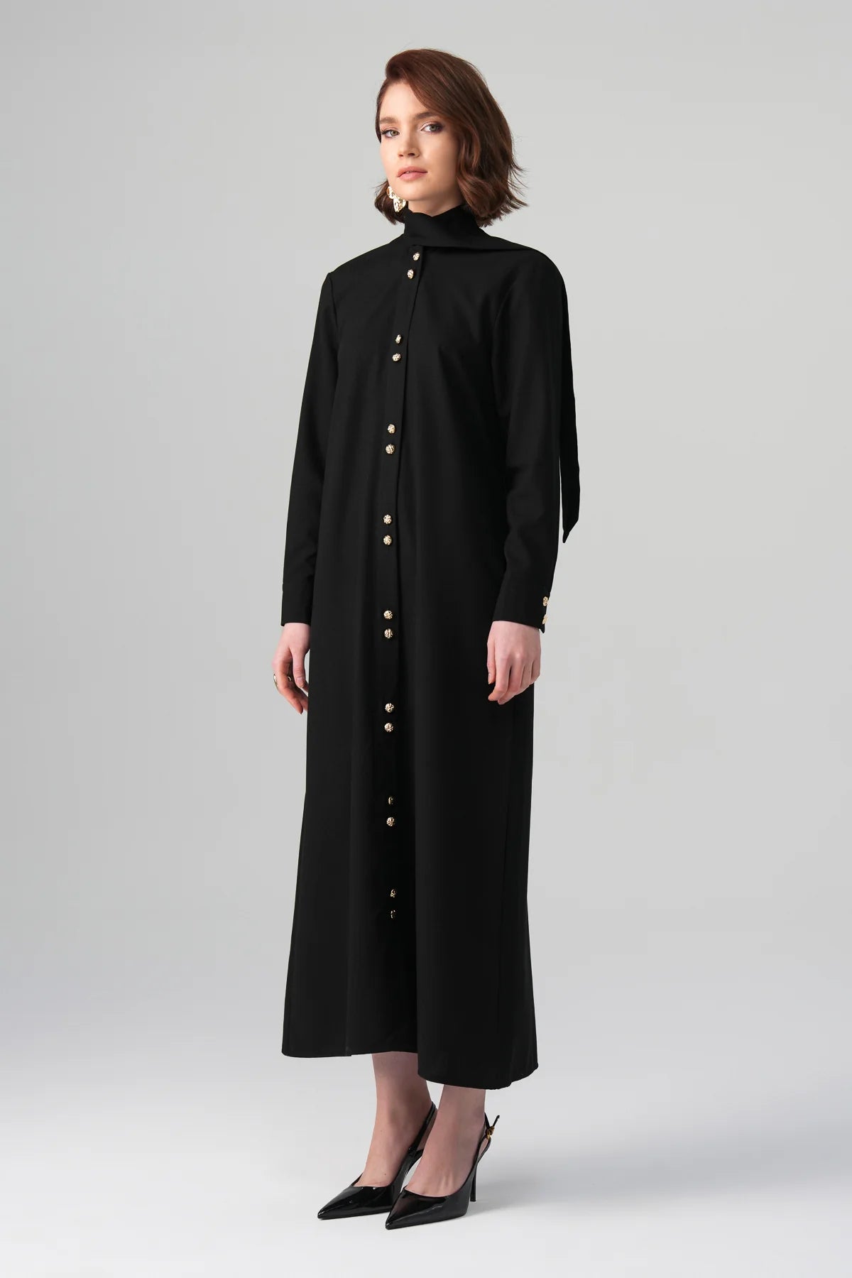 A refined reinterpretation of the timeless shirt dress — designed for elevated modest elegance. The streamlined silhouette features a clean button-front closure with gold-tone statement buttons and a soft attached neck tie that drapes effortlessly. The fluid modal blend ensures movement and comfort while maintaining a structured, polished look. Perfect for day-to-evening styling, business meetings, or elevated everyday wear.