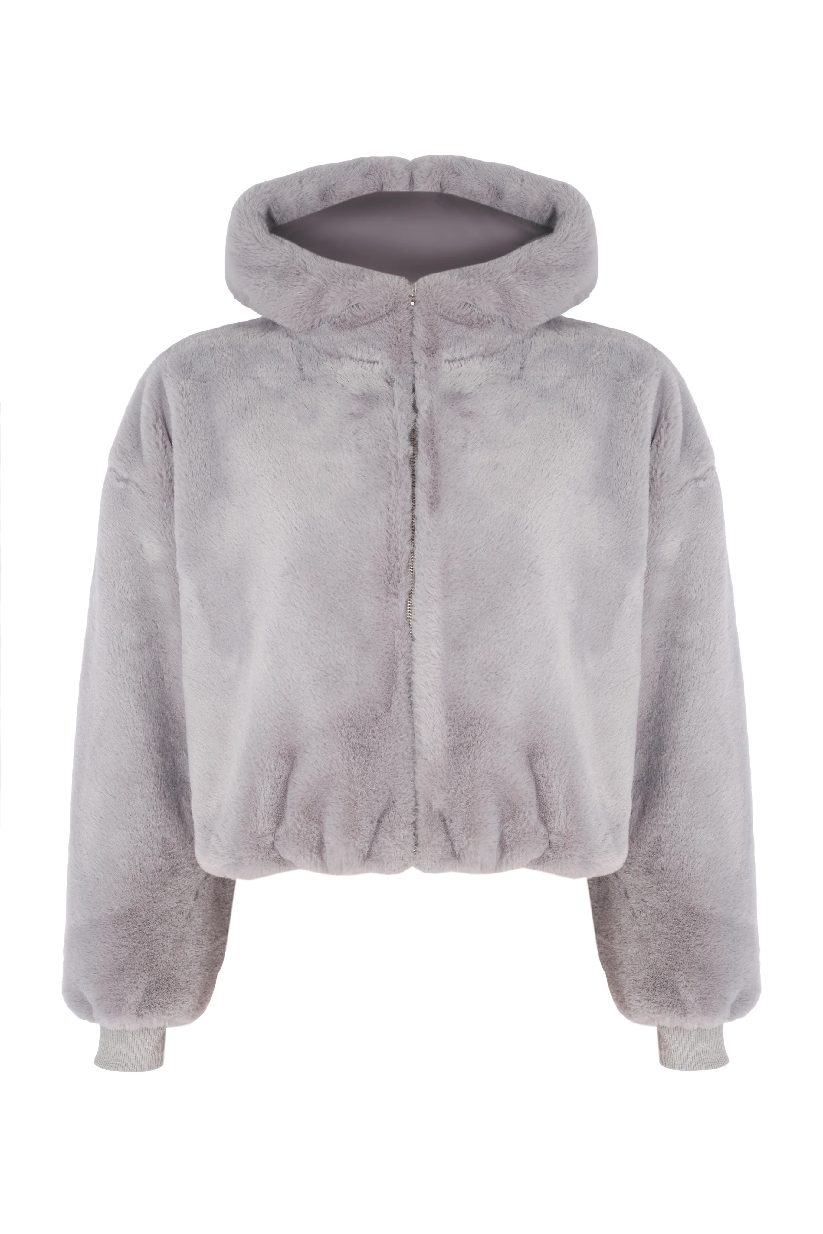 Designed to bring together comfort and elevated street style, this cropped hoodie is crafted from high-quality synthetic fur with a soft, plush texture and a refined visual depth. The zip-up hood provides protection against wind and cold, while the voluminous sleeves with embossed cuff detailing add a sporty, contemporary edge. A cozy yet statement outerwear piece, ideal for completing modern casual looks in colder weather.