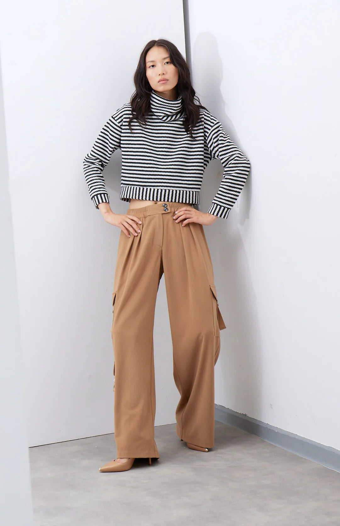 Fit: Modern straight-leg silhouette with a relaxed yet structured drape; high-rise design for a flattering and comfortable fit; cargo pocket detailing for functional elegance