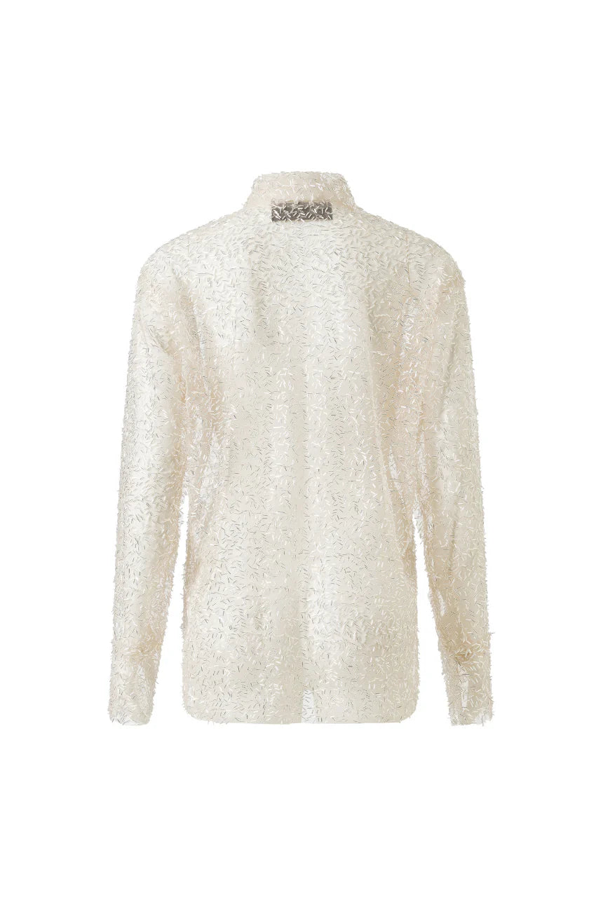 Fit: Relaxed, fluid silhouette; long sleeves; classic shirt collar; sheer structure with all-over bead embroidery; designed for layering and evening styling