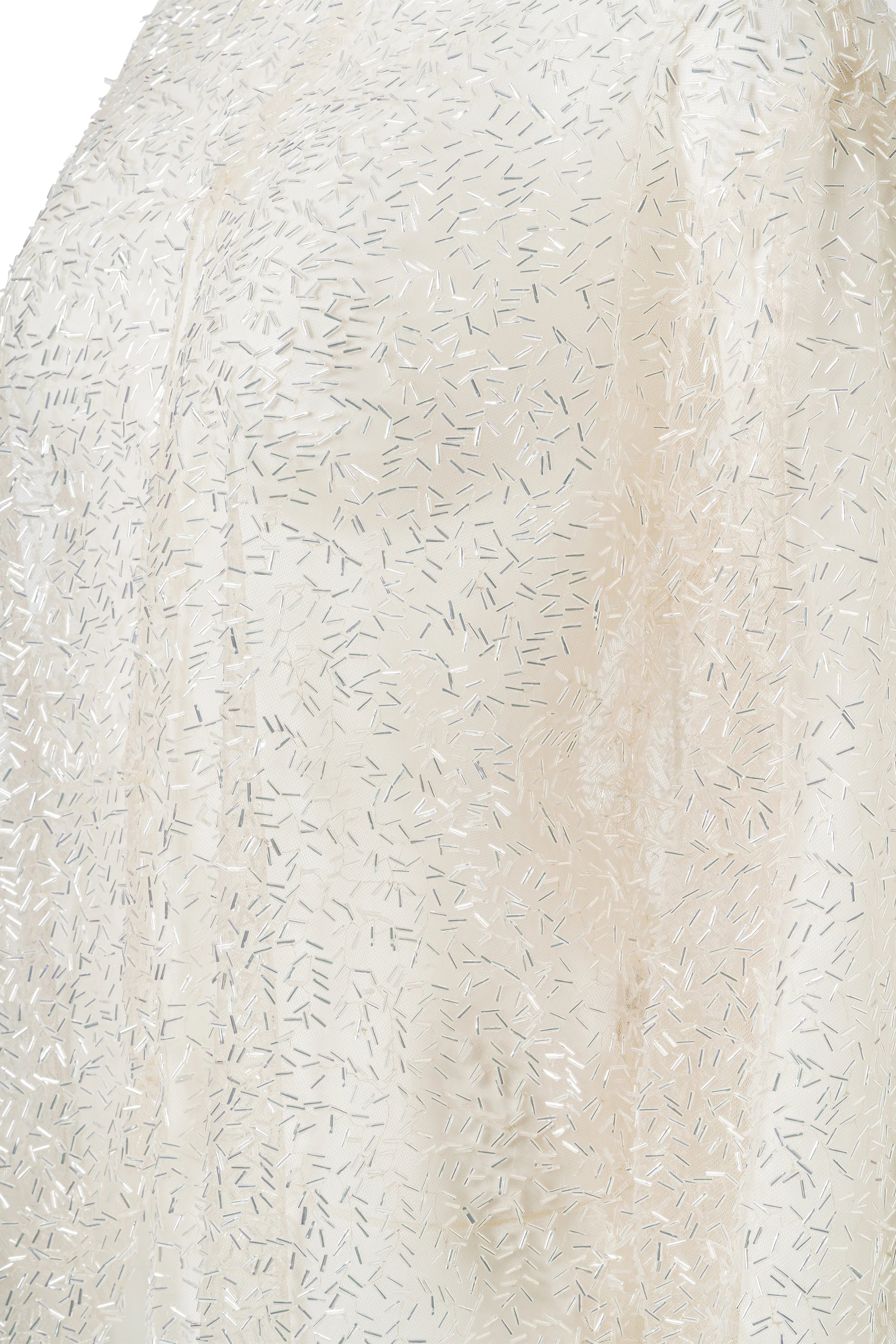 Crafted to merge modern elegance with artisanal craftsmanship, the Margo shirt is a statement piece defined by its delicate transparency and intricate beadwork. The sheer tulle base is adorned with hand-applied glass beads that catch the light softly, creating a refined shimmer with every movement. Its fluid drape and classic shirt silhouette strike a balanced contrast, making this design both expressive and sophisticated. Ideal for evening styling or elevated layered looks, Margo adds an artistic edge to contemporary wardrobes.