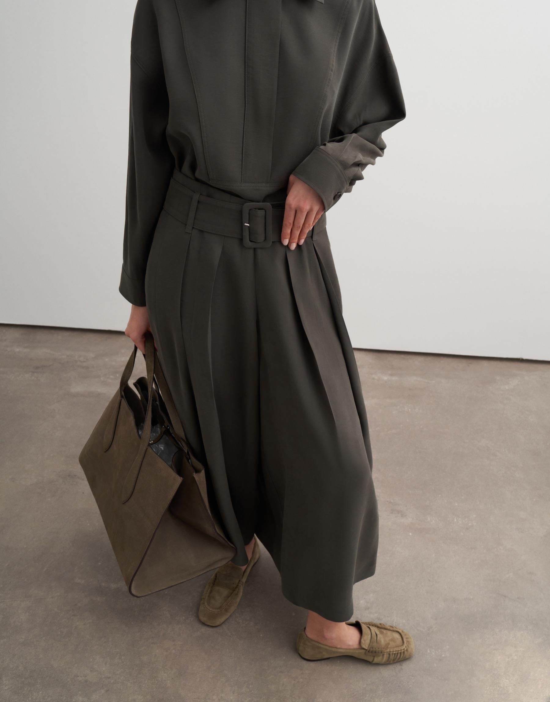 Designed with a refined fluidity, these trousers bring together soft structure and effortless movement. The pleated front enhances volume while maintaining a clean, elongated silhouette. Crafted from a modal-rich fabric, they offer a smooth, breathable feel with a subtle drape. The matching belt with a covered buckle adds a polished, cohesive finish to the look.
