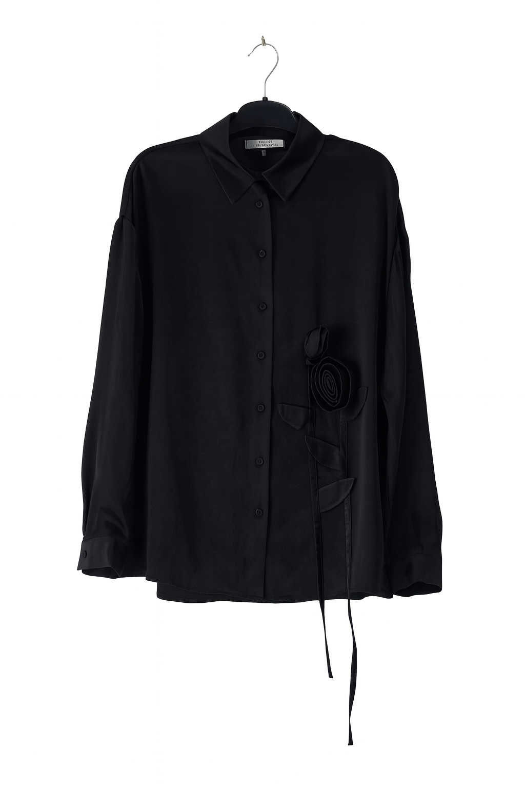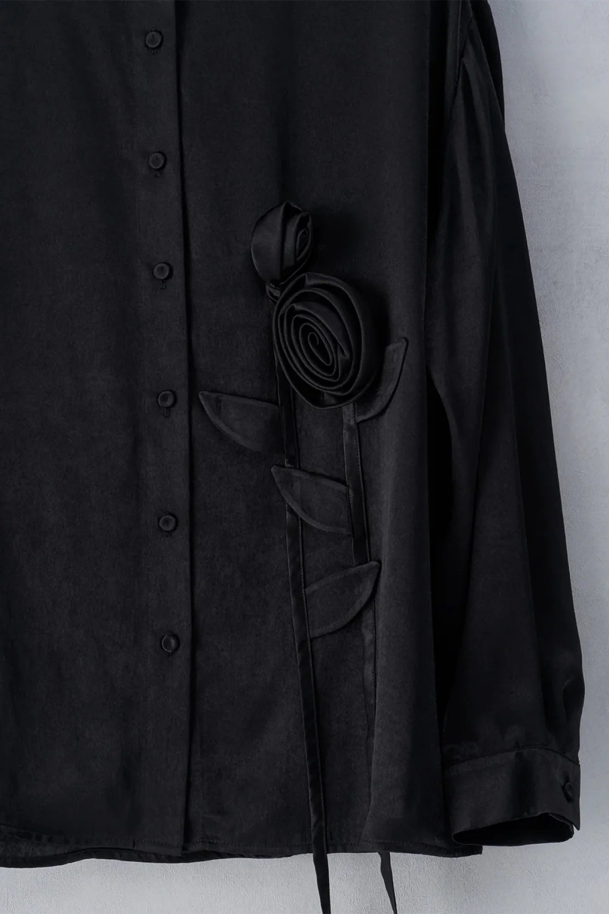 Fit: Relaxed draped silk shirt with long sleeves, buttoned cuffs, and rose appliqué detailing.