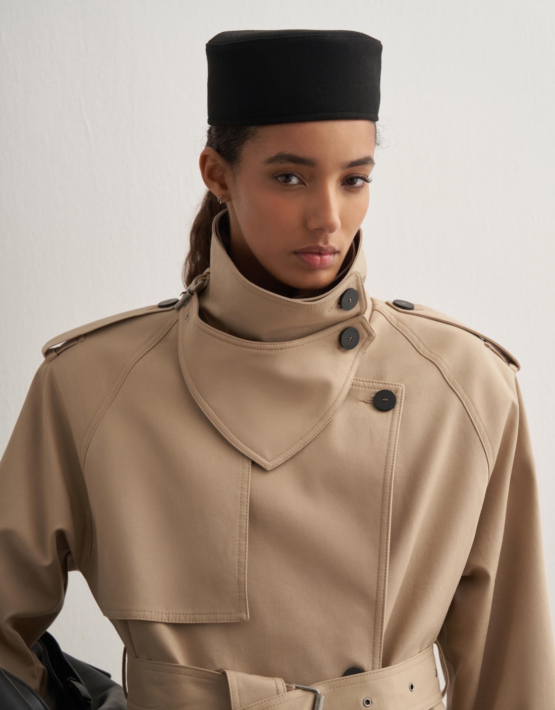 A statement outerwear piece that balances structure and versatility. Designed in a full-length silhouette, this trench features a sculpted high neckline and a detachable front panel that allows for styling variation. The belted waist enhances the shape, while epaulettes and cuff straps reference classic trench tailoring. Crafted from 100% cotton, it delivers a refined, breathable feel suited for transitional seasons.