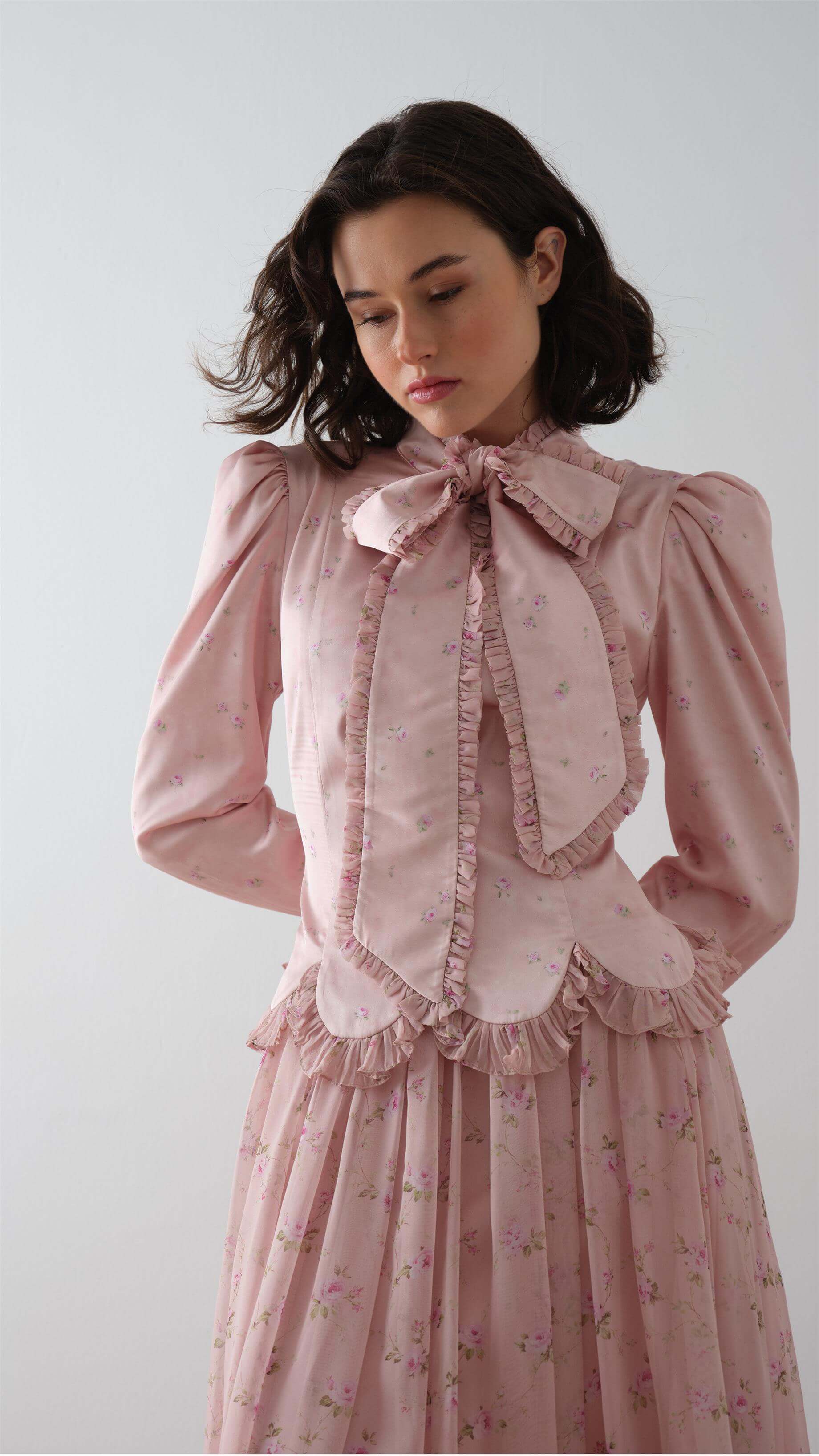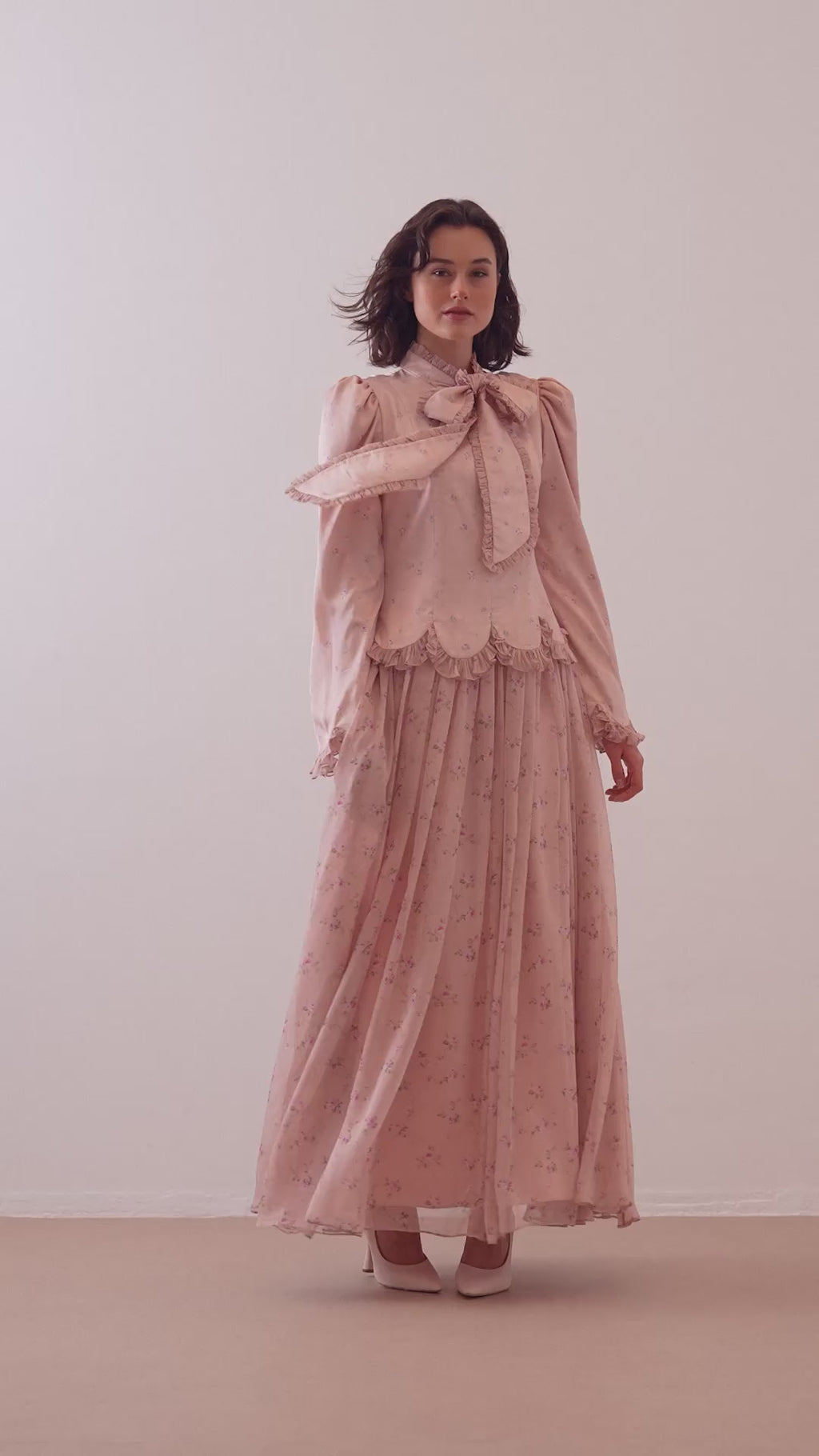 Romantic and timeless, this vintage-inspired maxi dress captures a graceful femininity with its delicate floral print and soft cream hue. The high neckline is adorned with a statement bow, while ruffled details along the cuffs and waist add a charming, period-drama elegance. Crafted in a lightweight flowy fabric, it offers both comfort and sophistication — perfect for garden gatherings, tea events, or special daytime occasions.