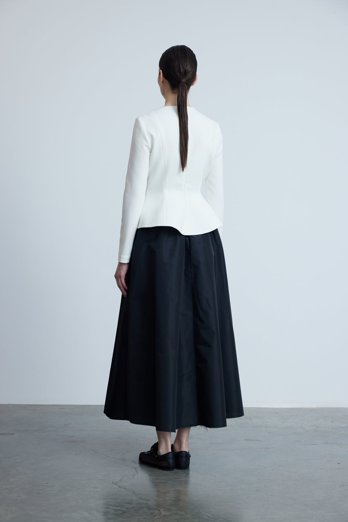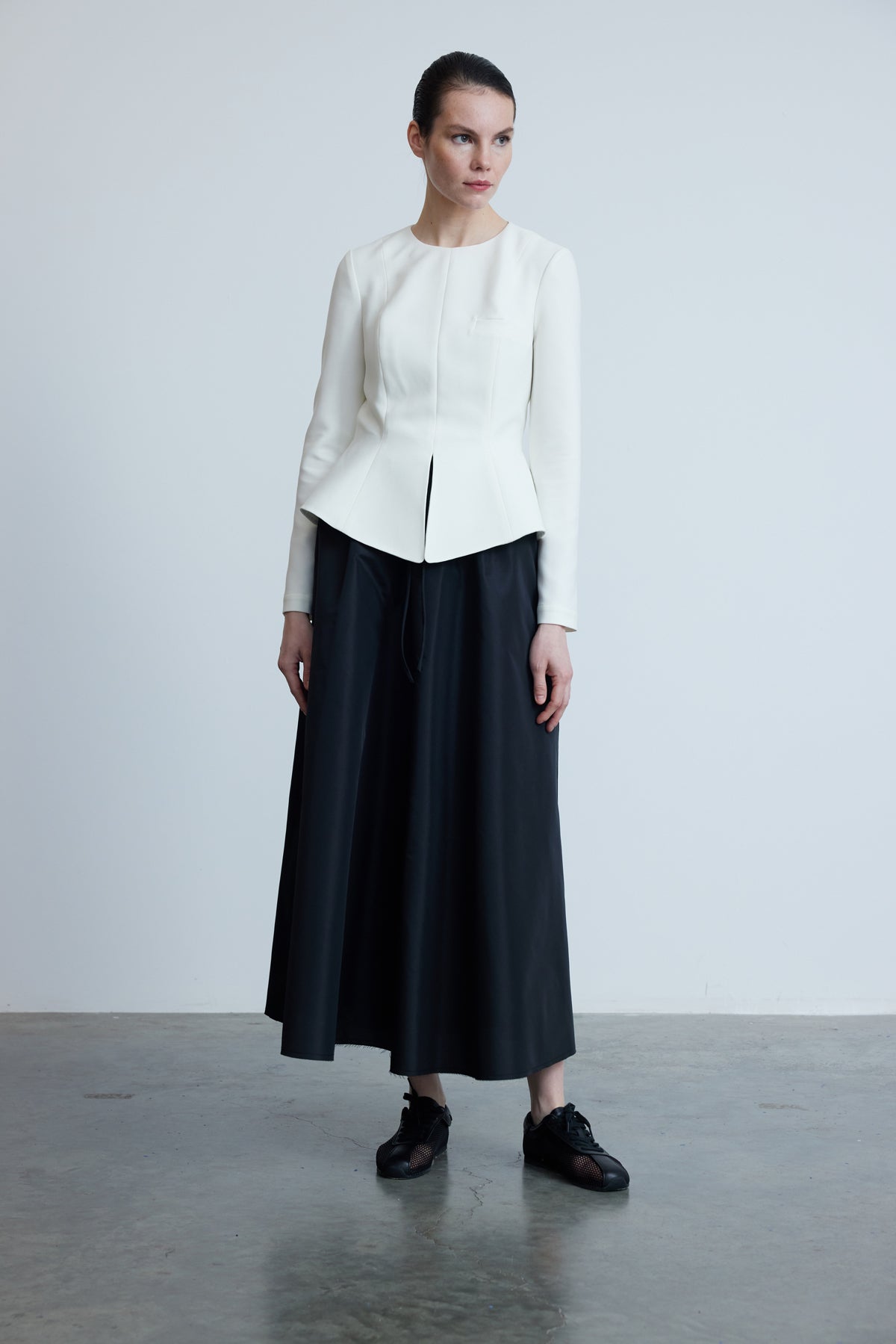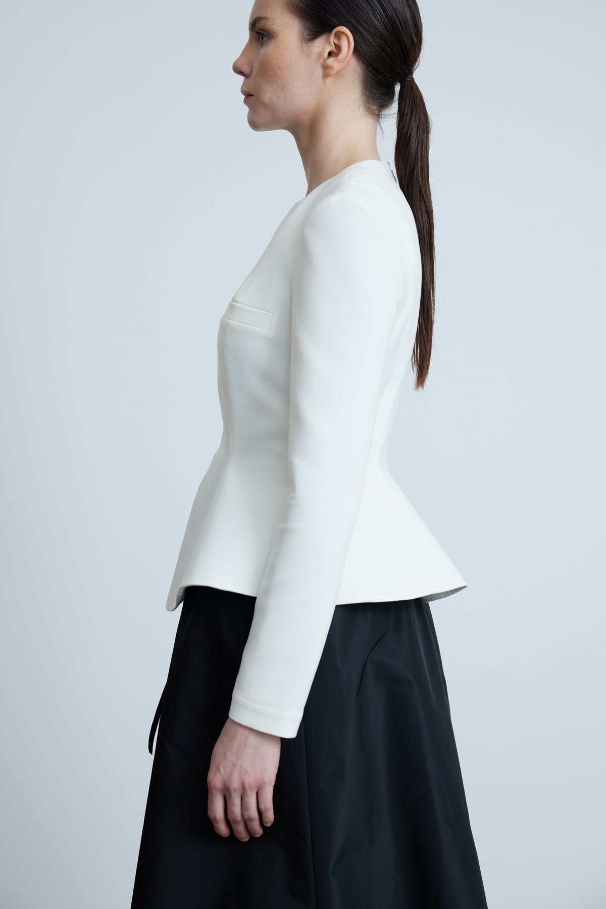 Элегантная структура сочетается с современной простотой в этой белой блузке из крепа от Kevser Studio. Модель с круглым вырезом и длинными рукавами украшена декоративным прорезным карманом и остро вырезанным передним разрезом, который плавно расширяется в мягкий пеплум. Приталенный силуэт и застежка-молния сзади обеспечивают гладкую, выгодно подчеркивающую фигуру посадку, идеально подходящую для многослойности под жакеты или сочетания с брюками и юбками с высокой талией. Вневременная вещь для изящных переходов от дневного к вечернему образу.