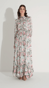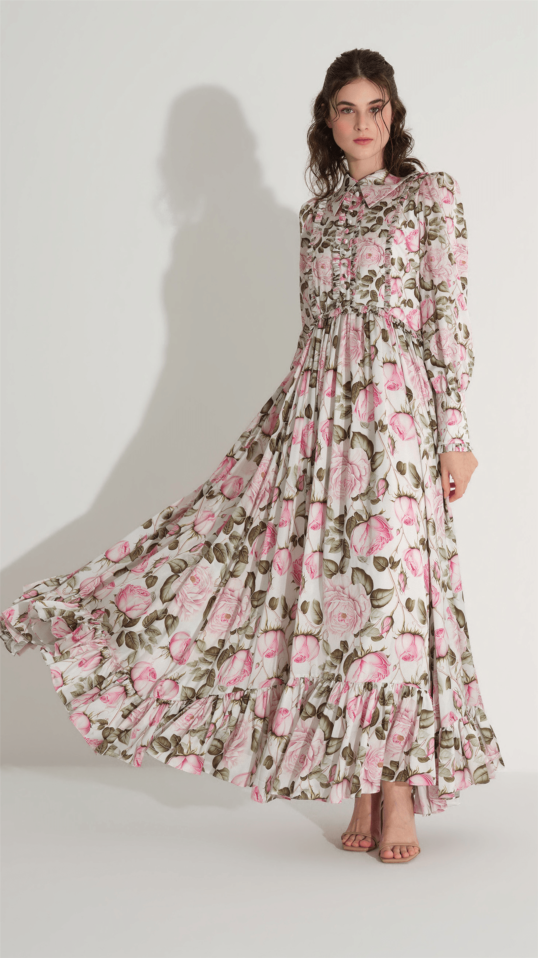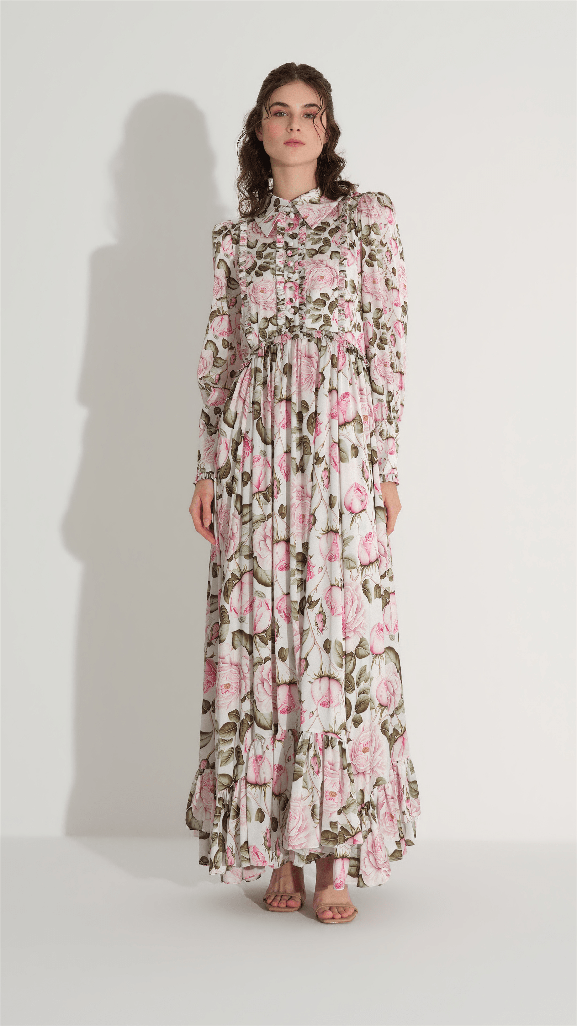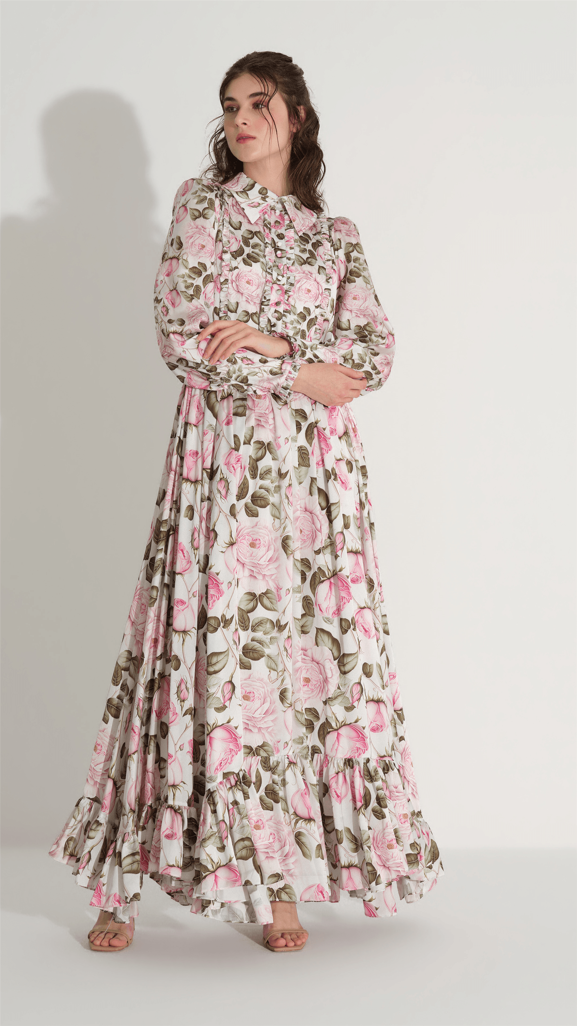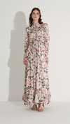 A soft and romantic silhouette defined by fluid satin and delicate floral composition. The bodice is gently structured with subtle gathering and a refined neckline detail, while the skirt flows into layered tiers that create graceful movement. Designed to evoke lightness and elegance, it offers a timeless, feminine presence.