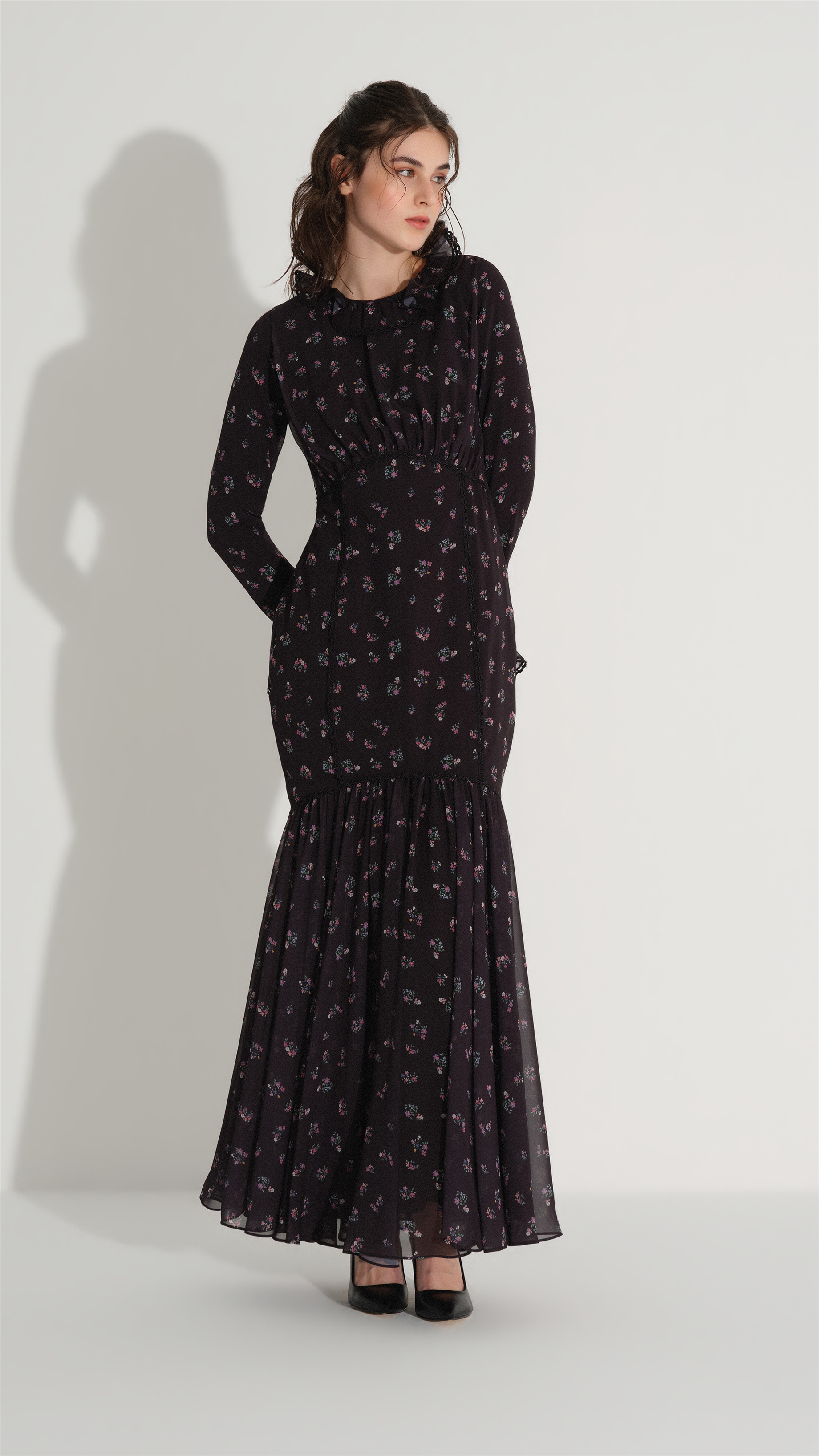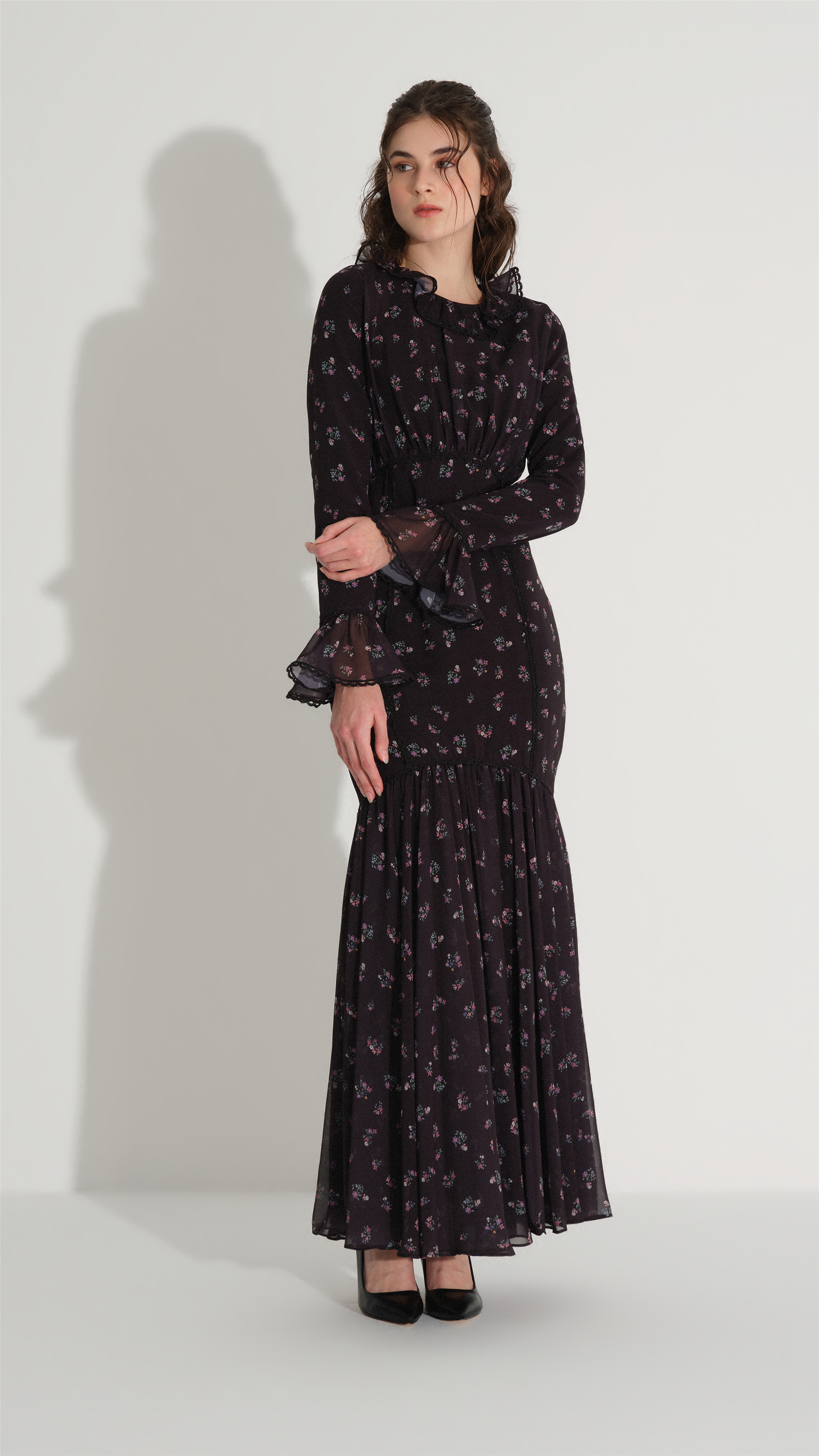 A refined silhouette designed to emphasize elegance and femininity, this mermaid-form dress gently follows the body and flares towards the hem for a balanced, graceful look. Delicate lace trim at the neckline and cuffs adds a subtle decorative touch, while the softly gathered waist enhances the natural shape. The lightweight structure and minimal floral pattern create a timeless piece suitable for both day and evening occasions.