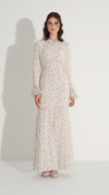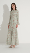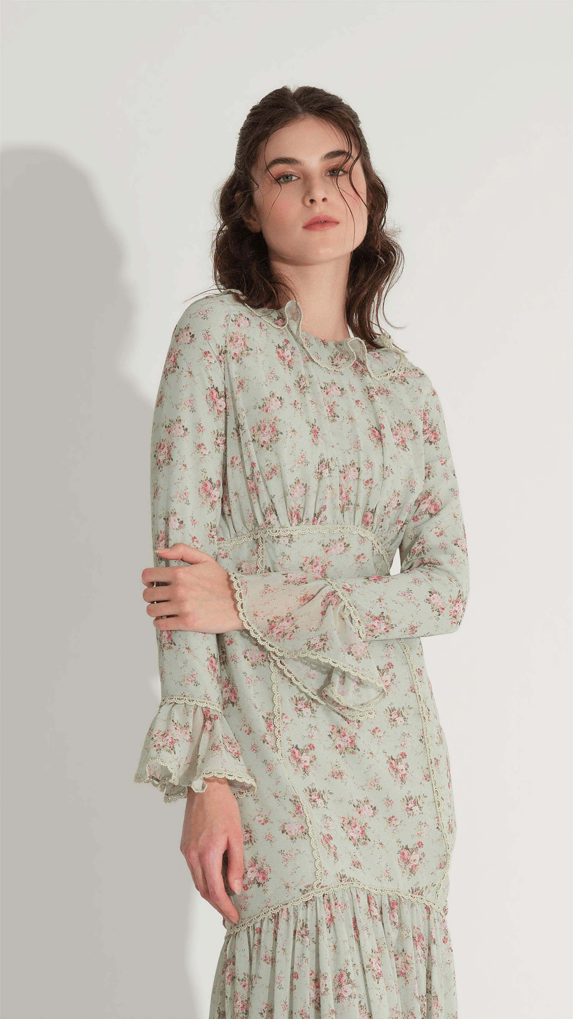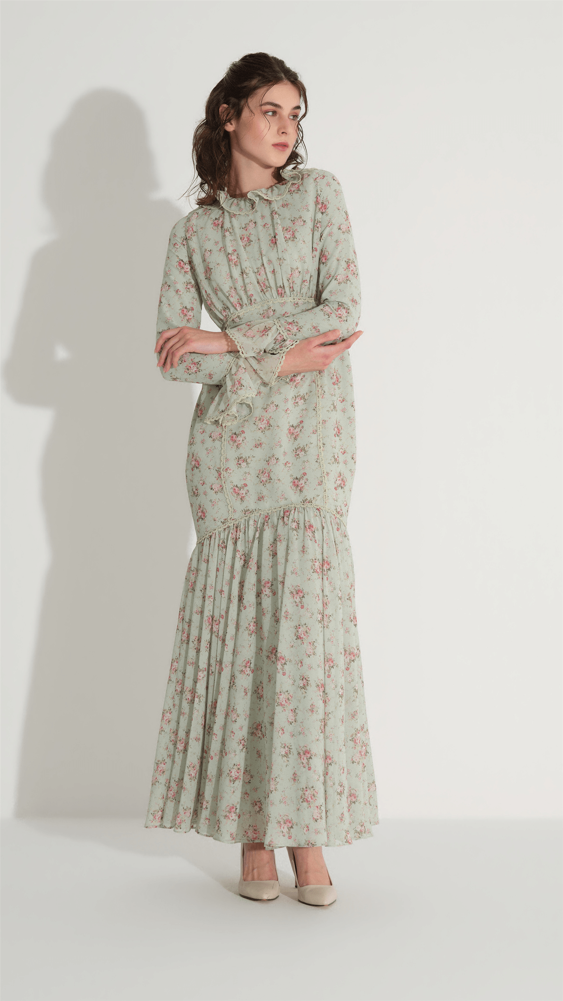 A refined silhouette designed to emphasize elegance and femininity, this mermaid-form dress gently follows the body and flares towards the hem for a balanced, graceful look. Delicate lace trim at the neckline and cuffs adds a subtle decorative touch, while the softly gathered waist enhances the natural shape. The lightweight structure and minimal floral pattern create a timeless piece suitable for both day and evening occasions.