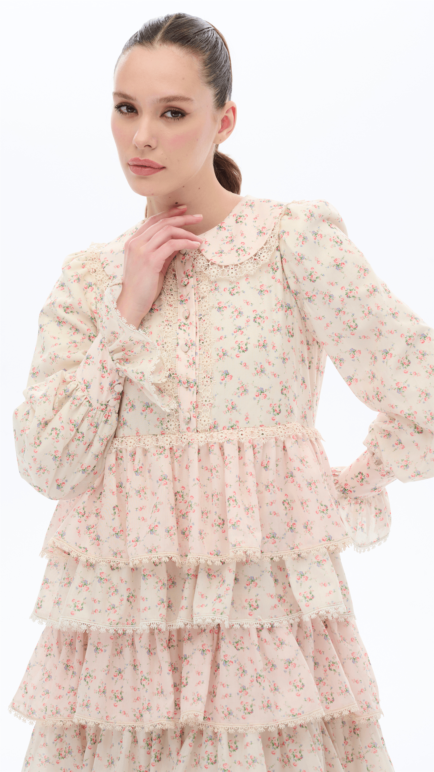 A statement of romantic craftsmanship, this dress is defined by its multi-layered ruffle skirt enriched with delicate lace trims. The softly structured bodice is complemented by a refined collar and subtle detailing, while cascading tiers create dramatic volume and movement. Designed to evoke a vintage-inspired elegance, it offers a distinctive and graceful silhouette.