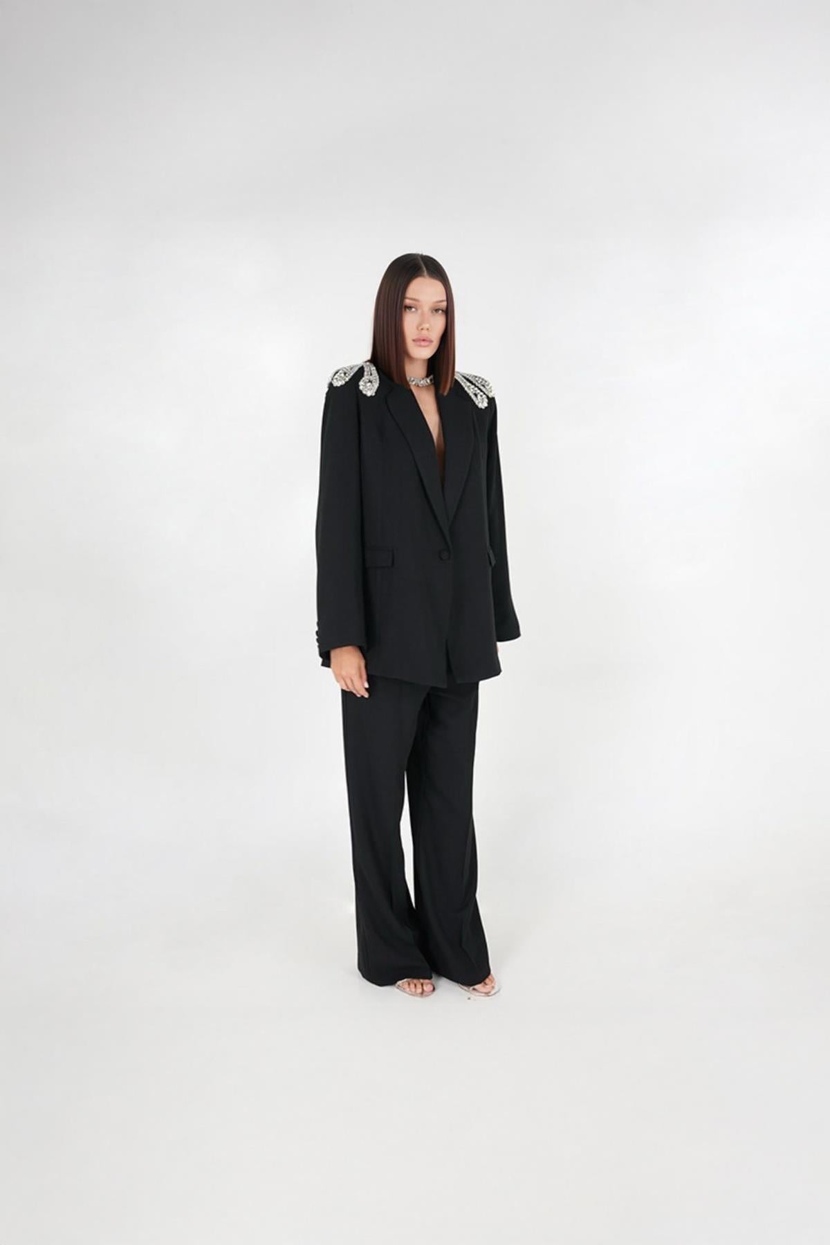 A sharply tailored set elevated with refined crystal embellishments at the shoulders. The structured blazer features clean lines and a minimalist front, allowing the intricate detailing to stand out with subtle brilliance. Paired with straight-leg trousers, the silhouette remains balanced and effortlessly sophisticated. Designed for occasions that call for understated statement dressing, this set merges elegance with modern precision.