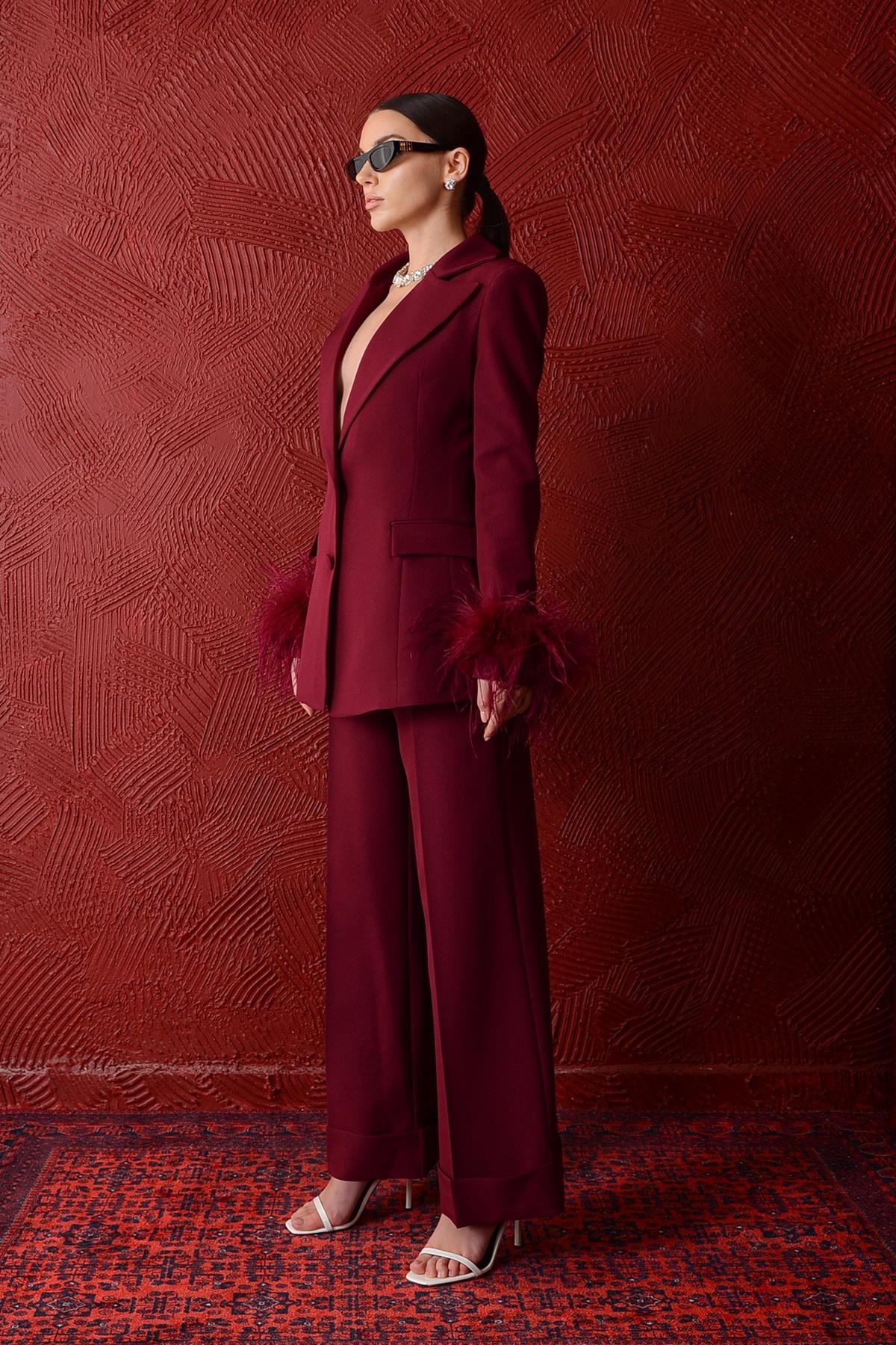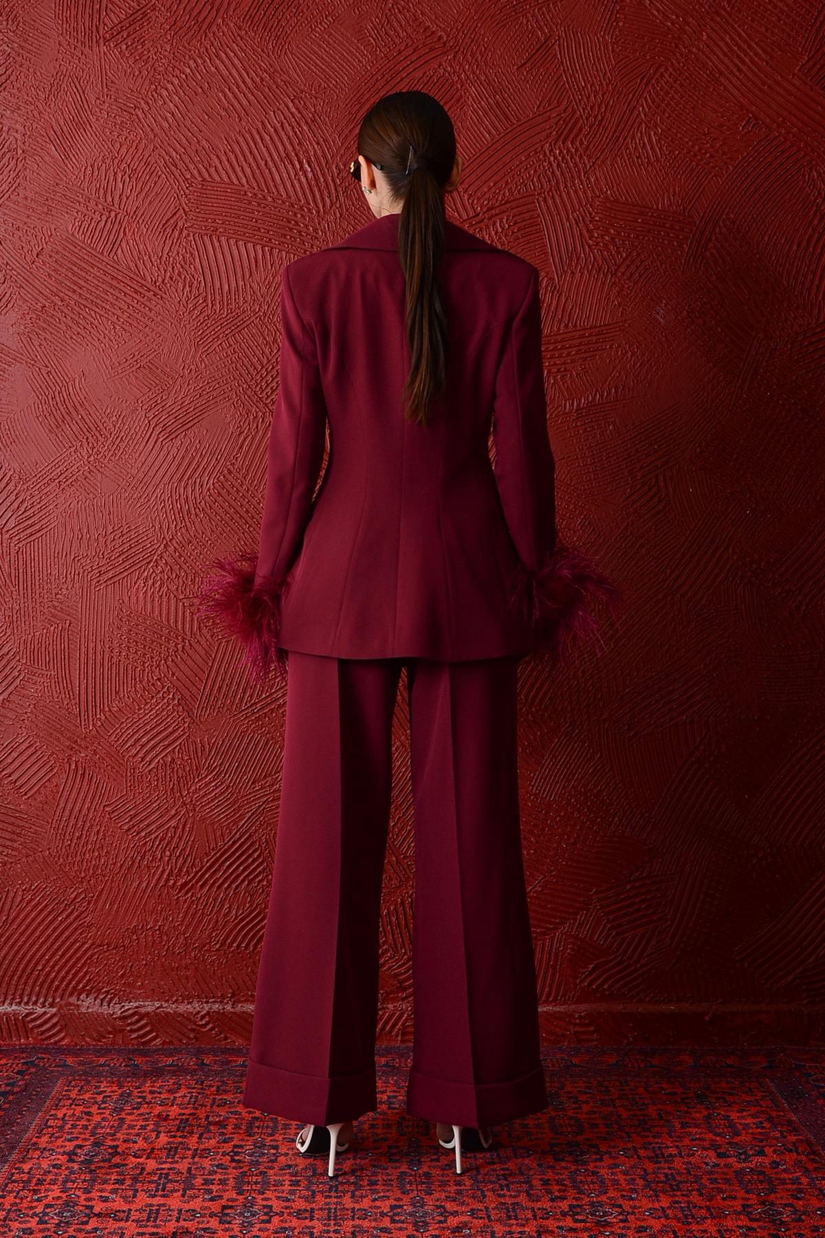 A statement set defined by refined detailing and modern elegance. Designed with delicate soft feather accents at the cuffs, this suit elevates classic tailoring into a distinctive, evening-ready silhouette. The fluid modal blend offers comfort and ease of movement, balancing sophistication with wearability.