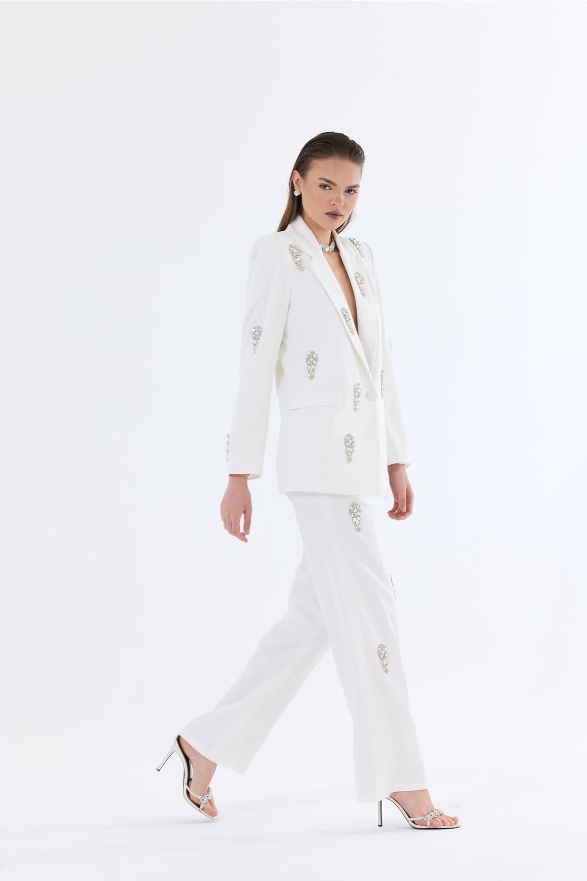 A statement set defined by refined detailing and modern elegance. Designed with delicate embellishments, this suit elevates classic tailoring into a distinctive, evening-ready silhouette. The fluid modal blend offers comfort and ease of movement, balancing sophistication with wearability.