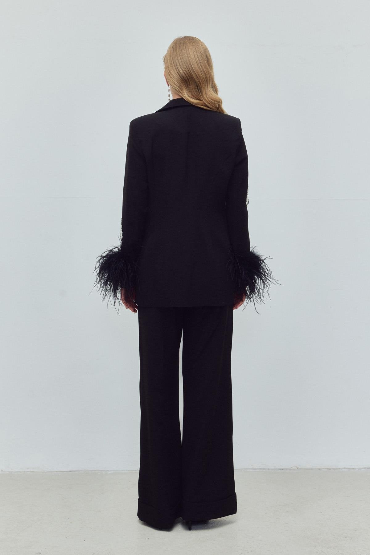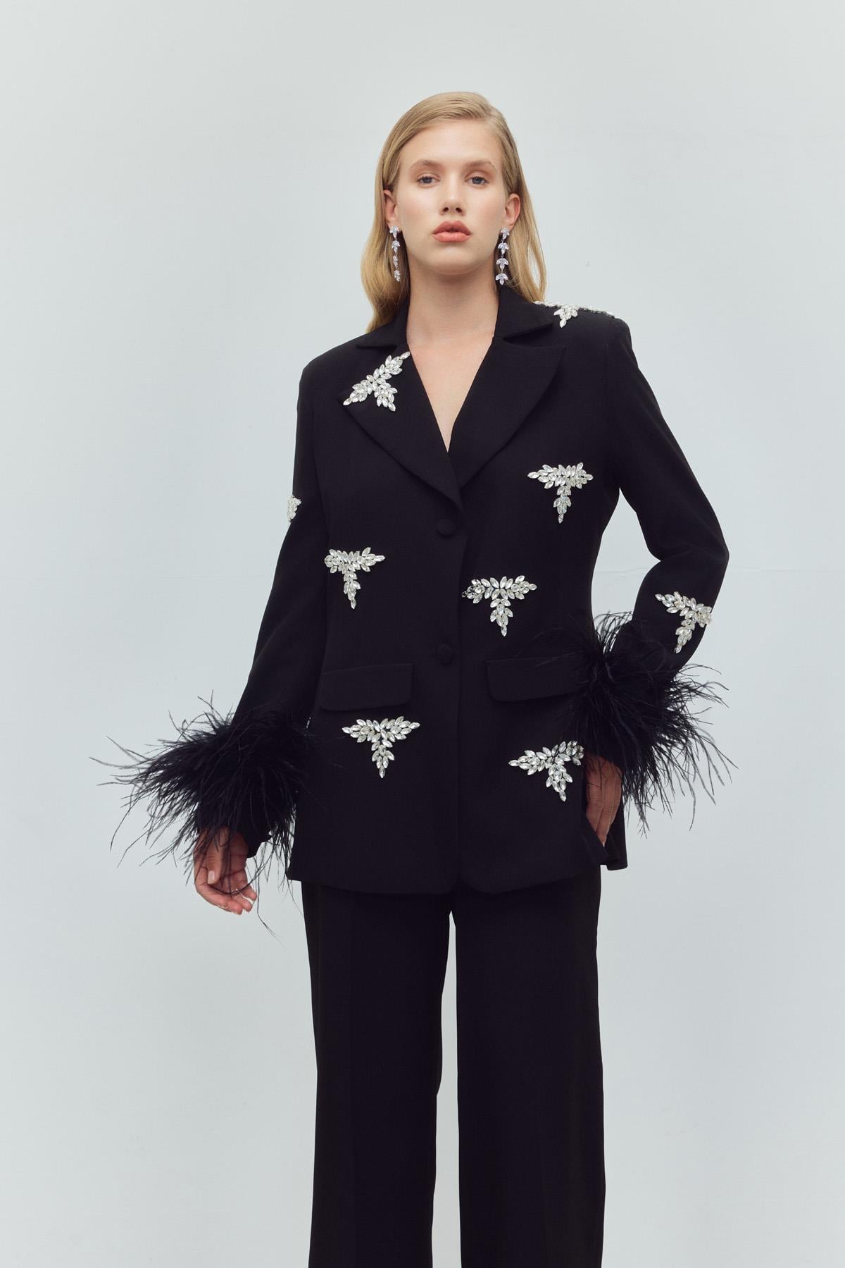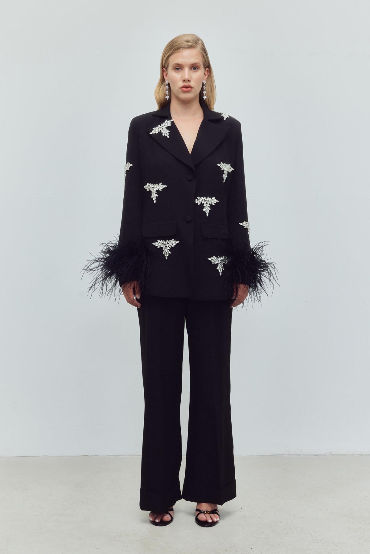 A statement set defined by refined detailing and modern elegance. Designed with delicate embellishments, this suit elevates classic tailoring into a distinctive, evening-ready silhouette. The fluid modal blend offers comfort and ease of movement, balancing sophistication with wearability.