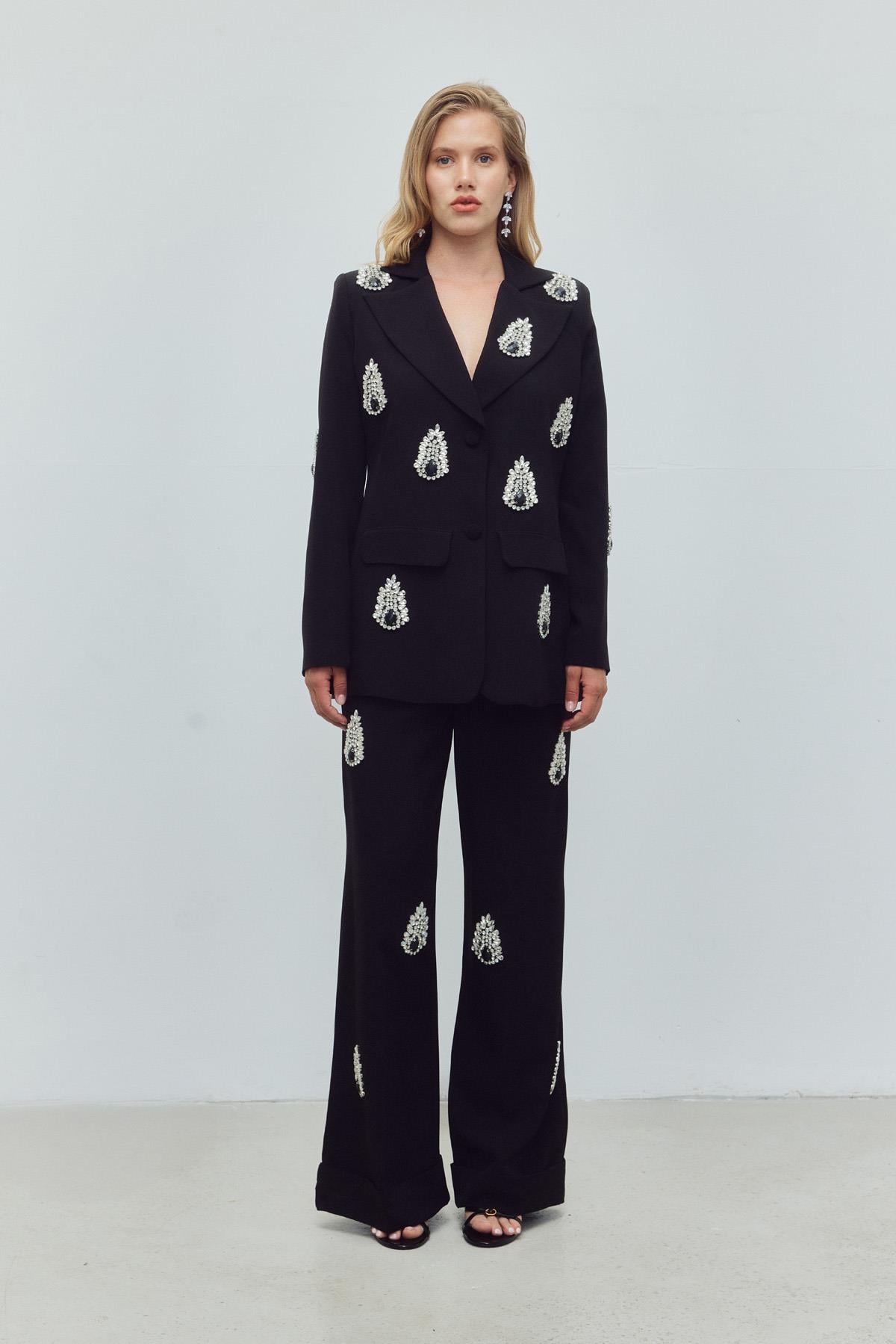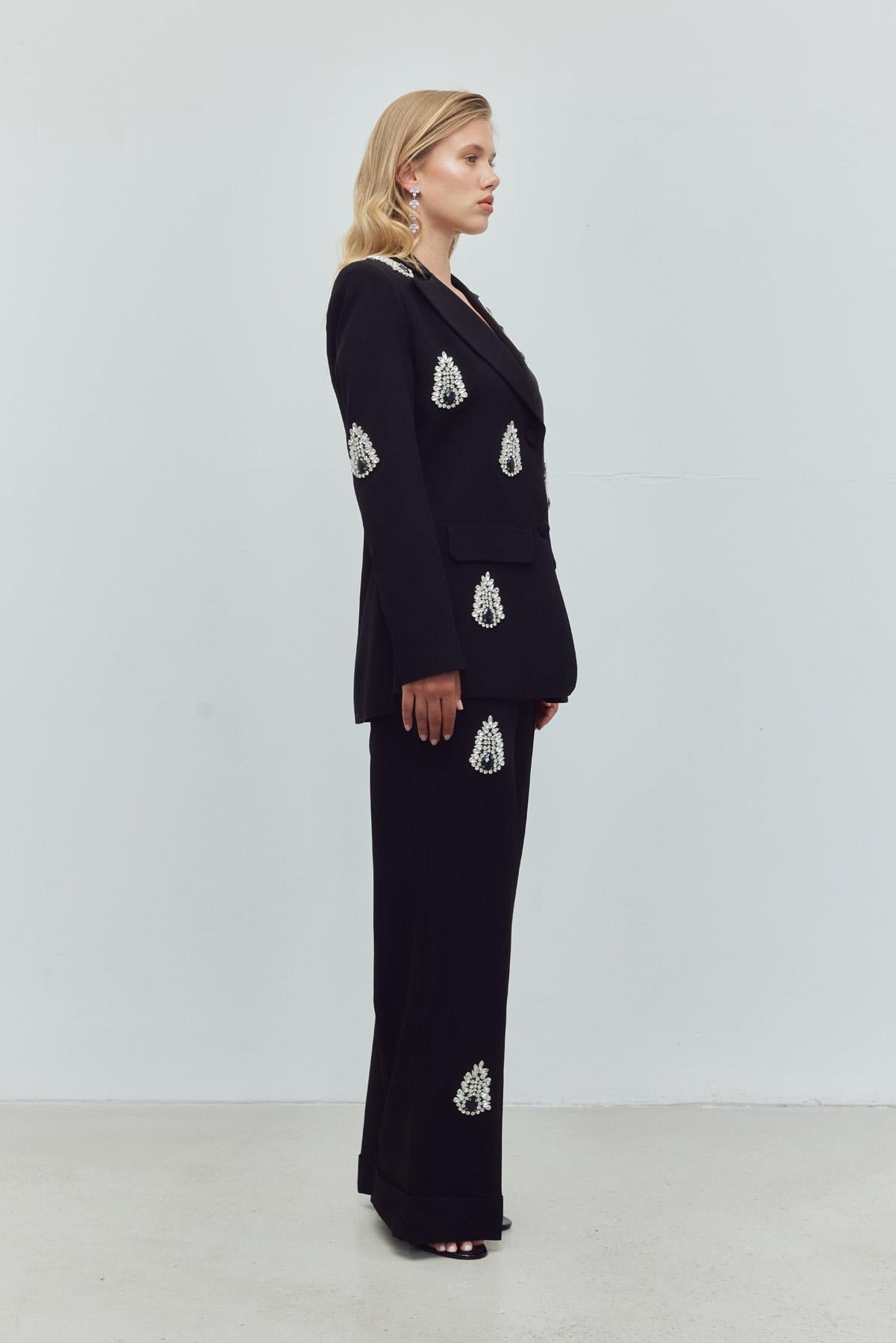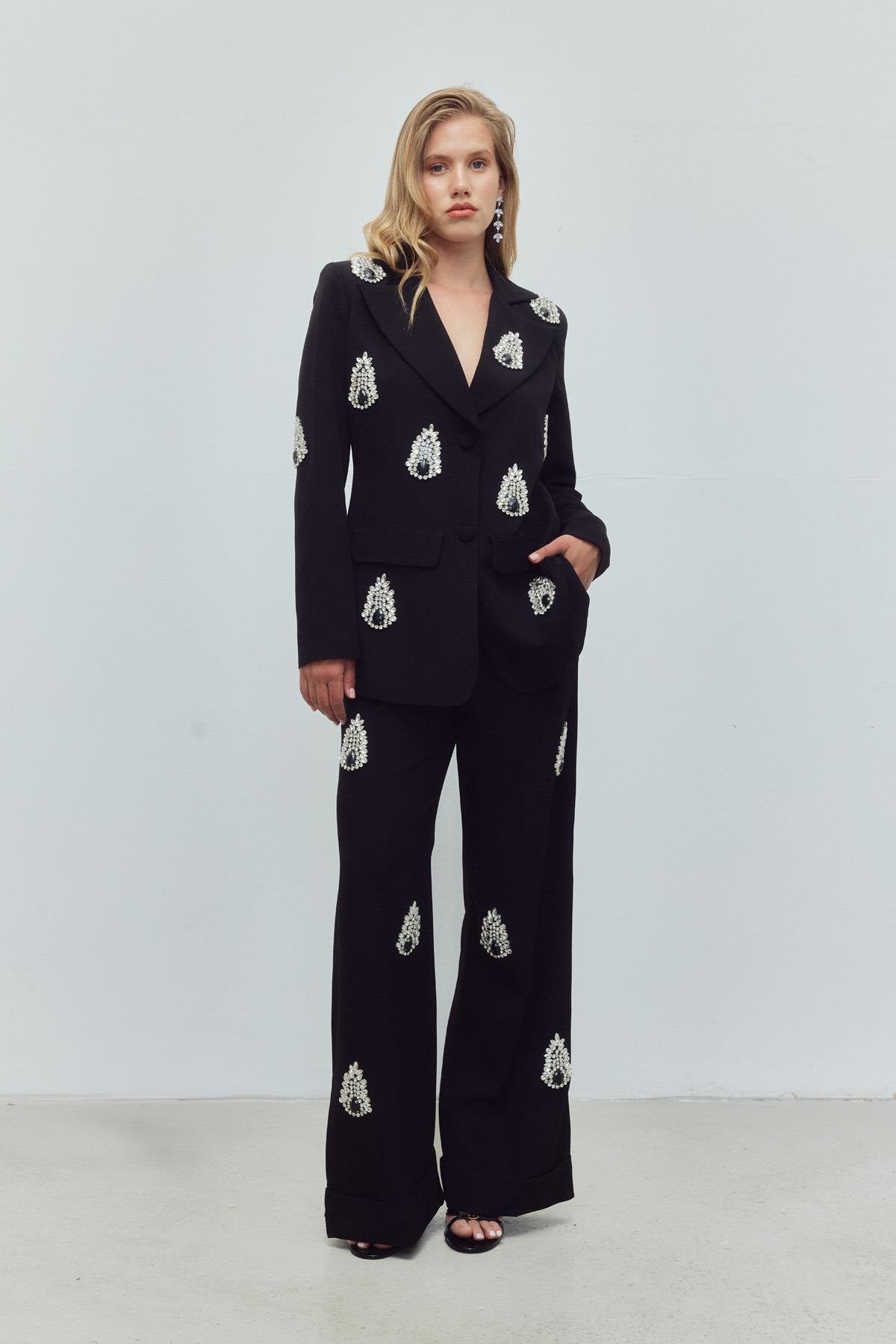 A statement set defined by refined detailing and modern elegance. Designed with delicate embellishments, this suit elevates classic tailoring into a distinctive, evening-ready silhouette. The fluid modal blend offers comfort and ease of movement, balancing sophistication with wearability.