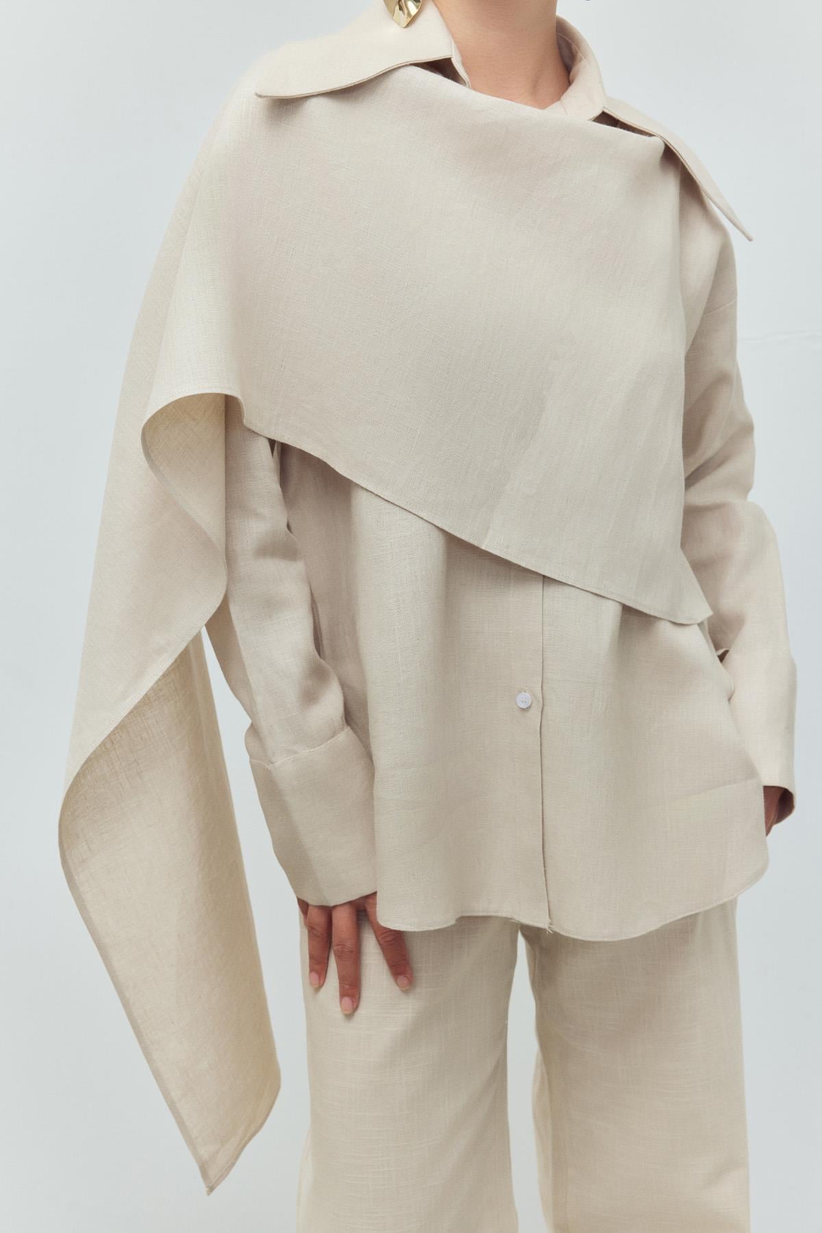 A modern set defined by its fluid structure and architectural silhouette. The cape-detailed top introduces a distinctive, sculptural layer that elevates the classic suit concept, while maintaining effortless movement. Paired with straight-leg trousers, the look remains clean, balanced, and refined. The soft beige tone enhances its understated elegance, making it a versatile choice from office settings to evening occasions.