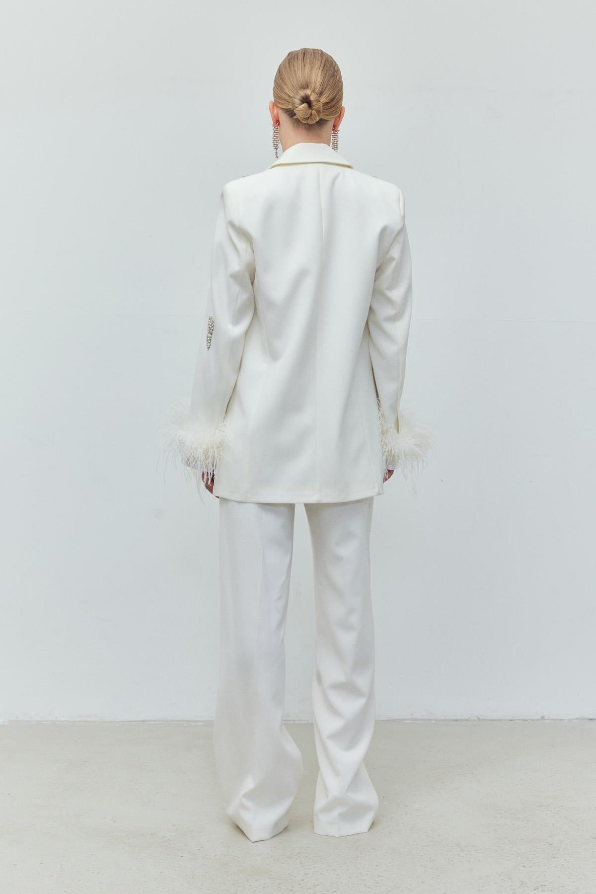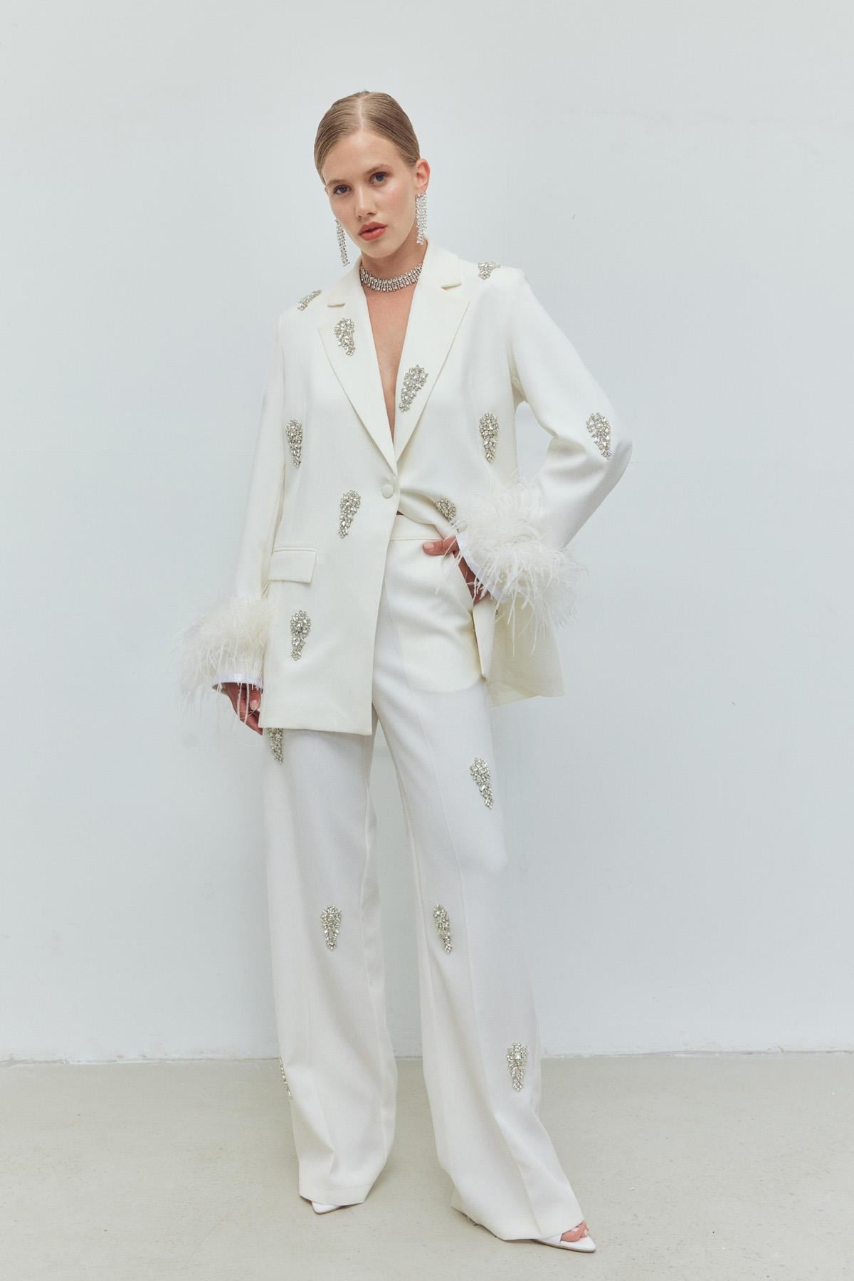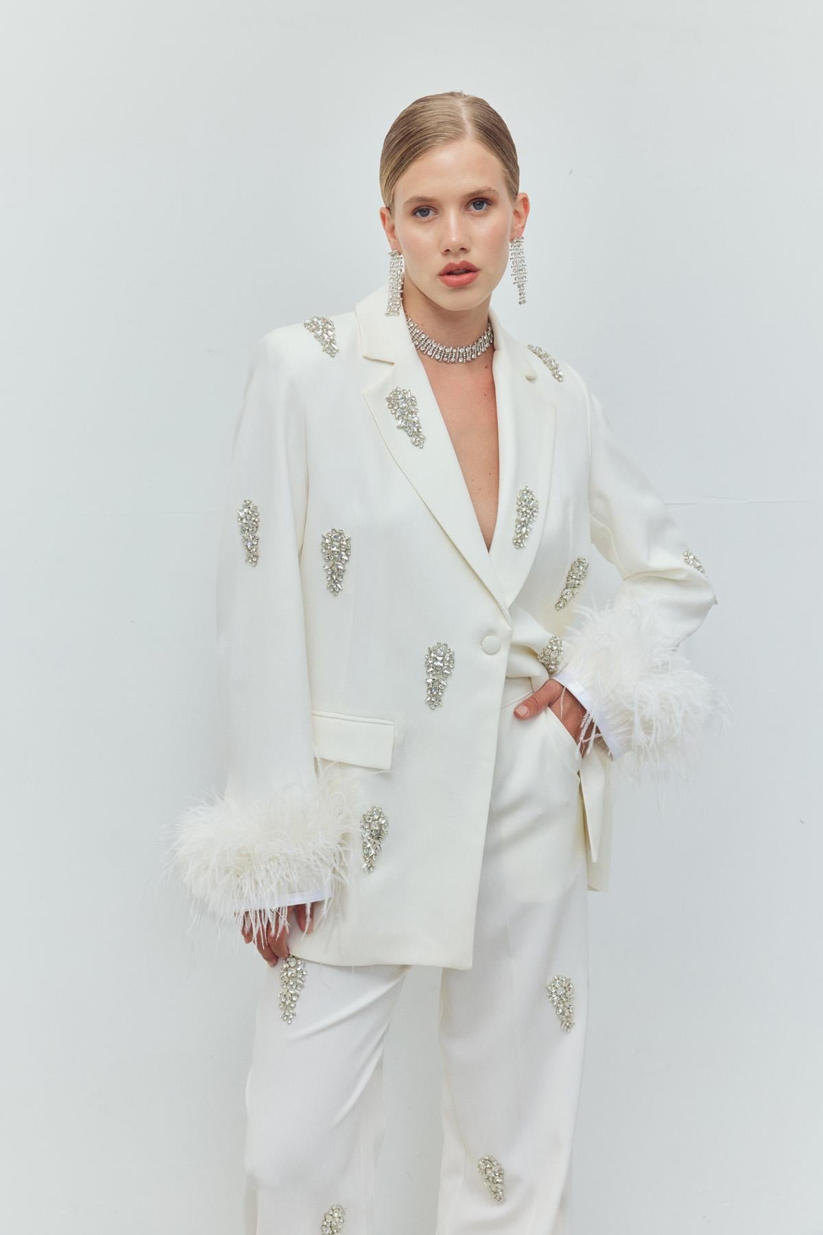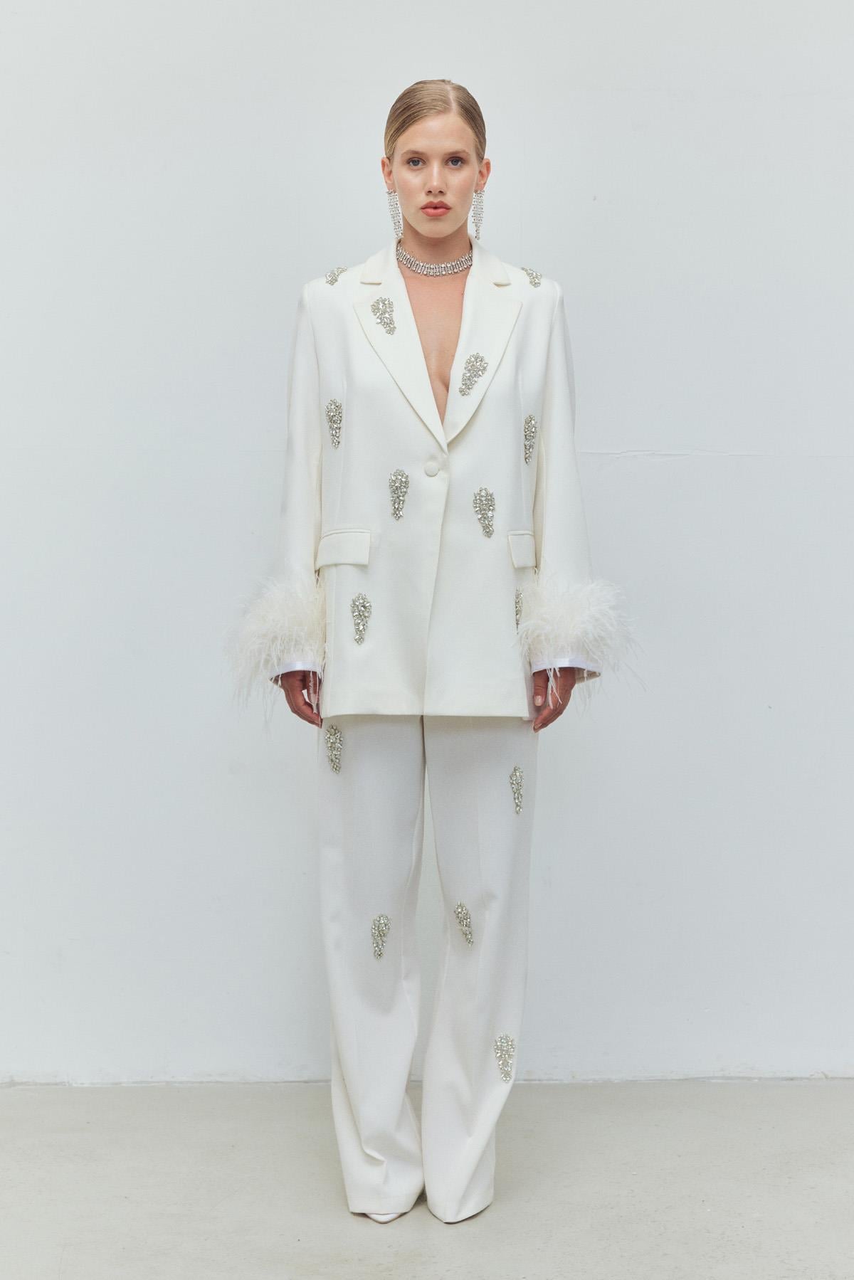 A statement set defined by refined detailing and modern elegance. Designed with delicate embellishments, this suit elevates classic tailoring into a distinctive, evening-ready silhouette. The fluid modal blend offers comfort and ease of movement, balancing sophistication with wearability.