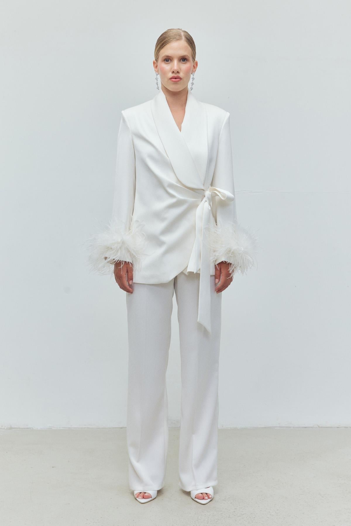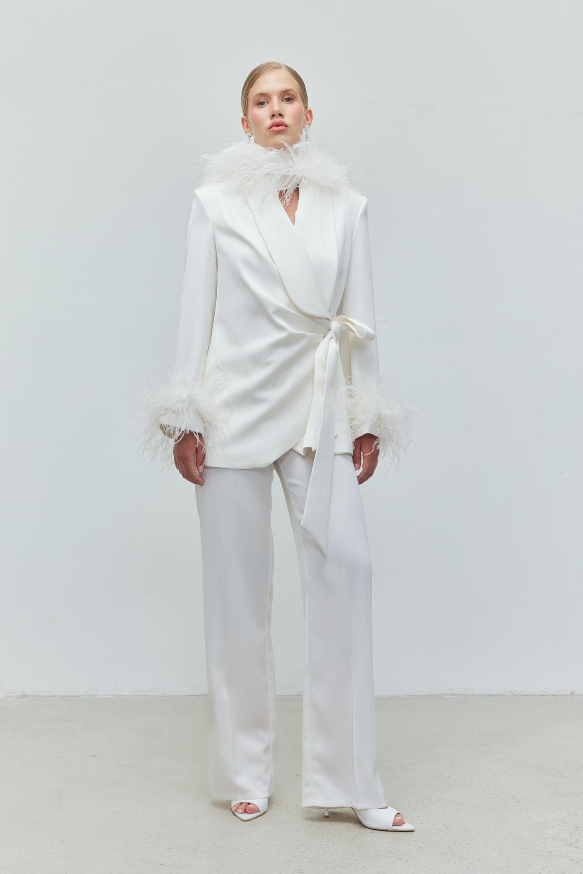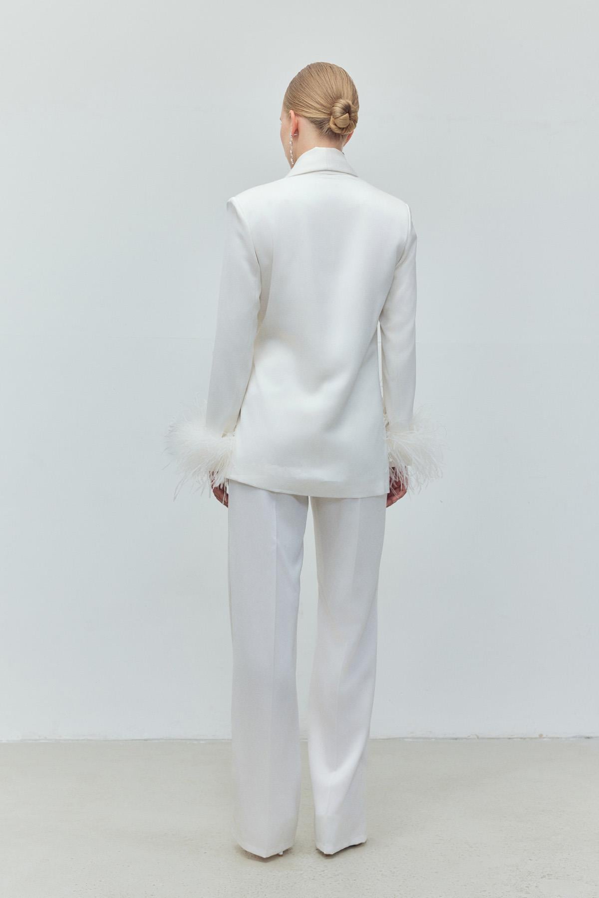 A statement set defined by refined detailing and modern elegance. Designed with delicate feather on the collar, this suit elevates classic tailoring into a distinctive, evening-ready silhouette. The fluid modal blend offers comfort and ease of movement, balancing sophistication with wearability.