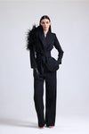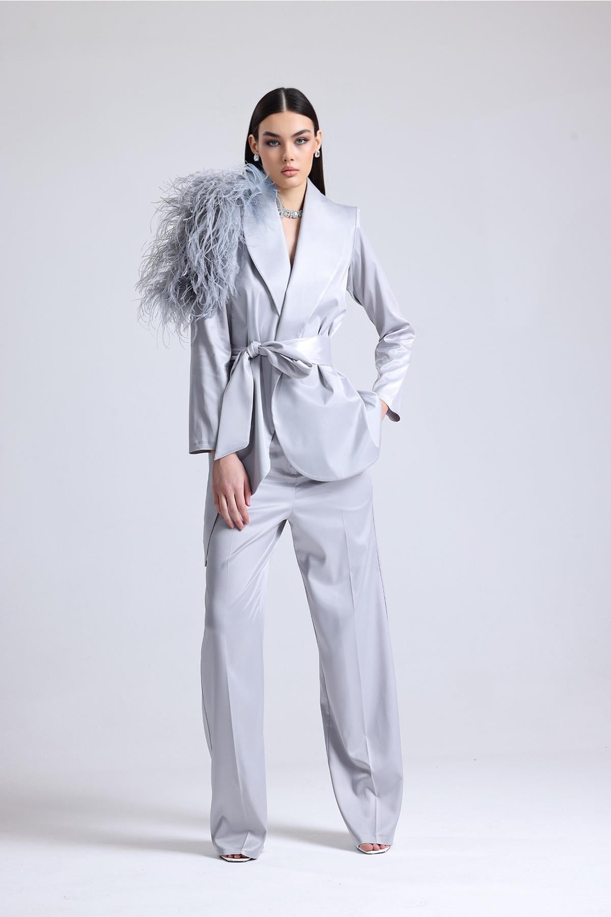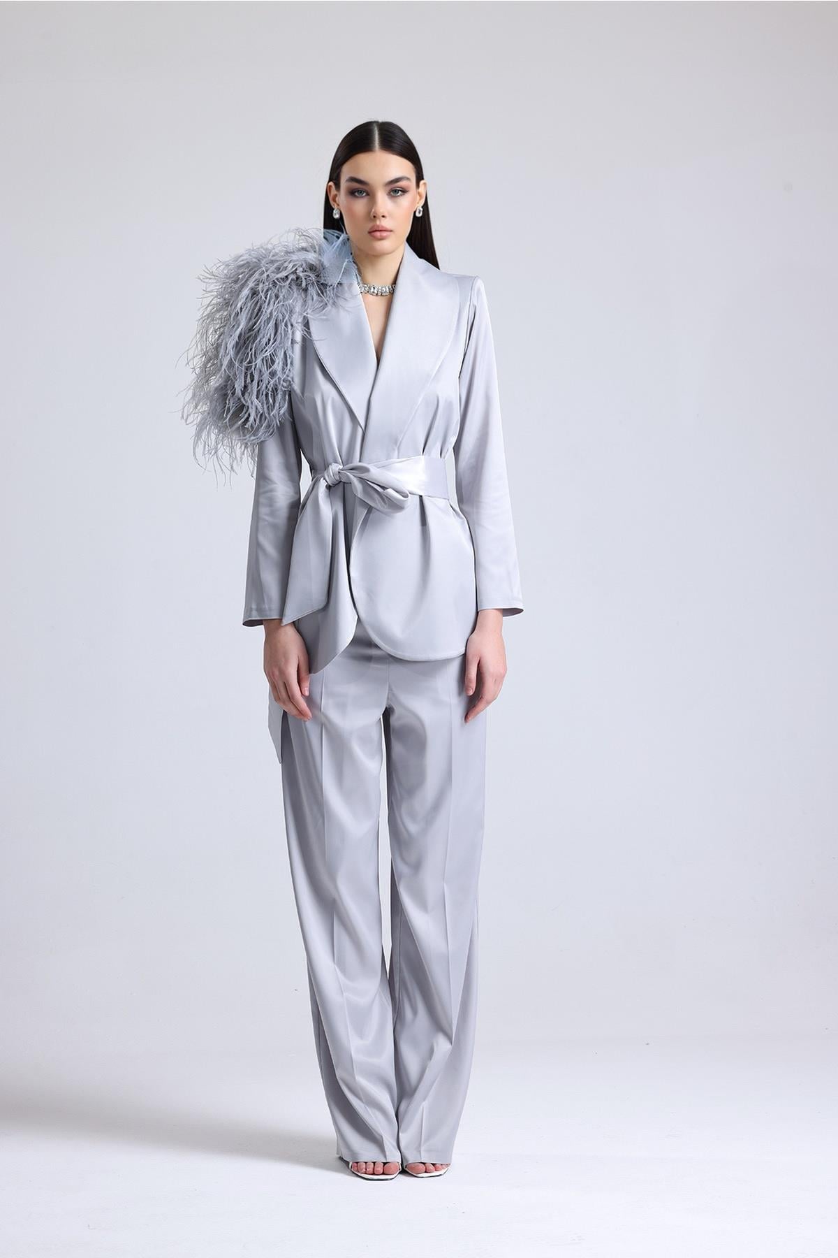 A statement ensemble defined by refined elegance and bold detailing. Crafted from a smooth, fluid satin fabric, this set offers a luxurious drape that enhances movement and comfort. The feather accent on the shoulder introduces a distinctive, fashion-forward element, while the rich brown tone adds depth and sophistication to the overall look. Designed for those who seek both style and ease, it transitions effortlessly from elevated daywear to evening occasions.