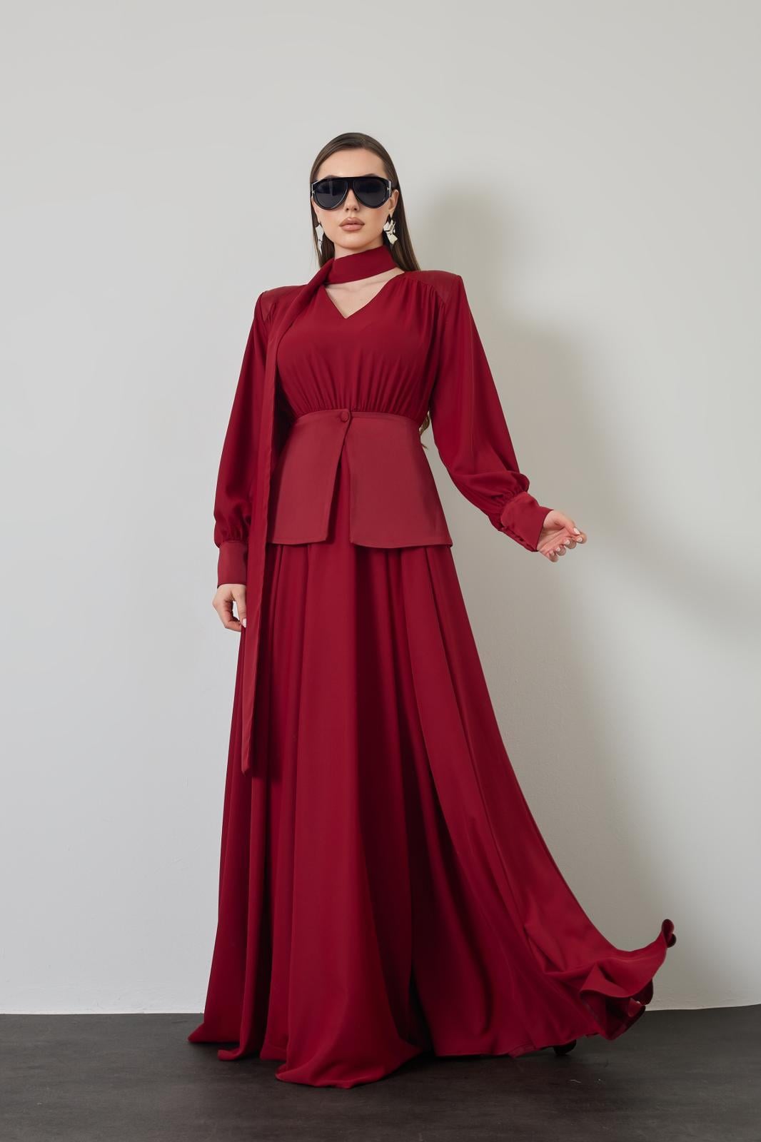 A refined dress designed with a harmonious blend of satin and chiffon, creating a soft, fluid silhouette with an elegant finish. The interplay of textures adds depth and movement, while the lightweight construction ensures comfort throughout the day. Its rich burgundy tone enhances the overall sophistication, making it an ideal choice for both formal occasions and elevated everyday styling.