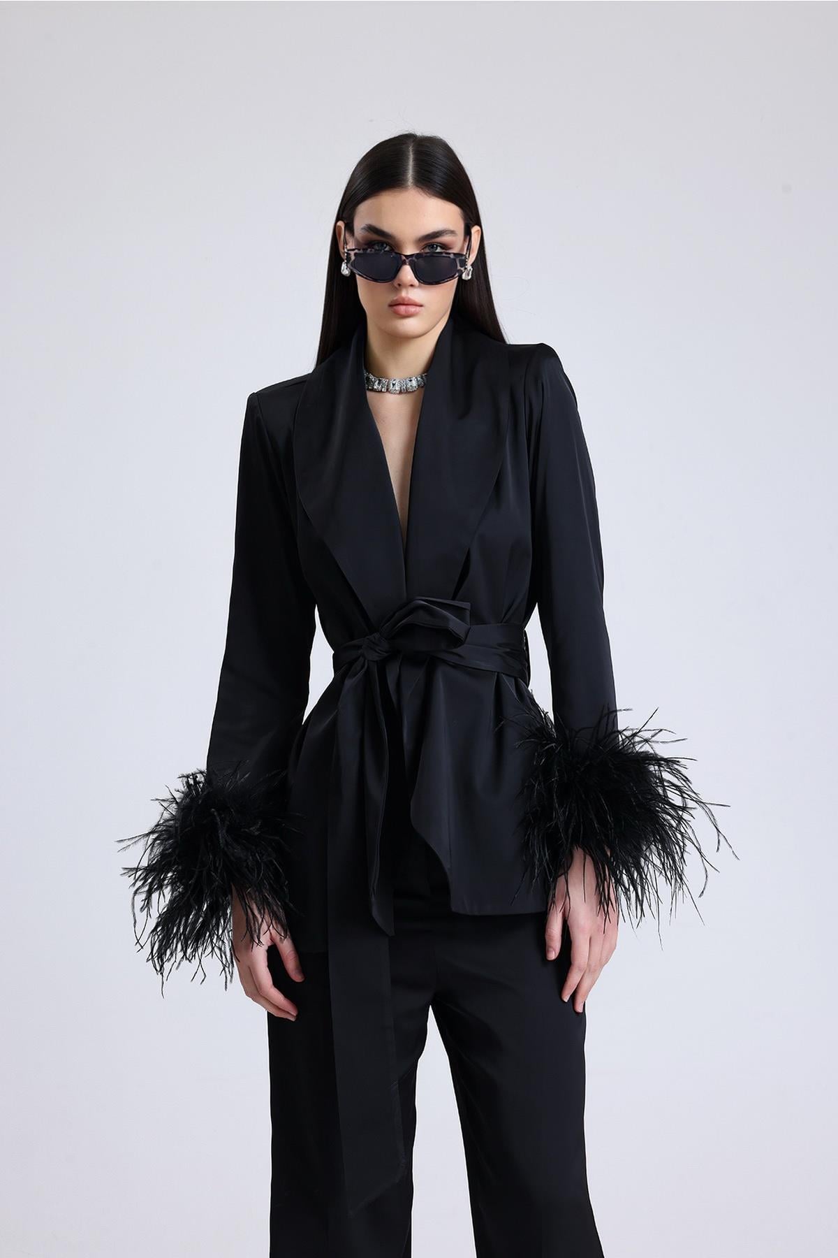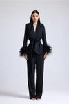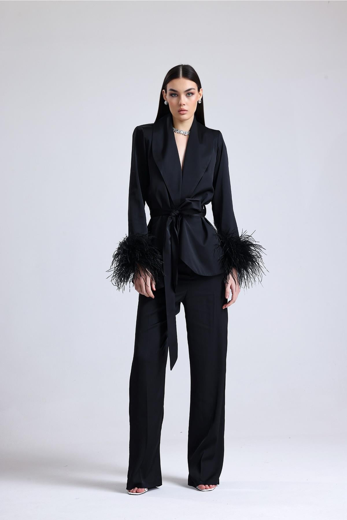 An elegant ensemble that blends refined tailoring with expressive detailing. Crafted from a smooth satin-textured fabric, this set offers a fluid drape and lightweight comfort throughout the day. The feather accents along the sleeves add a distinctive and sophisticated touch, while the deep brown tone enhances its timeless appeal. Designed for versatility, it transitions seamlessly from polished daytime looks to elevated evening styling.