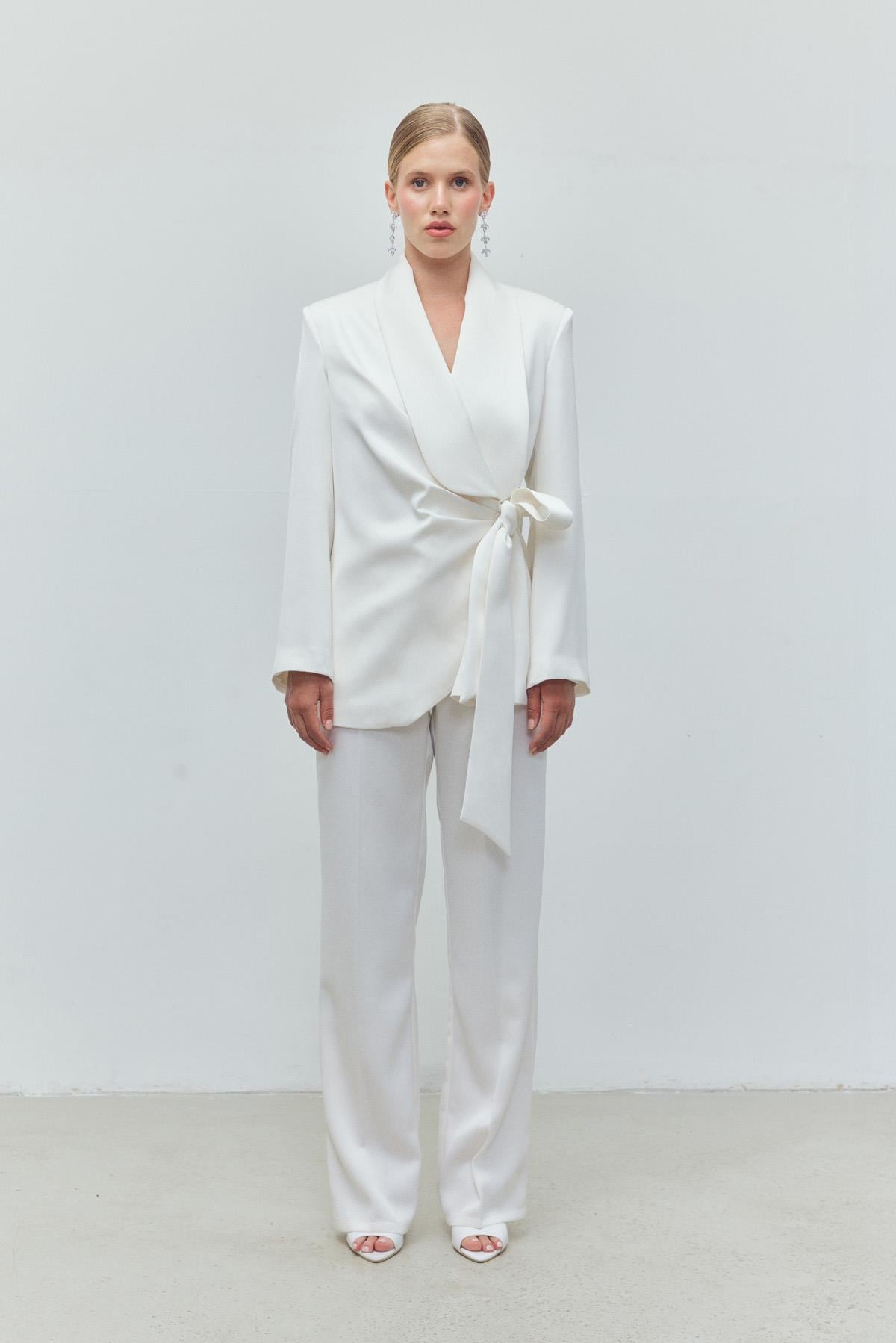 A refined set crafted with a fluid, satin-like texture that drapes elegantly over the body. The wrap-style jacket features a soft shawl collar and a waist tie that creates a subtle, feminine definition, while maintaining a clean and modern silhouette. Paired with relaxed, straight-leg trousers, the look balances structure with effortless movement. Designed for women who prefer understated strength with polished simplicity.