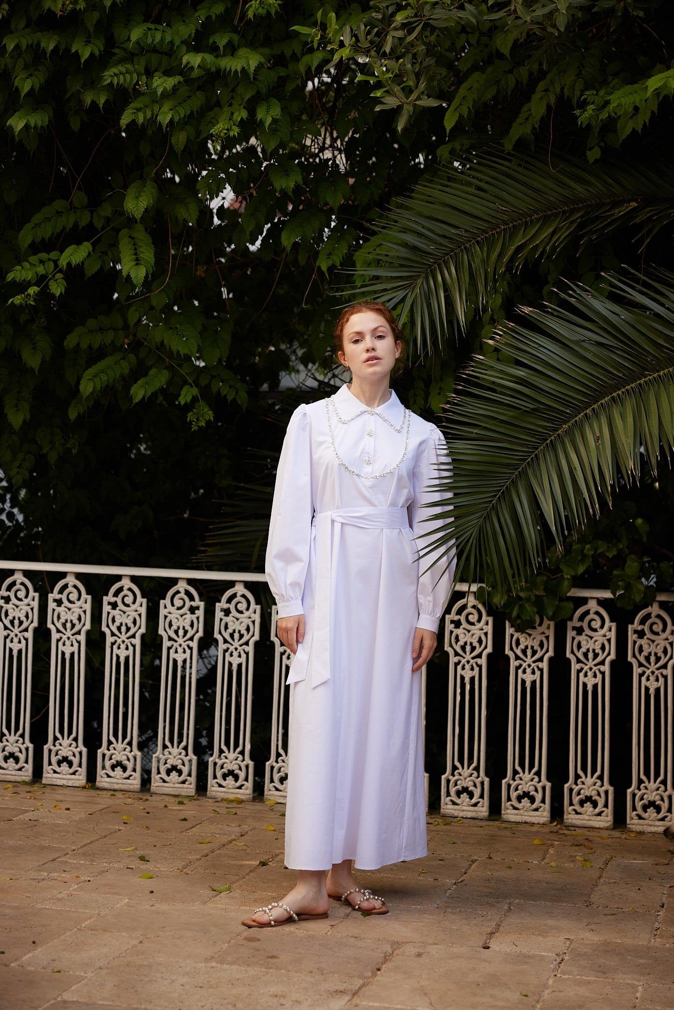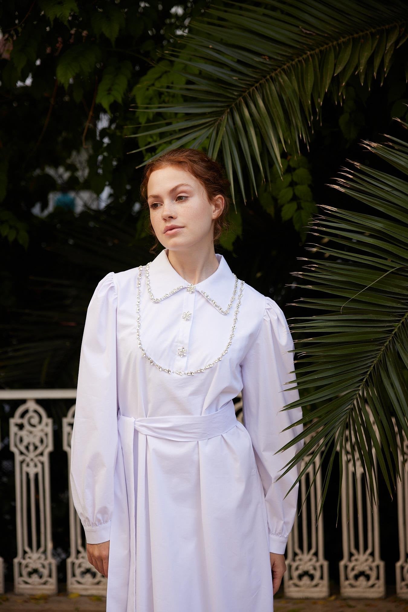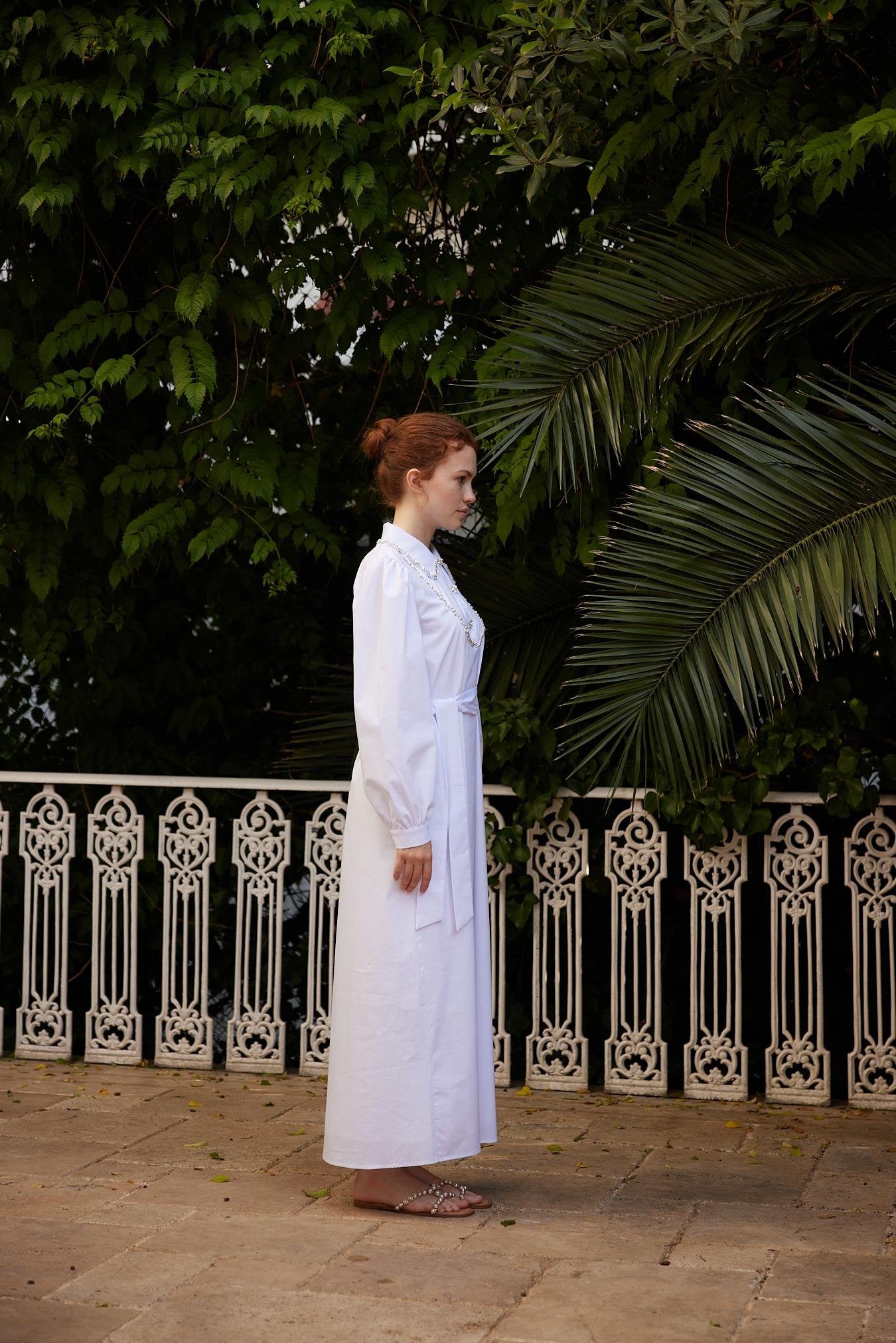 Designed for spring–summer elegance, the Beryllus dress embodies timeless femininity with a refined, contemporary spirit. Crafted from woven fabric, this flowing maxi silhouette is elevated by its delicate decorative detailing along the collar and front, adding a subtle sense of sophistication while remaining effortlessly wearable. The softly structured shoulders and long sleeves balance the fluid drape of the skirt, creating a poised and graceful look suitable for daytime events, garden gatherings, or elevated everyday wear. Finished with a self-tie waist belt, the design allows for a softly defined silhouette while maintaining comfort and ease.
