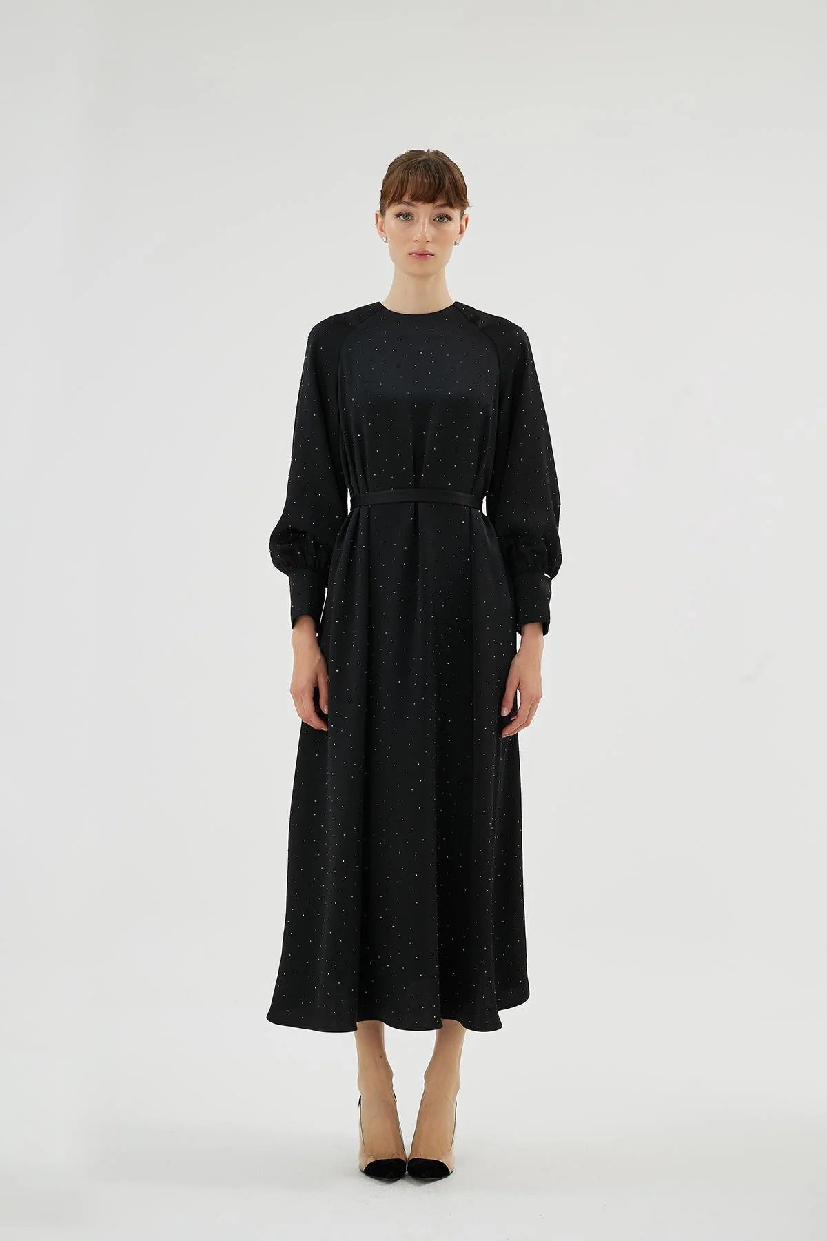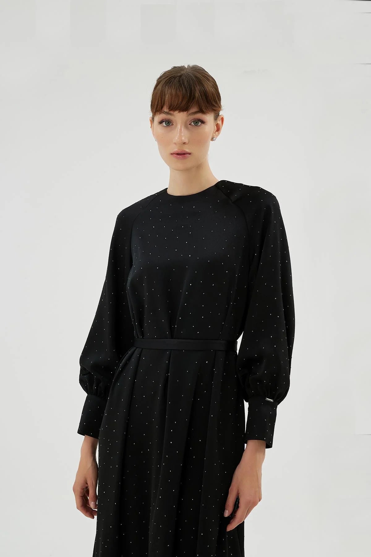 The Eliza Dress combines modern elegance with subtle detailing, featuring a refined raglan sleeve construction that softly defines the shoulder line while ensuring ease of movement. Delicate crystal embellishments are scattered across the fabric, catching light from every angle and adding a soft, understated shimmer.