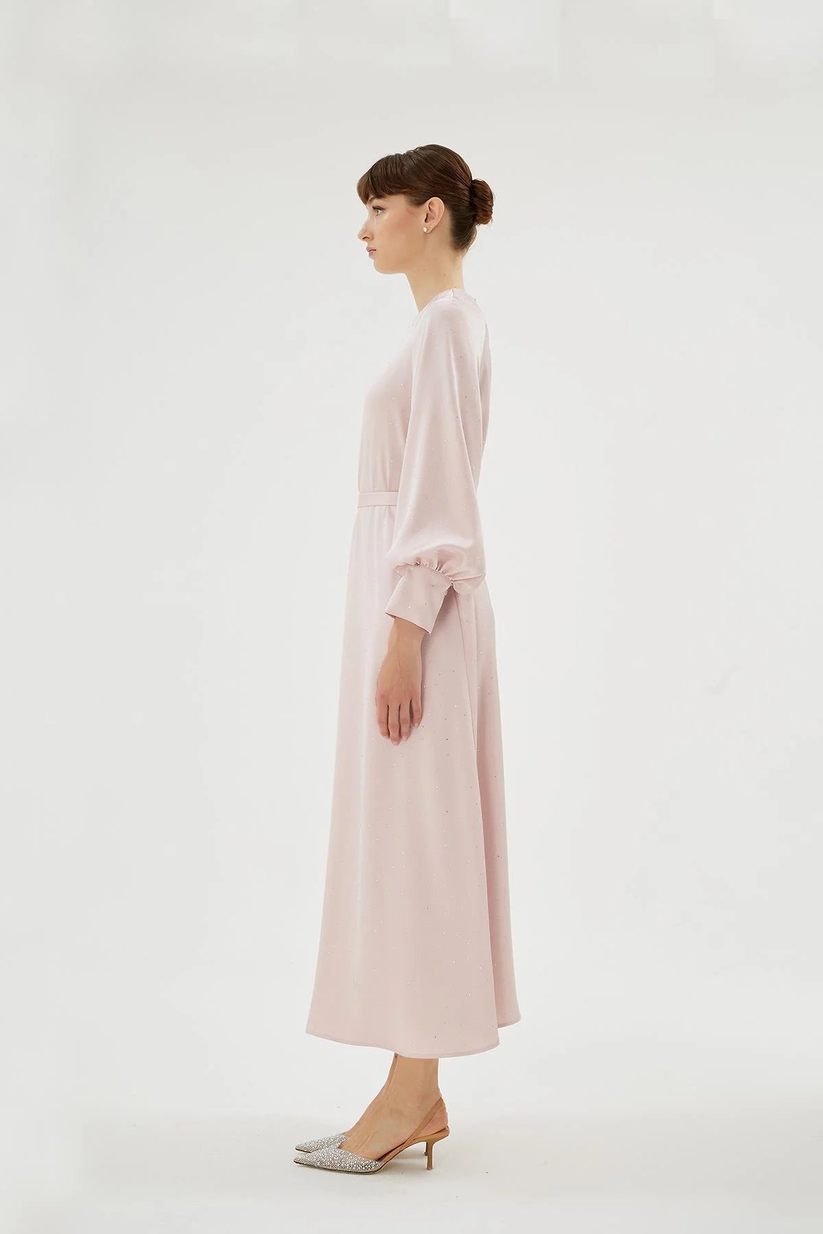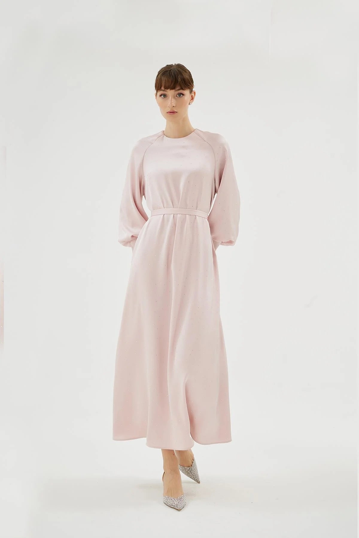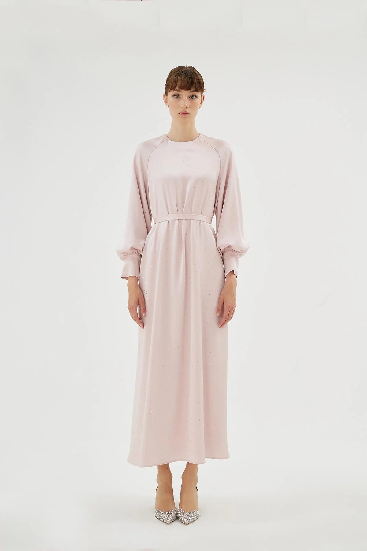 The Eliza Dress is a refined expression of modern elegance, designed with a soft raglan sleeve construction that gently shapes the shoulders while offering comfort and ease of movement. The surface is delicately adorned with subtle crystal embellishments, creating a light-catching effect that adds a sophisticated, understated shimmer.