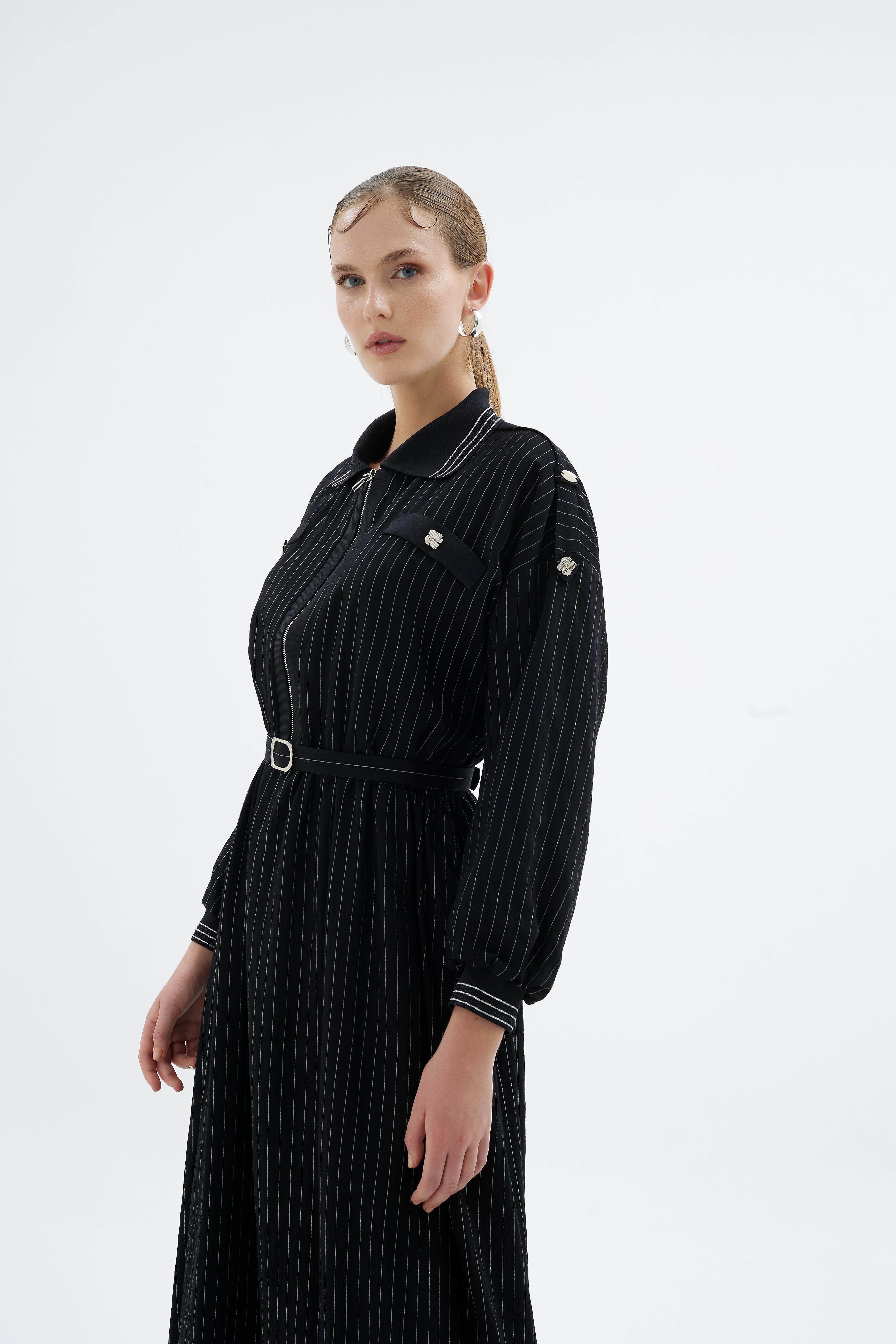A modern interpretation of the classic shirt dress, this piece blends structured tailoring with refined detailing. The clean zip-front design is complemented by a тонкий belt that defines the waist, while subtle metallic pinstripes add depth and understated sophistication.