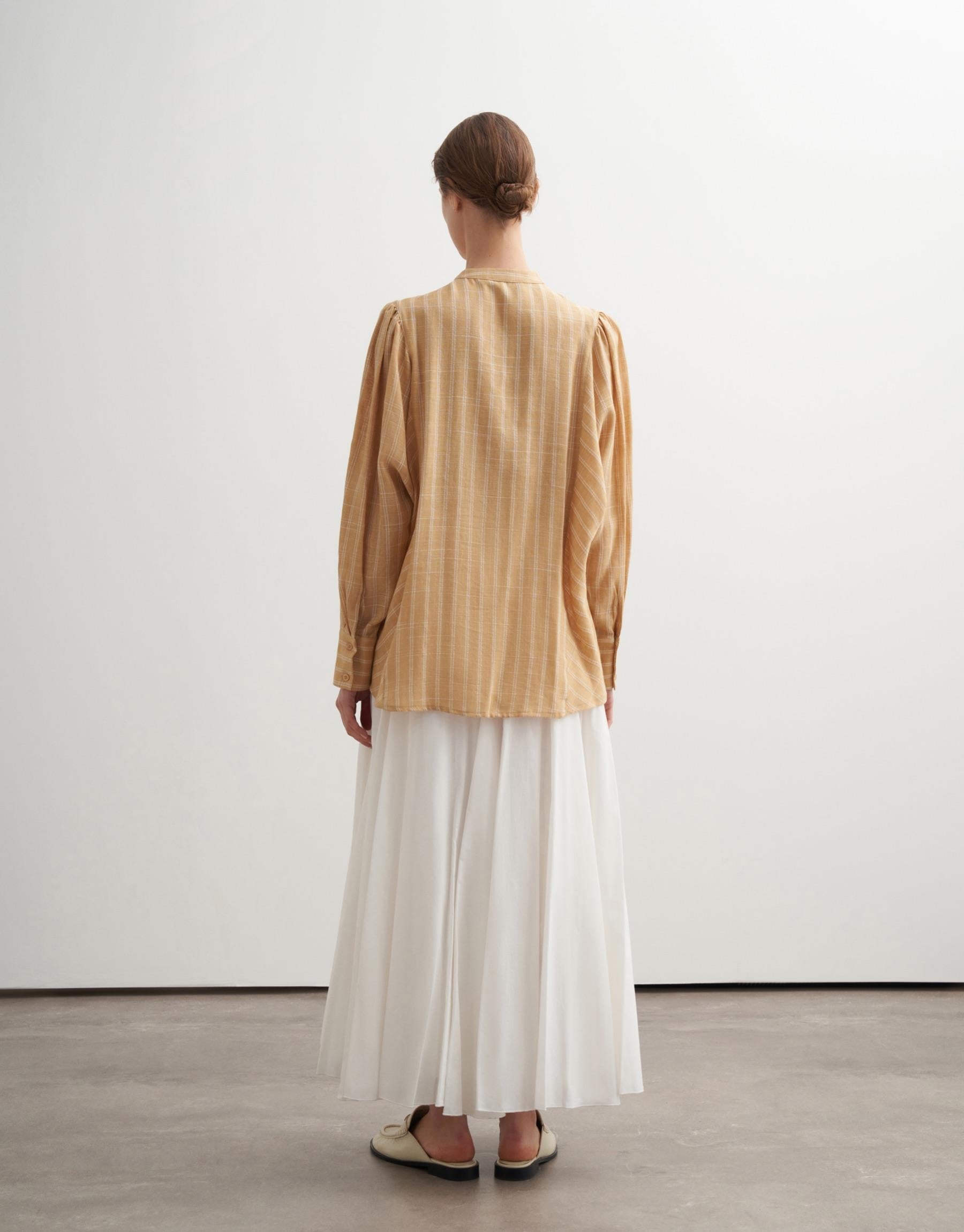A soft and feminine silhouette defined by subtle tailoring and delicate structure. This shirt features a refined stand collar and gentle vertical patterning, while the gathered sleeve detail adds volume and movement. The wide cuffs enhance the overall balance, creating a polished yet relaxed aesthetic suitable for both everyday and elevated styling.