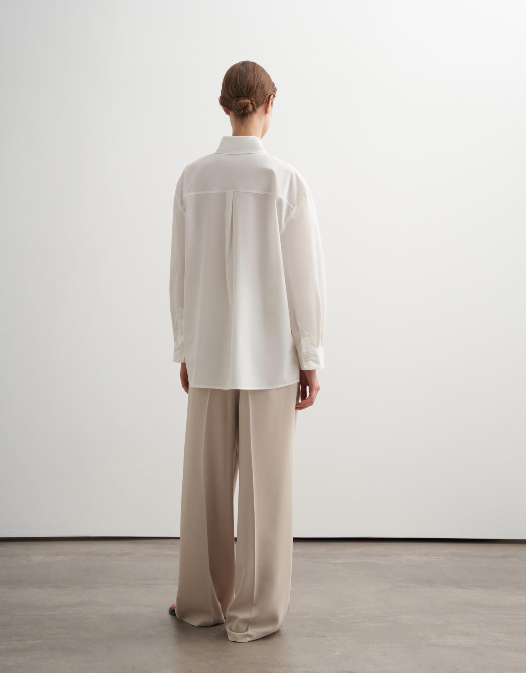A refined reinterpretation of a classic shirt, elevated with a subtle yet distinctive metal buckle detail that shapes the silhouette. The clean front button closure is balanced by a softly structured drape, while the dropped shoulders enhance its relaxed, contemporary feel. Designed for understated sophistication, this piece transitions seamlessly from minimal daywear to polished evening looks.