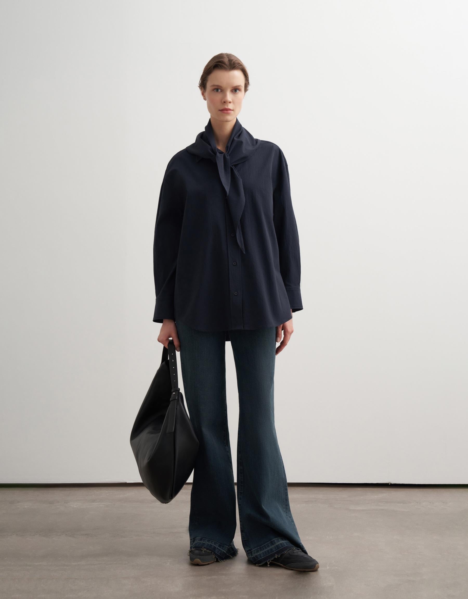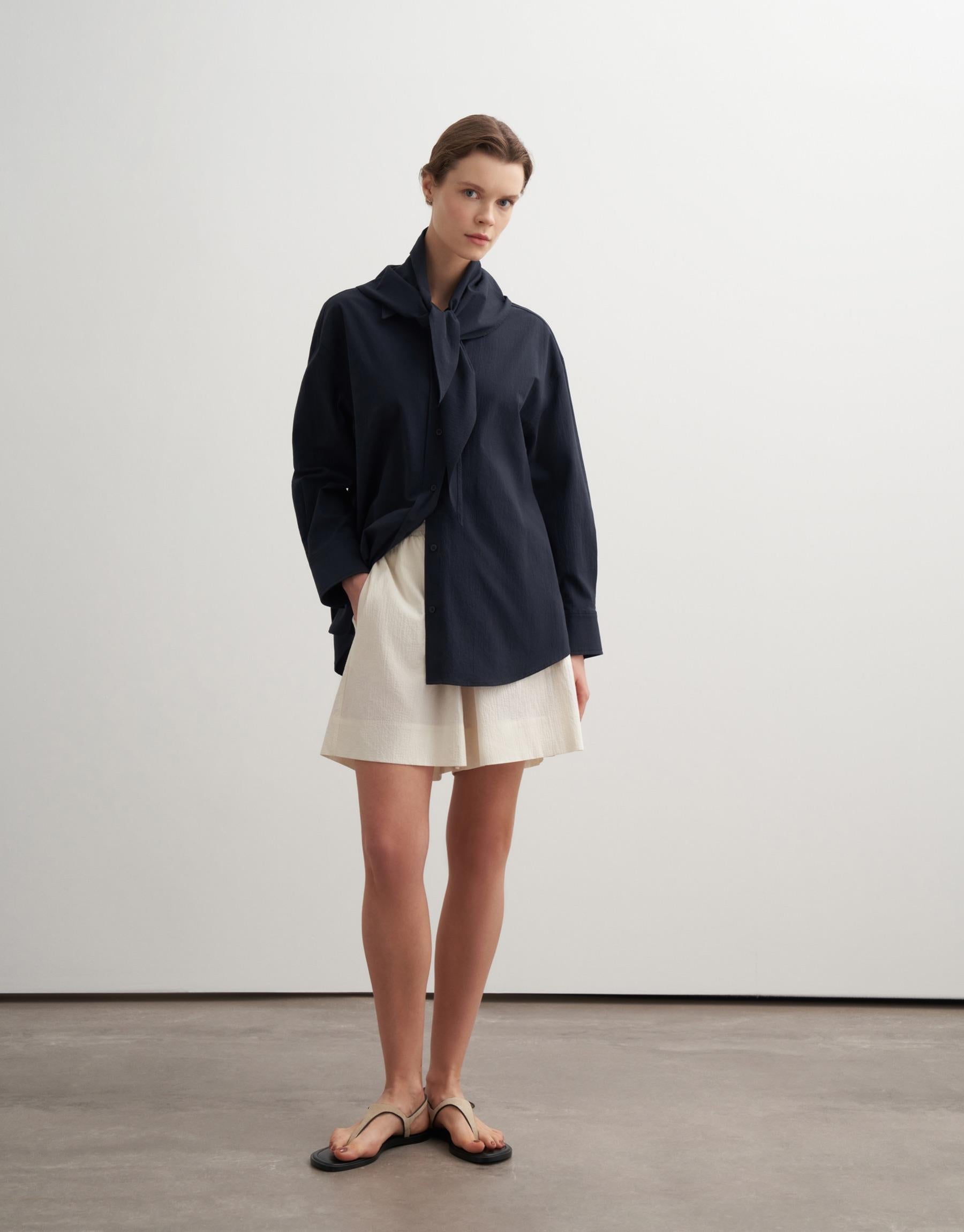 A refined balance between classic tailoring and relaxed elegance, this textured cotton shirt is elevated by its integrated scarf detail. The soft drape of the scarf adds movement and styling versatility, while the subtle fabric texture brings depth to a clean, minimal silhouette. Designed with an oversized fit and dropped shoulders, it offers effortless sophistication for both everyday wear and elevated looks.