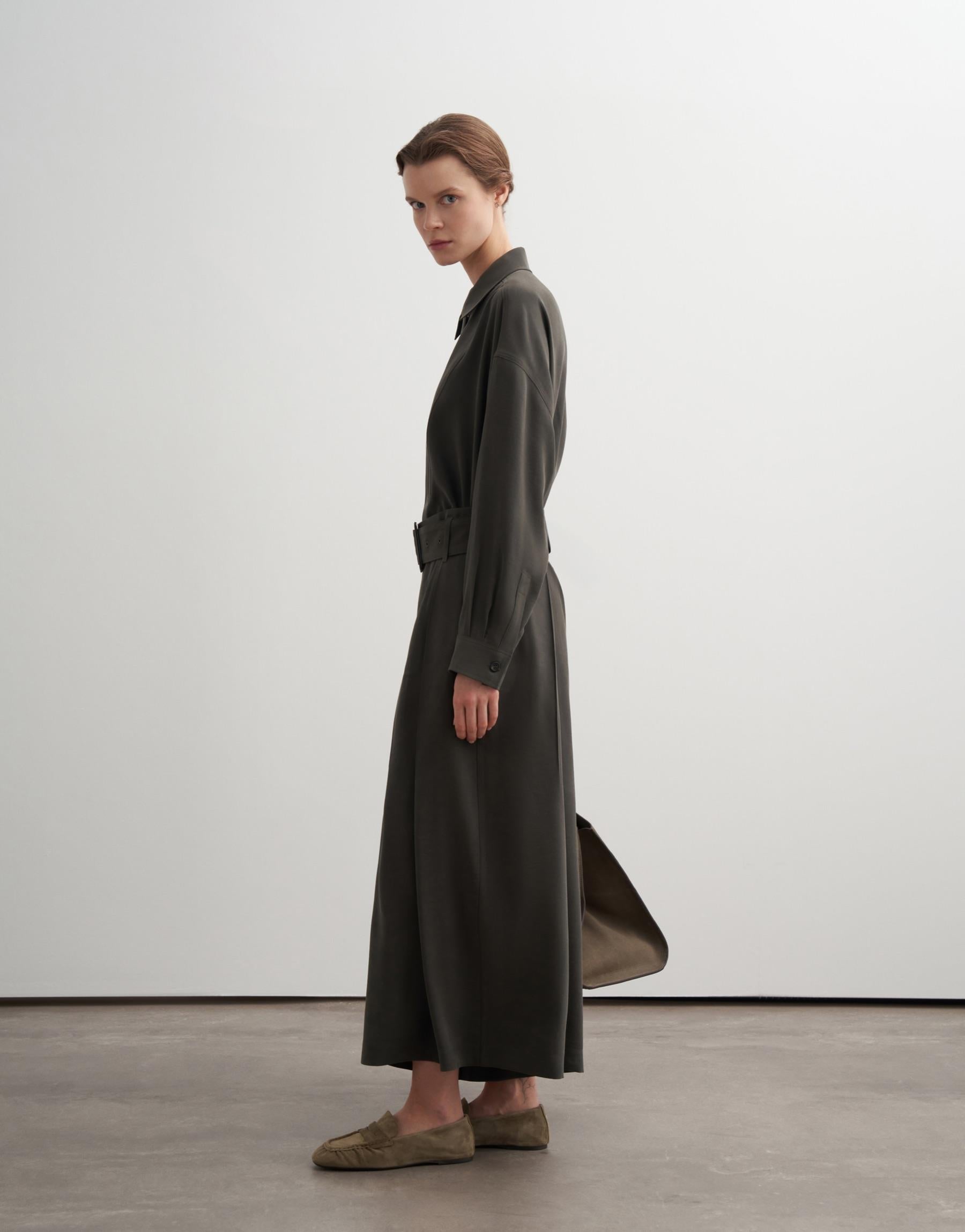 Fit: Relaxed, fluid silhouette with concealed placket and zipper closure