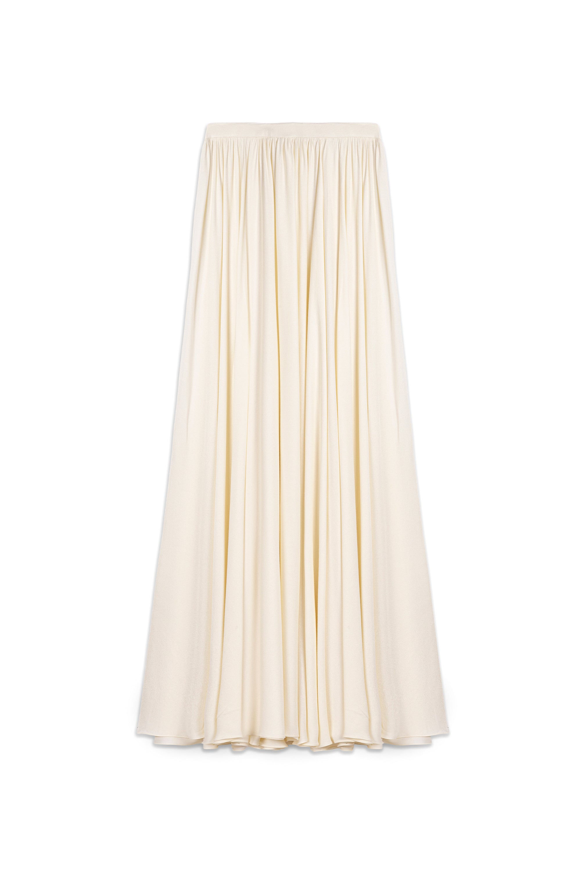 This elegant full circle skirt is designed with a gathered waist to create generous volume and fluid movement. Crafted in a double full circle construction, it features a structured waistband and a discreet side zip, offering a refined balance between softness and shape. The lightweight, draped fabric flows effortlessly while maintaining an elevated, minimalist silhouette.