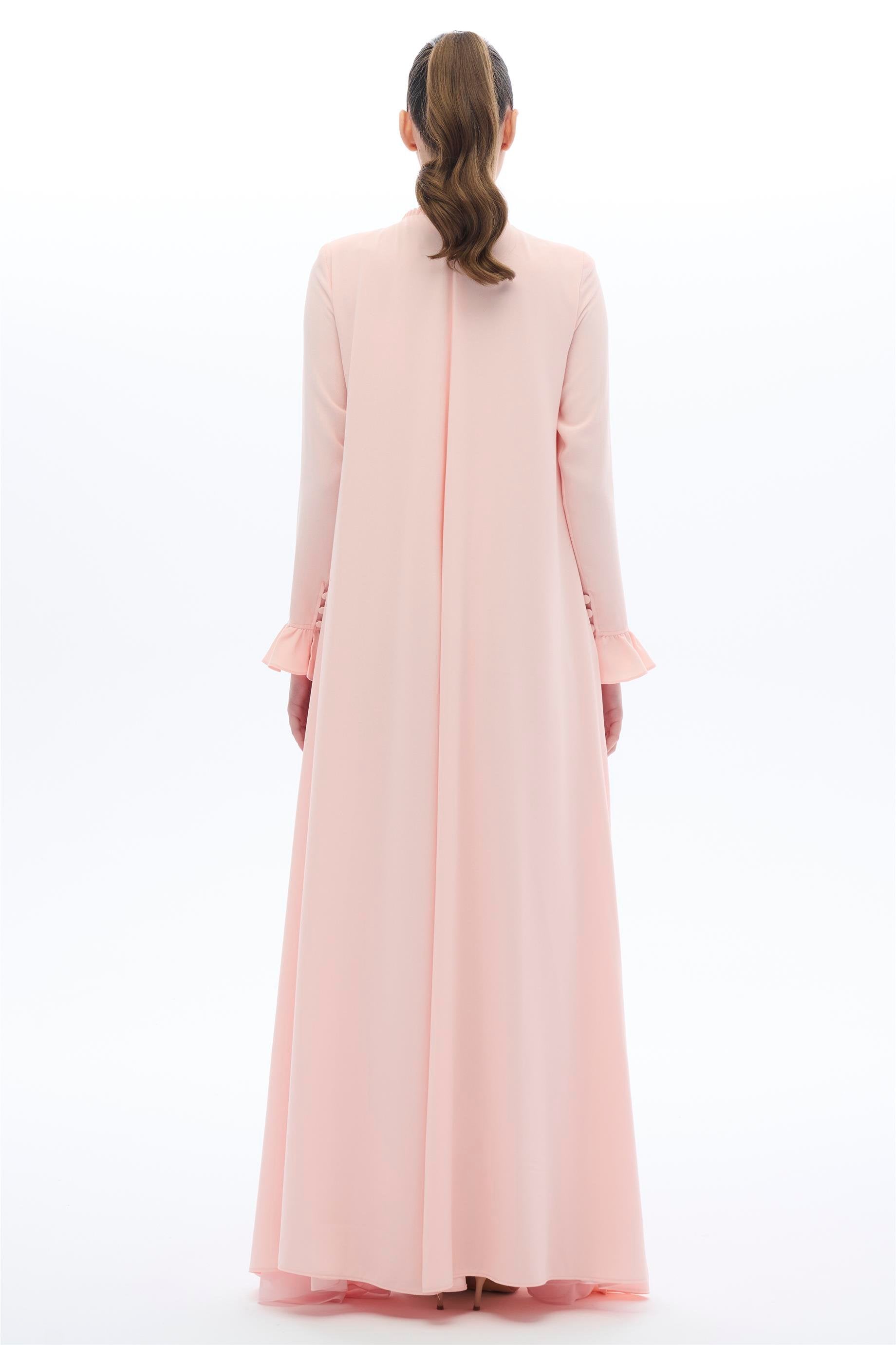 Изысканное макси-платье с каскадной оборкой, которая плавно спускается по диагонали от плеча к подолу. Высокий вырез с нежными сборками и мягко расклешённые манжеты добавляют утончённости, а плавный силуэт обеспечивает грациозное движение.