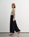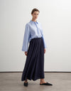 A refined interpretation of fluid tailoring, these trousers combine the elegance of a skirt with the practicality of pants. Designed with a high-rise, adjustable elastic waistband, the silhouette falls into a soft, voluminous shape that moves effortlessly with the body. The lightweight viscose fabric enhances the drape, creating a graceful and elongated line.