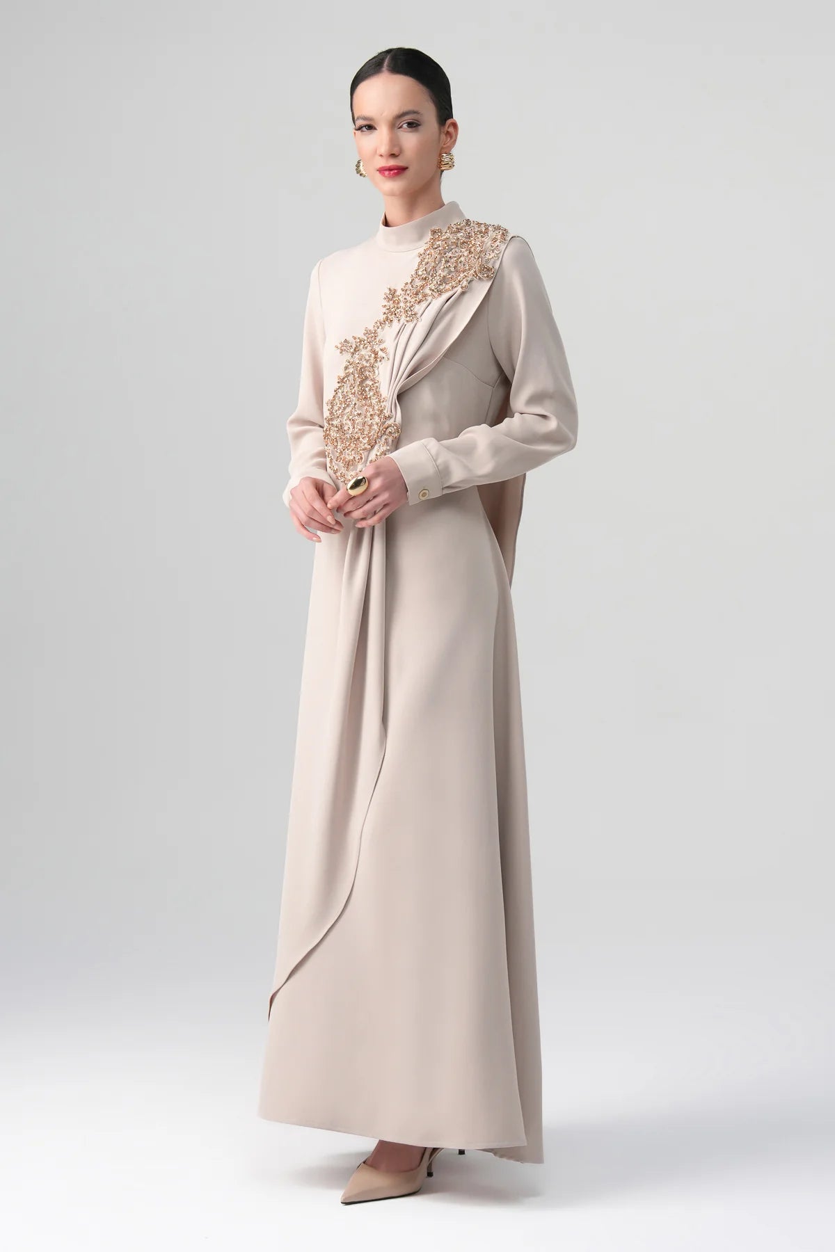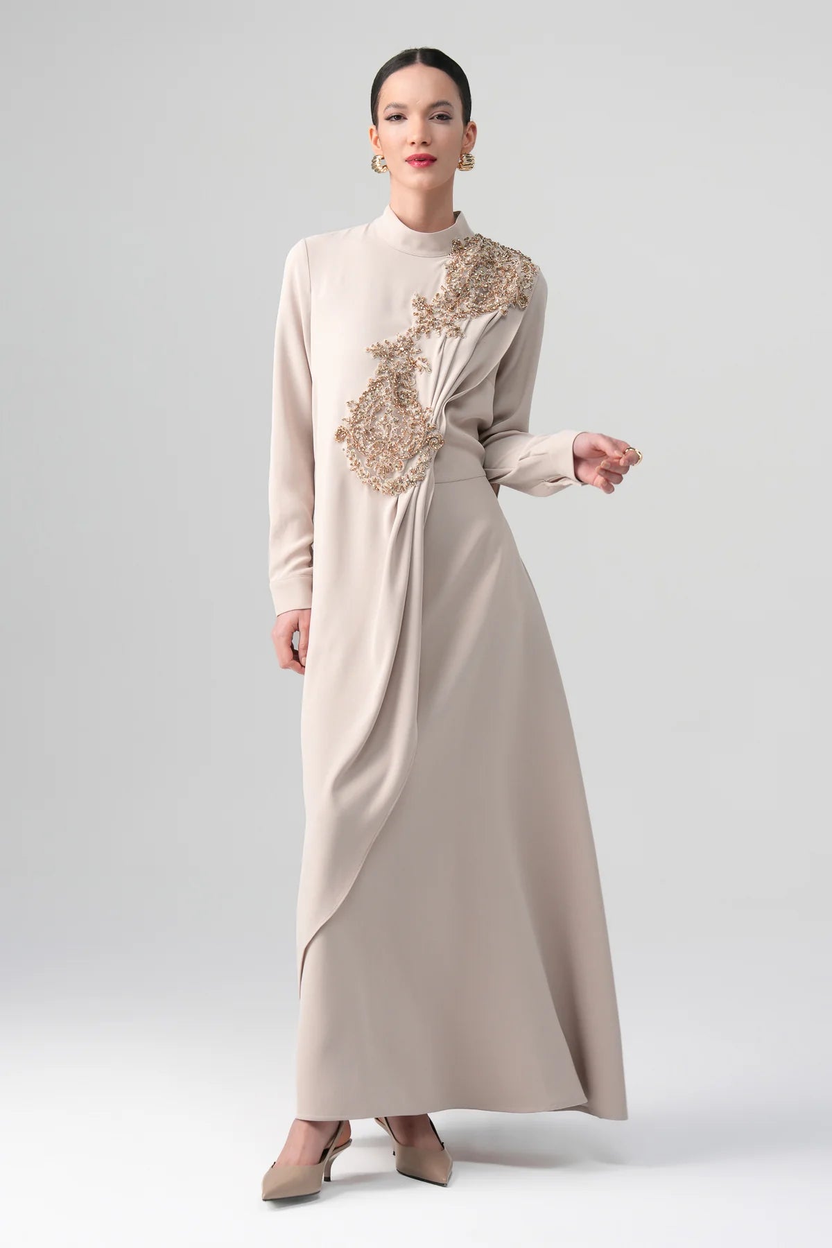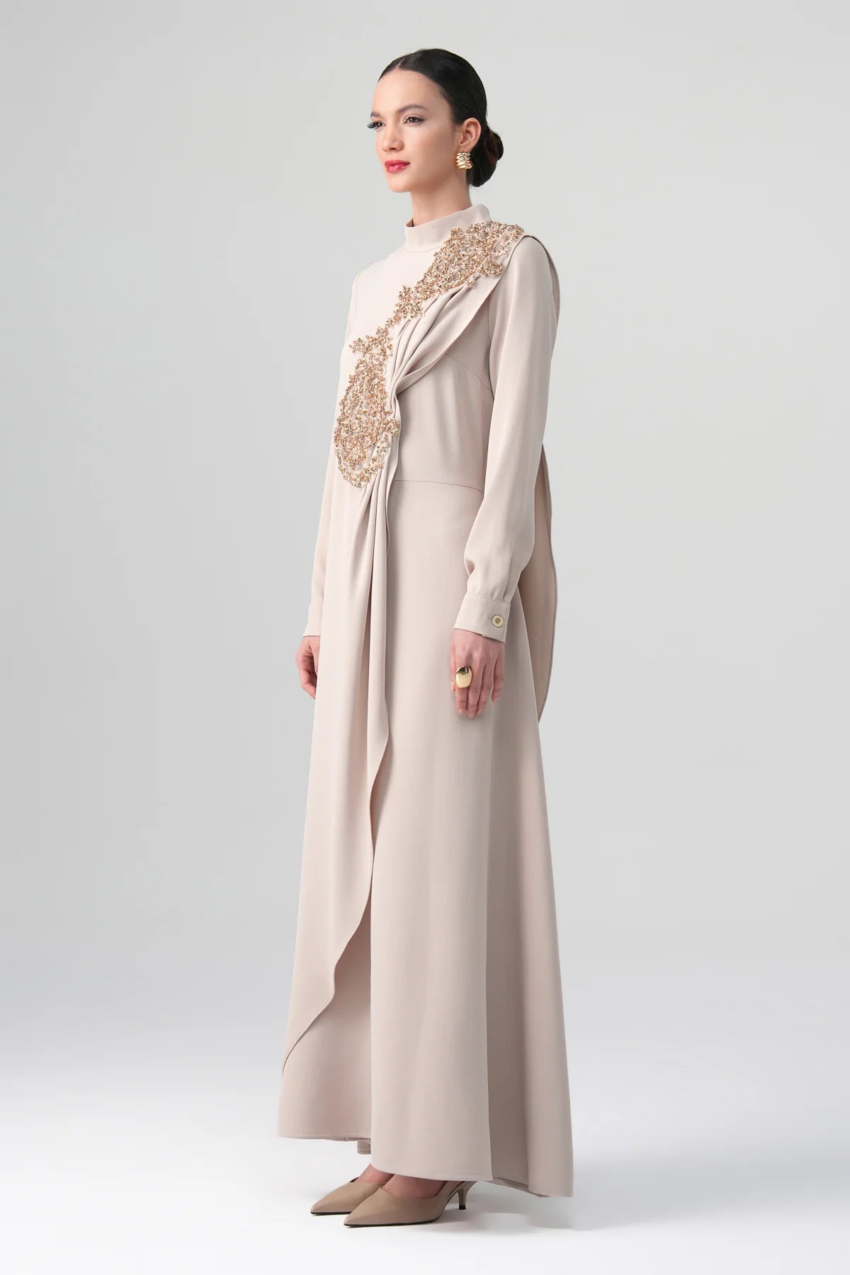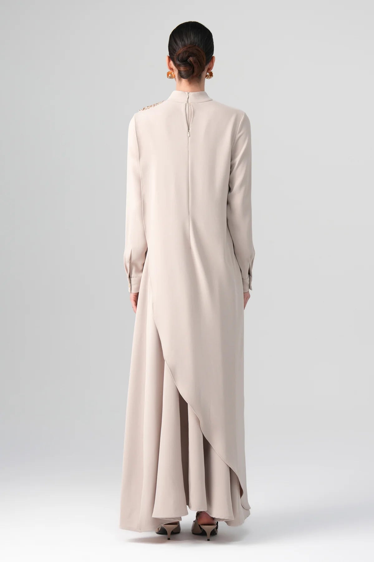 A refined silhouette shaped by soft draping and fluid movement. This design features an asymmetric layered front enhanced by intricate embellishment, creating a delicate focal point while maintaining a clean, modern aesthetic. The elongated form and structured neckline balance elegance with quiet sophistication.