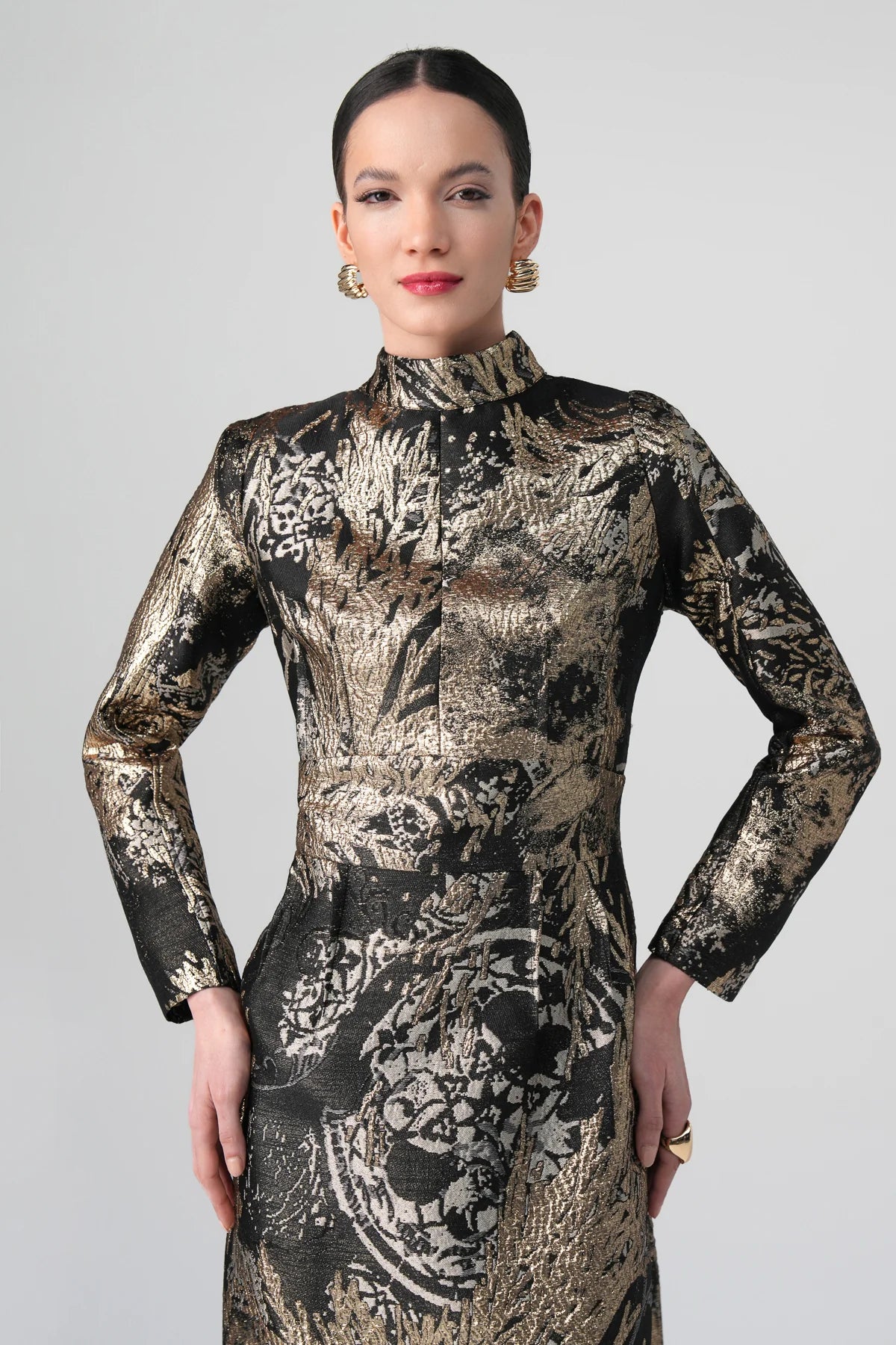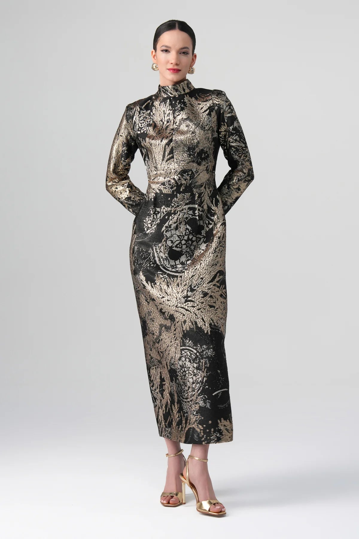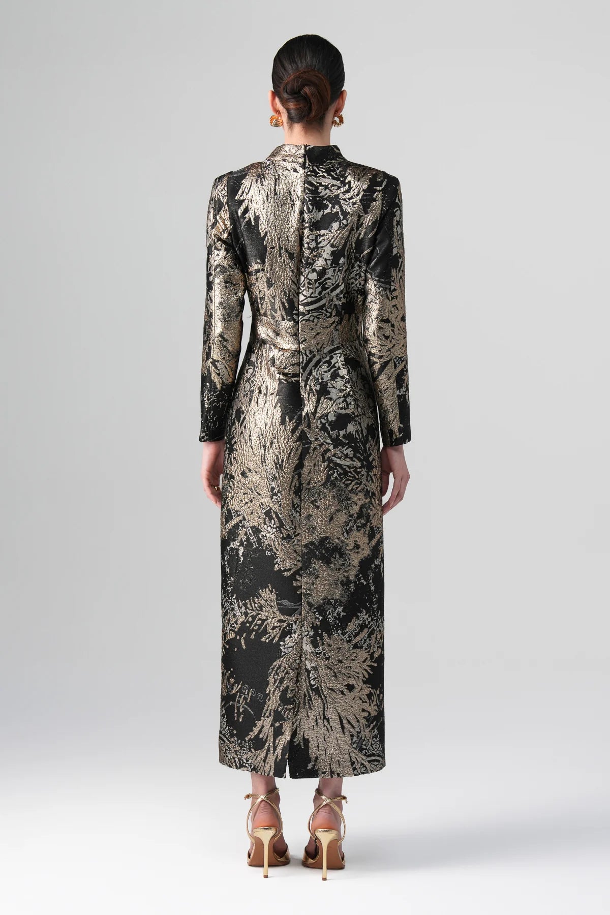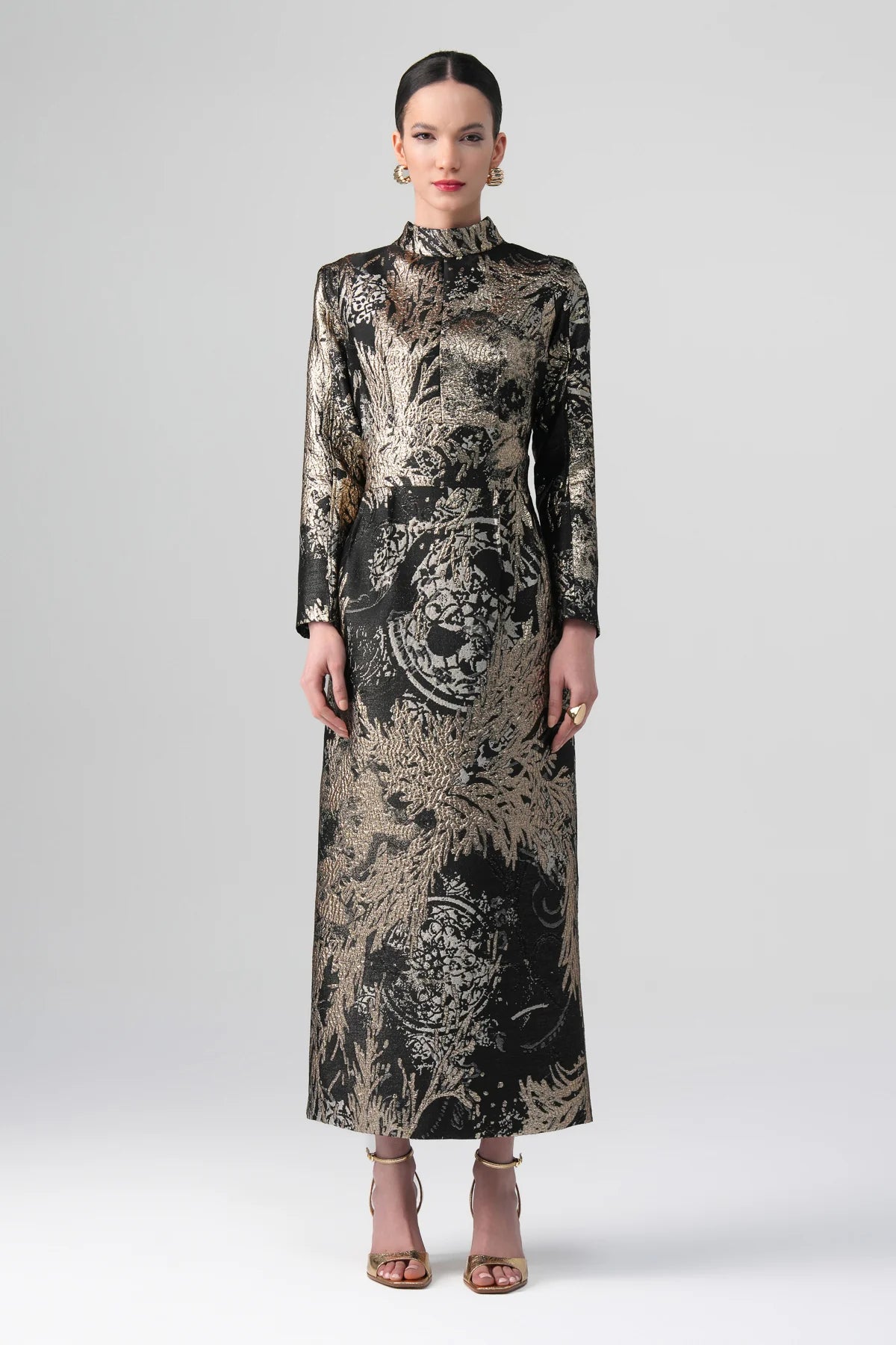 A statement piece defined by its rich jacquard texture and structured silhouette. The intricate pattern adds depth and visual complexity, while the clean cut maintains a refined, modern balance. Designed for elevated occasions, this dress delivers a strong yet elegant presence.