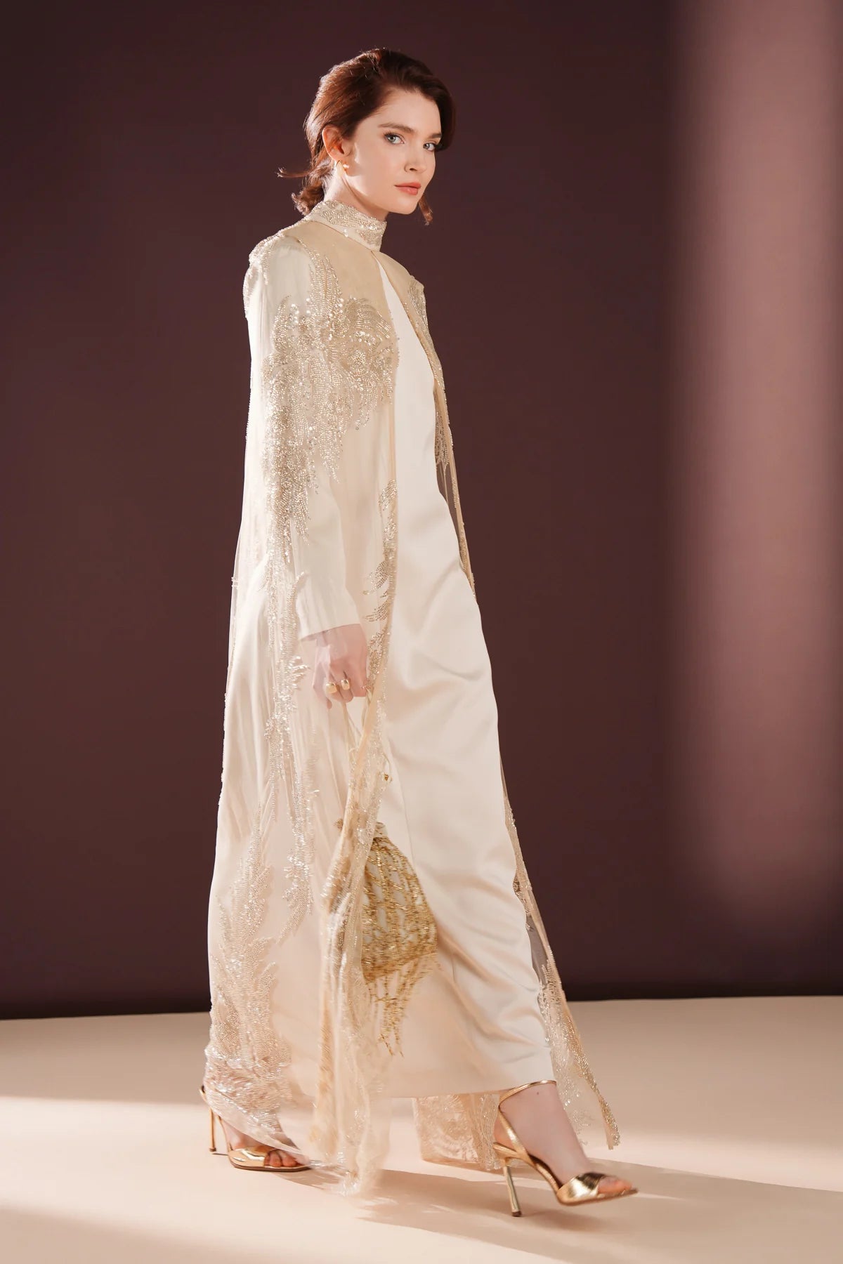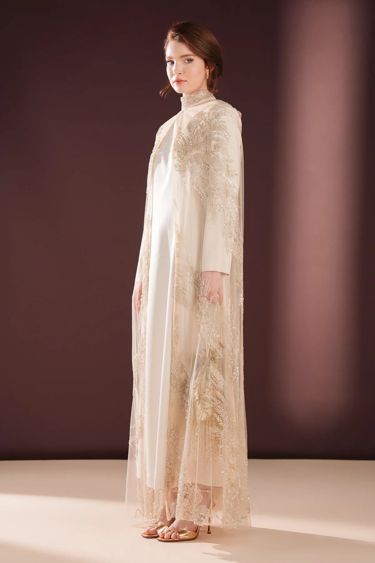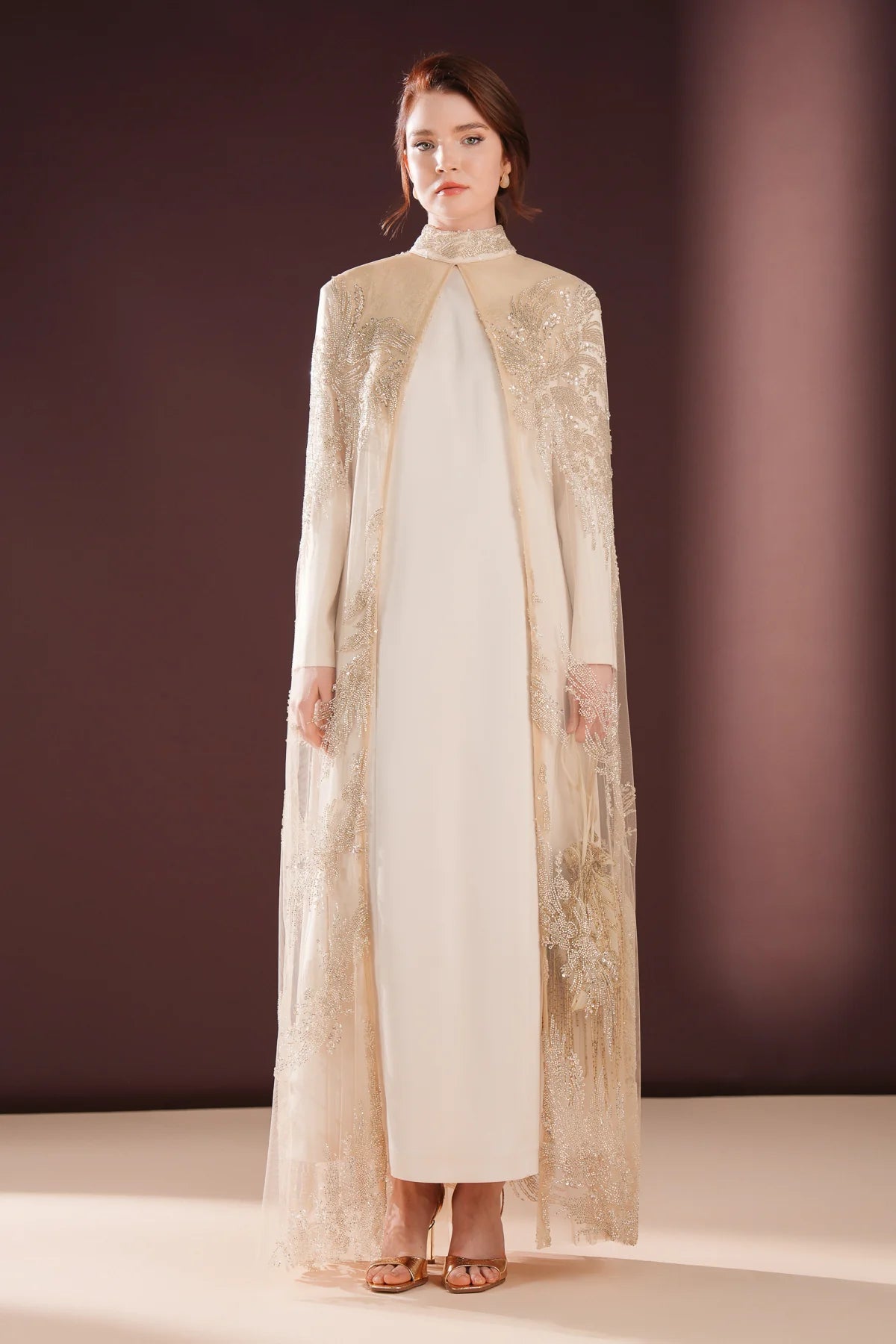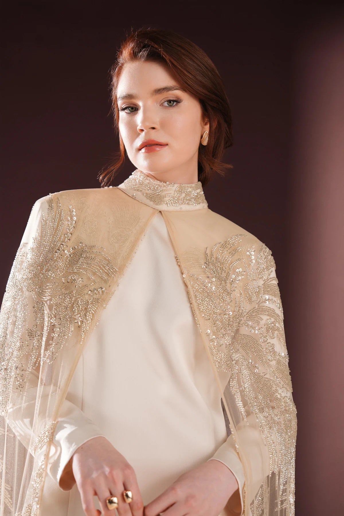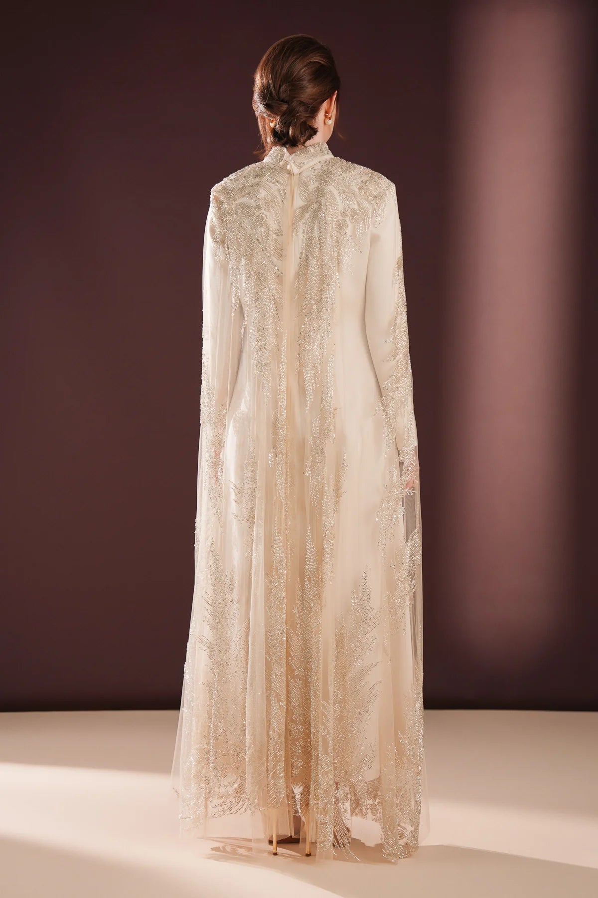 A refined evening silhouette defined by its fluid structure and statement cape overlay. The design features a sleek inner dress layered with a sheer, intricately embellished cape that drapes gracefully, creating movement and dimension. Delicate stone detailing enhances the elevated, couture-inspired finish, making it ideal for formal occasions.