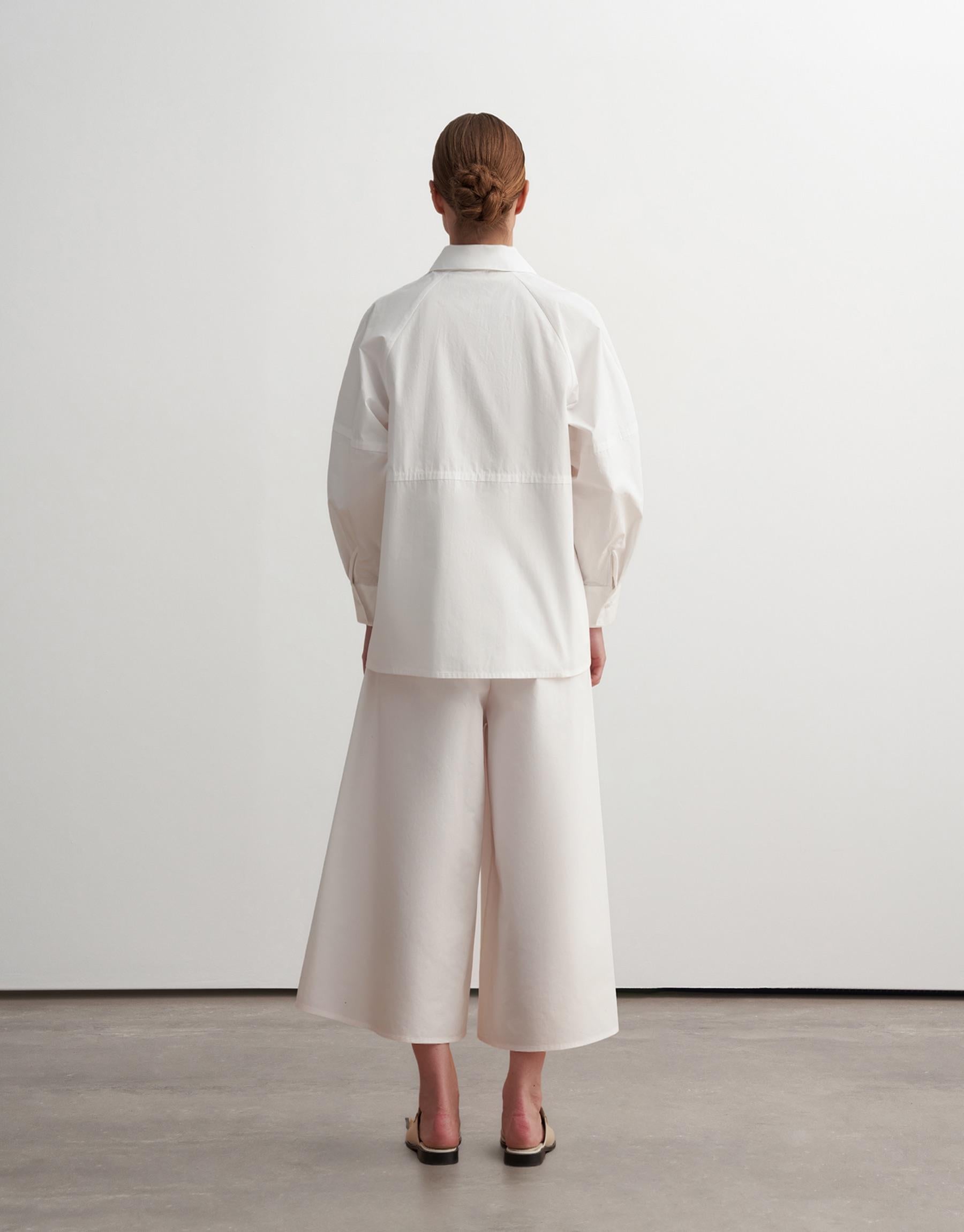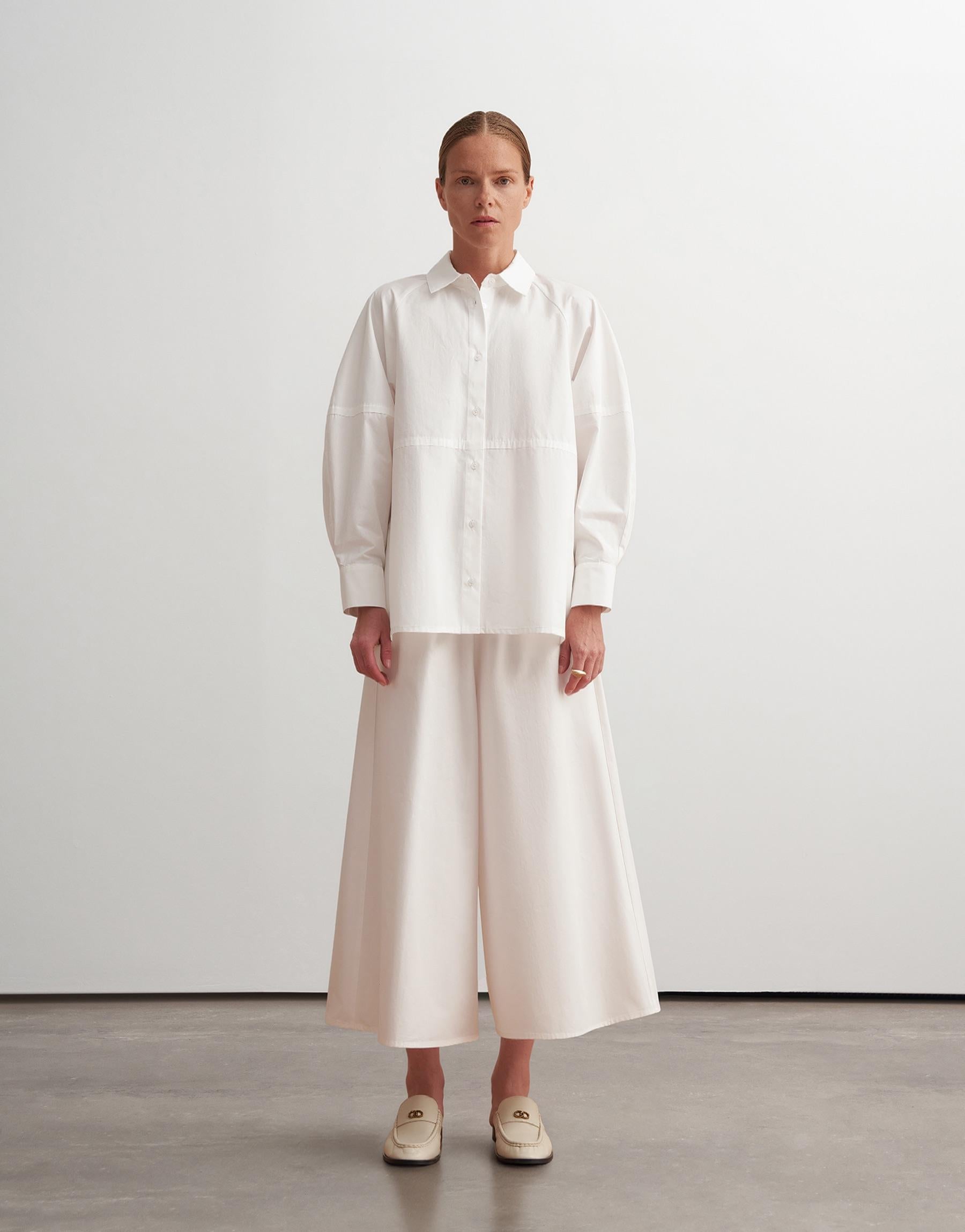 This contemporary cotton shirt is defined by its architectural silhouette and soft volume. Designed with raglan balloon sleeves and a clean front closure, it features a distinctive panel construction that adds subtle structure while maintaining a fluid, relaxed drape. Wide cuffs and a sharp collar complete the refined, modern look.