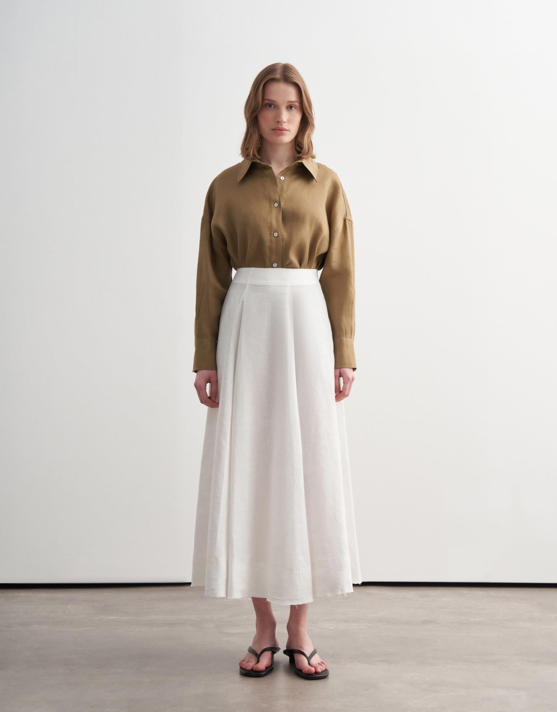 A refined composition of structure and movement, this paneled skirt is crafted from premium linen with a naturally breathable texture. The segmented construction enhances volume and flow, while the clean waistband and concealed zip closure maintain a polished silhouette. Subtle raw-edge detailing at the hem adds a modern, understated character.